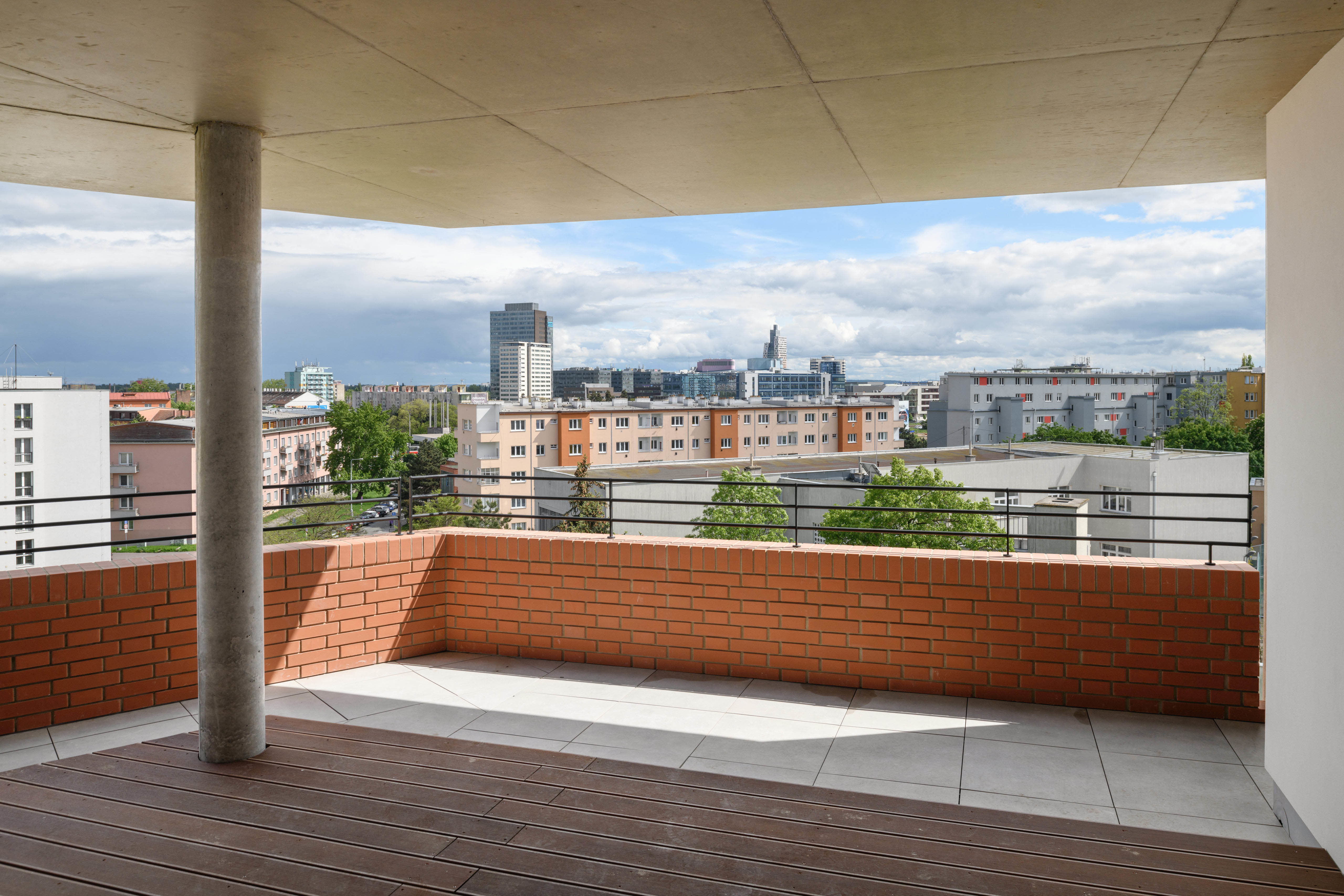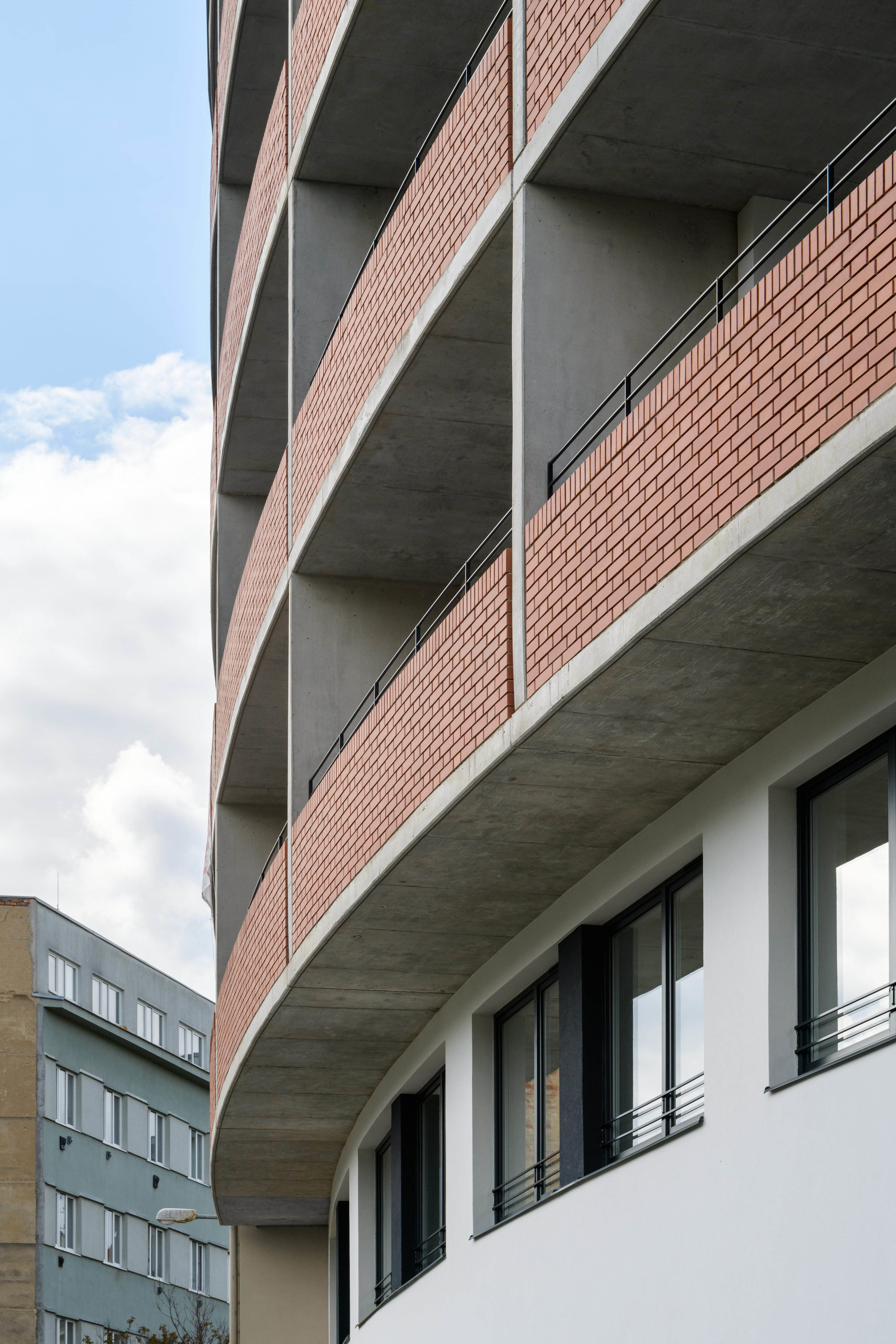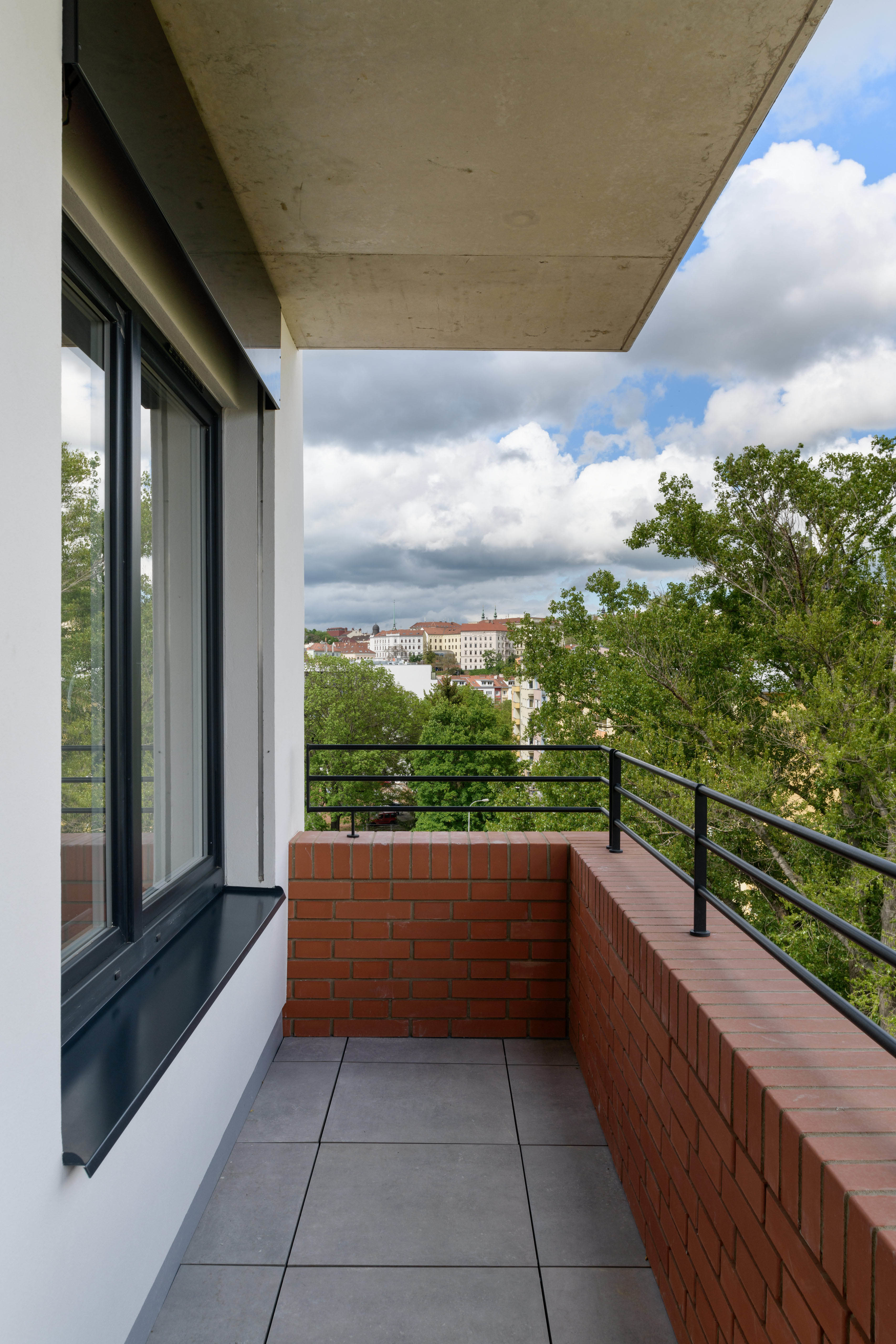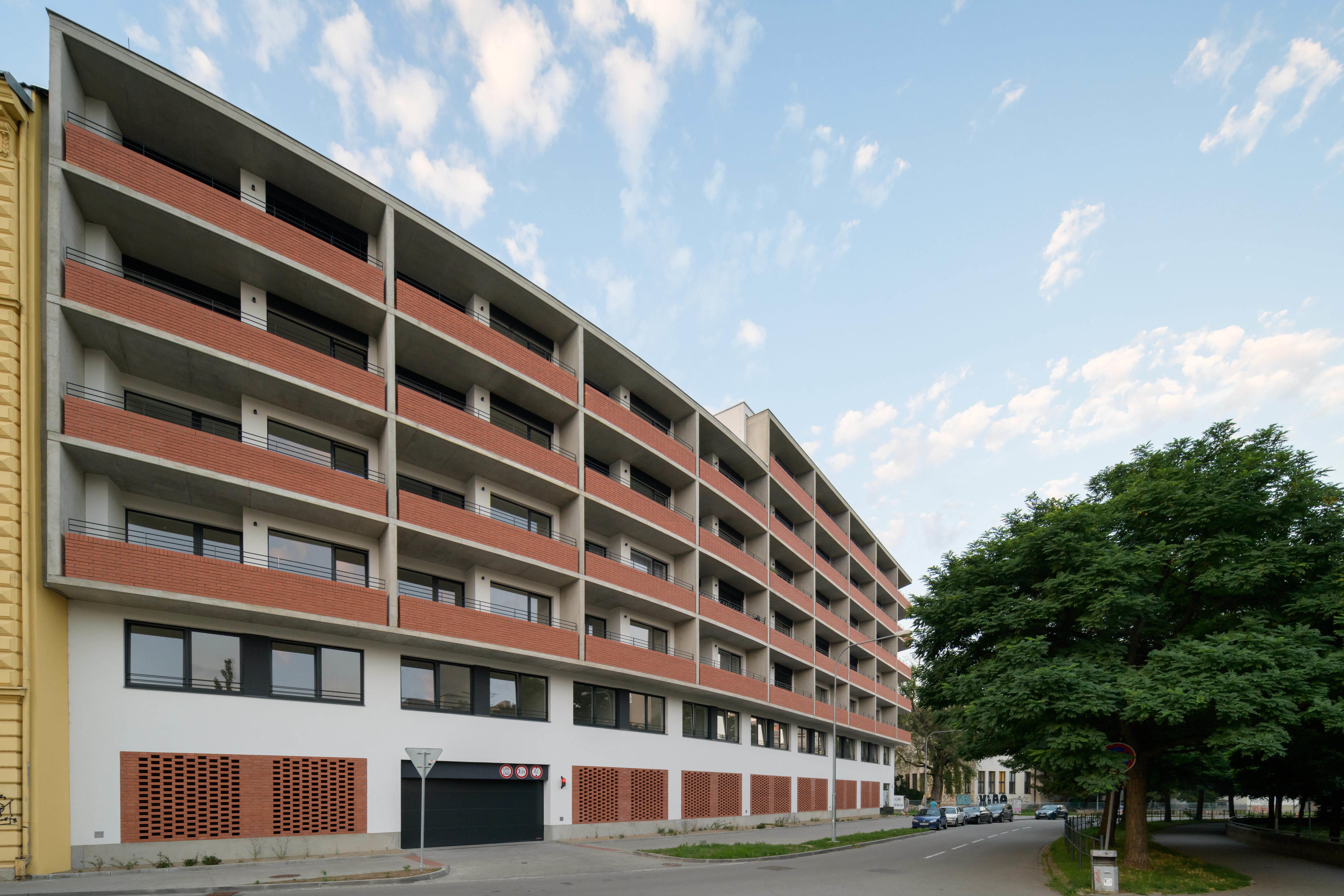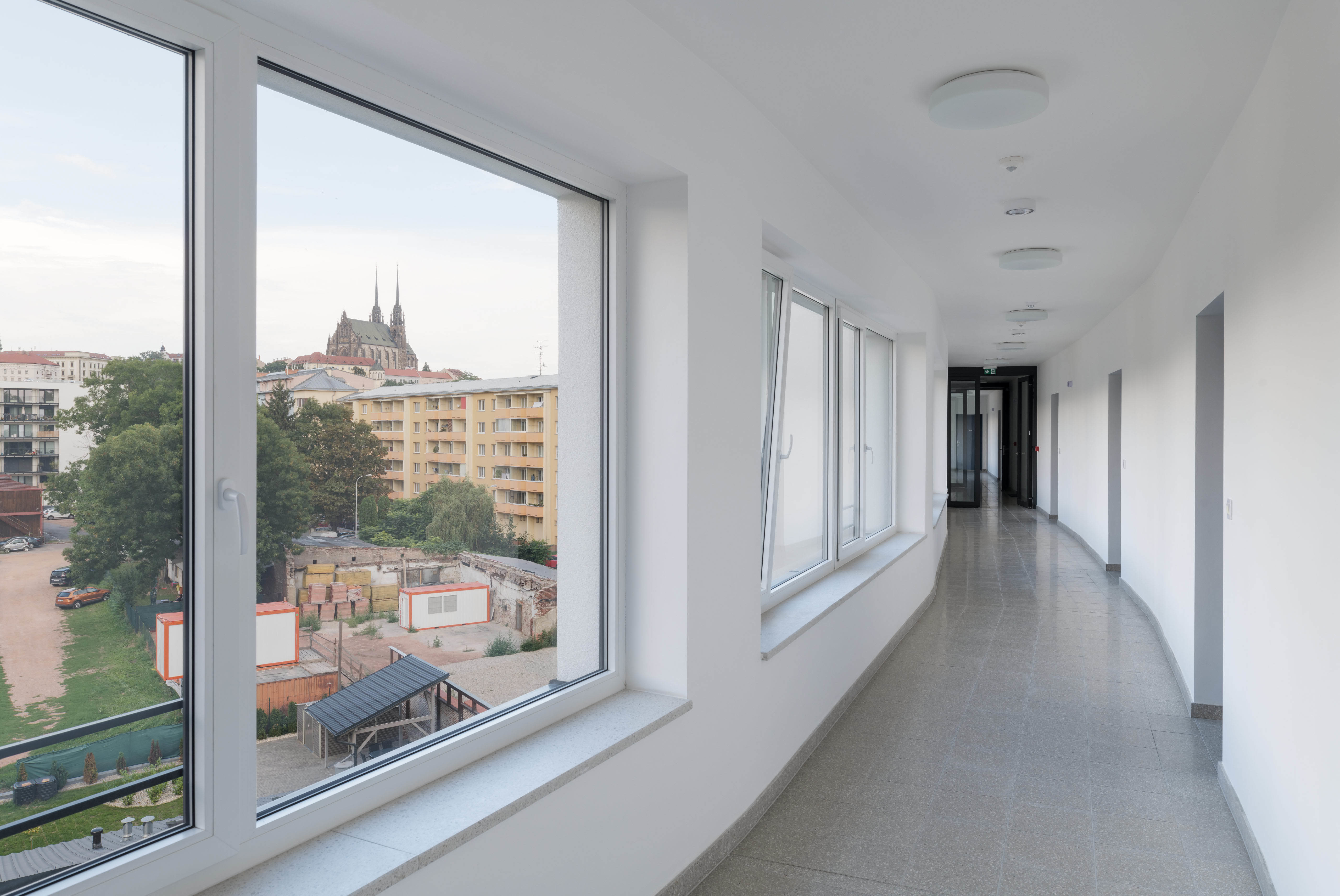 Prízemie a suterén sedempodlažného domu vyhradili architekti pre parkovanie. Ustúpené najvyššie poschodie vytvára priestor pre rozľahlé mezonetové byty, orientované na juhovýchod - smerom do nárožia ulíc Leitnerova - Křídlovická. Bytové jednotky na druhom nadzemnom podlaží rozširujú súkromné terasy v pokojnom vnútrobloku.