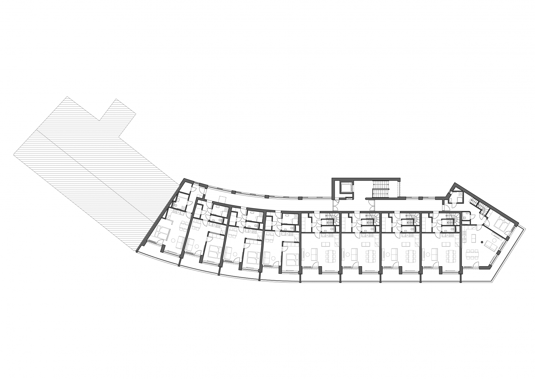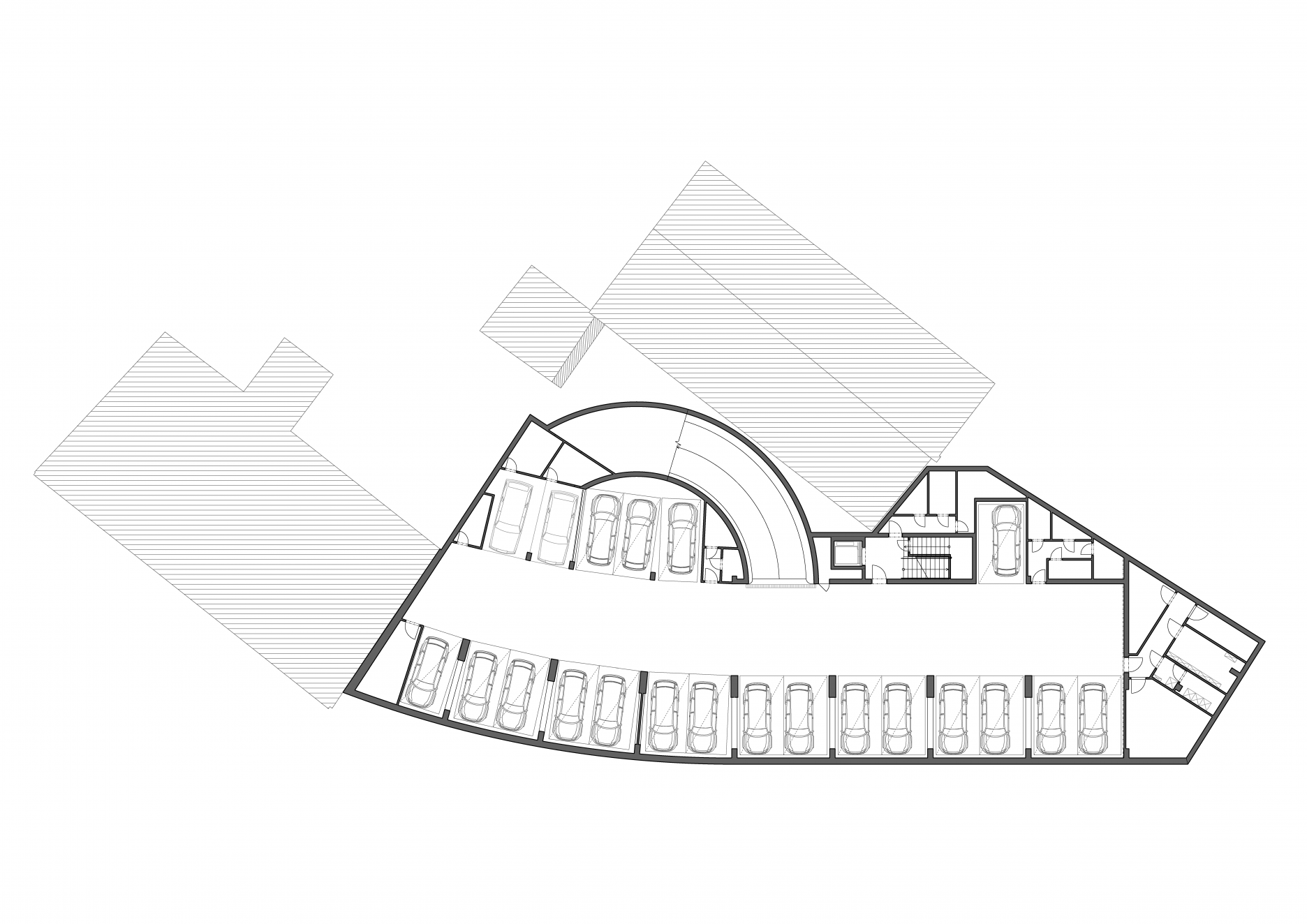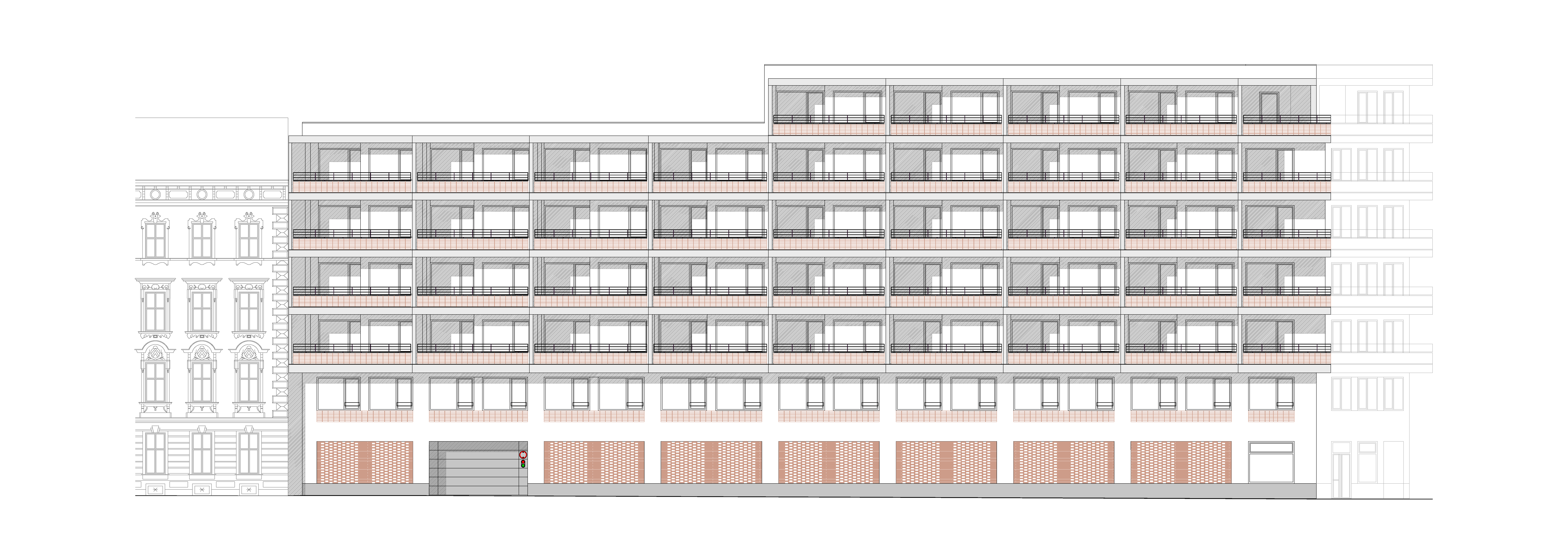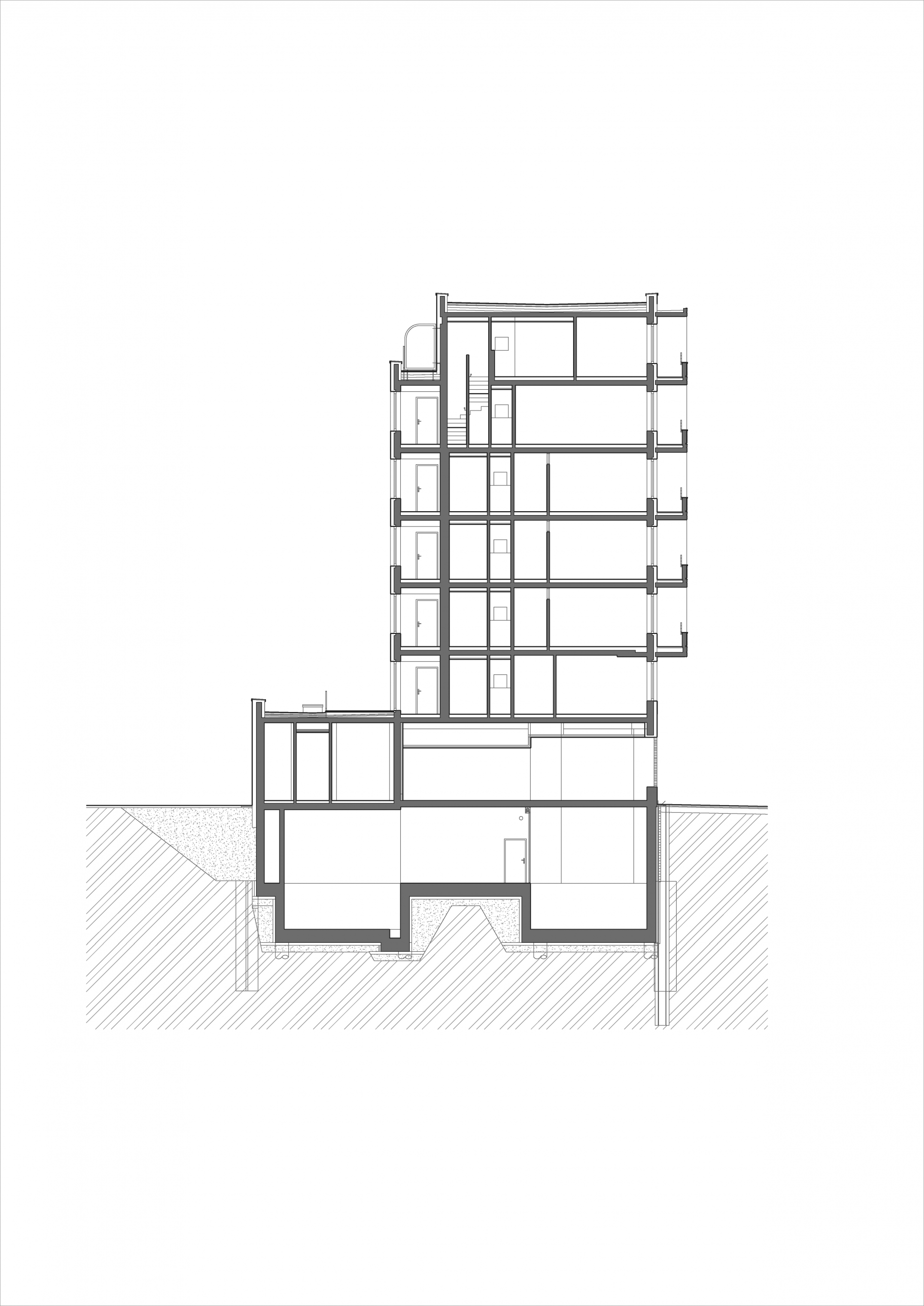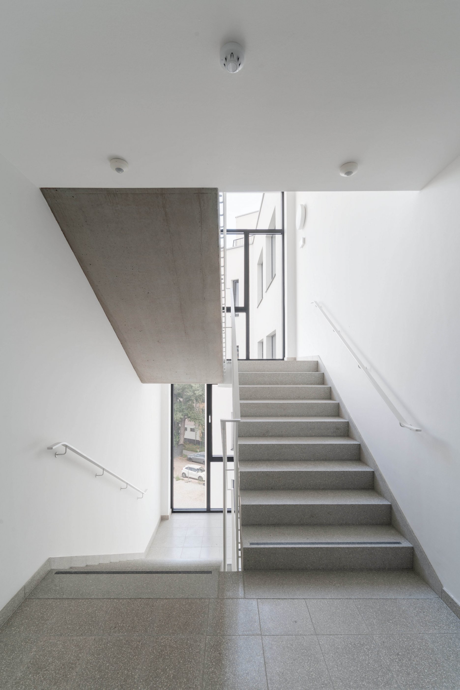 Prízemie a suterén sedempodlažného domu vyhradili architekti pre parkovanie. Ustúpené najvyššie poschodie vytvára priestor pre rozľahlé mezonetové byty, orientované na juhovýchod - smerom do nárožia ulíc Leitnerova - Křídlovická. Bytové jednotky na druhom nadzemnom podlaží rozširujú súkromné terasy v pokojnom vnútrobloku.