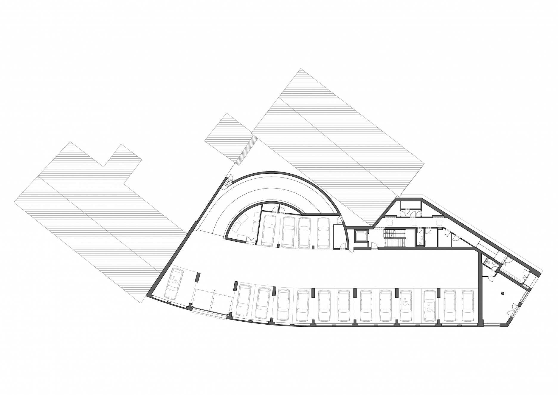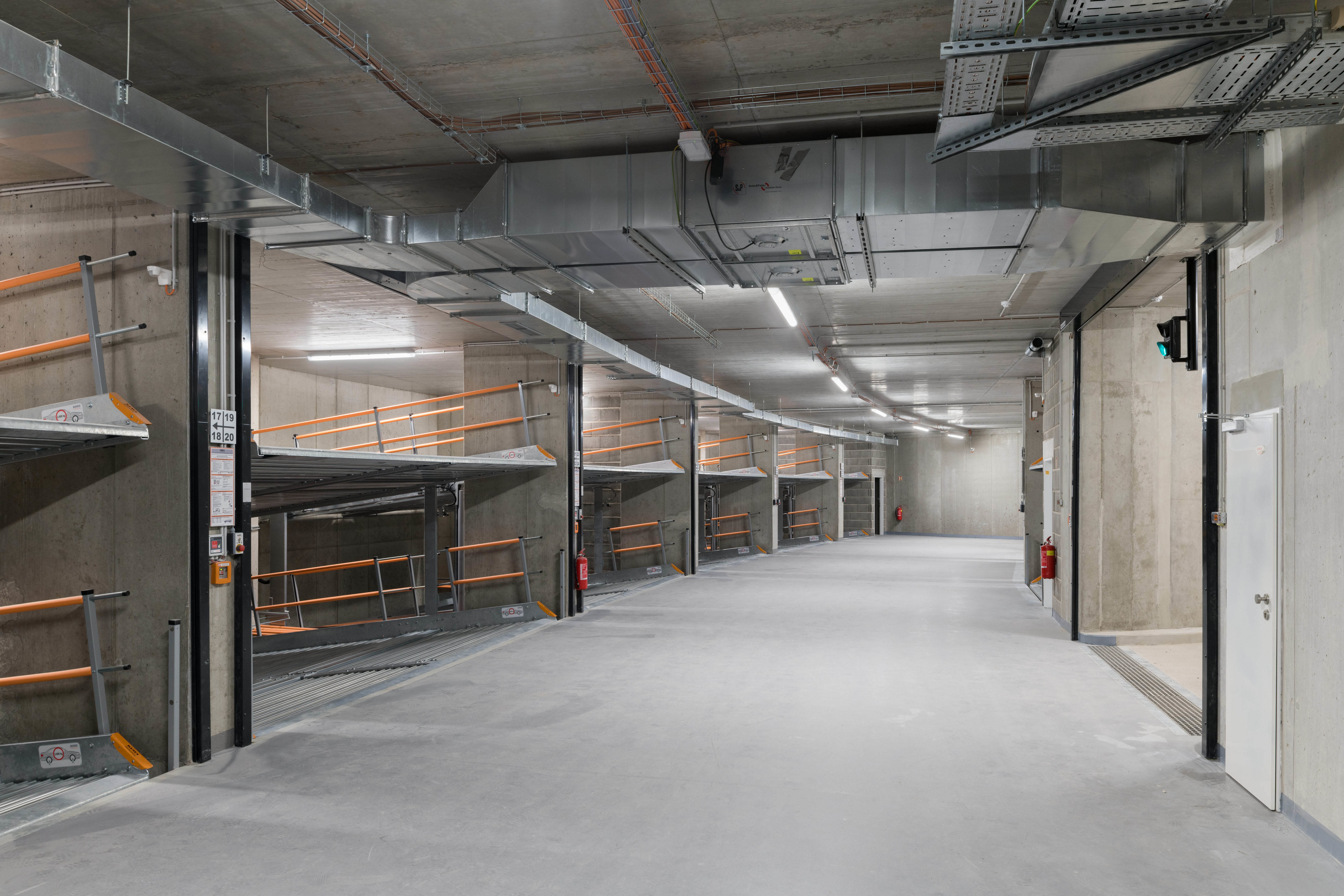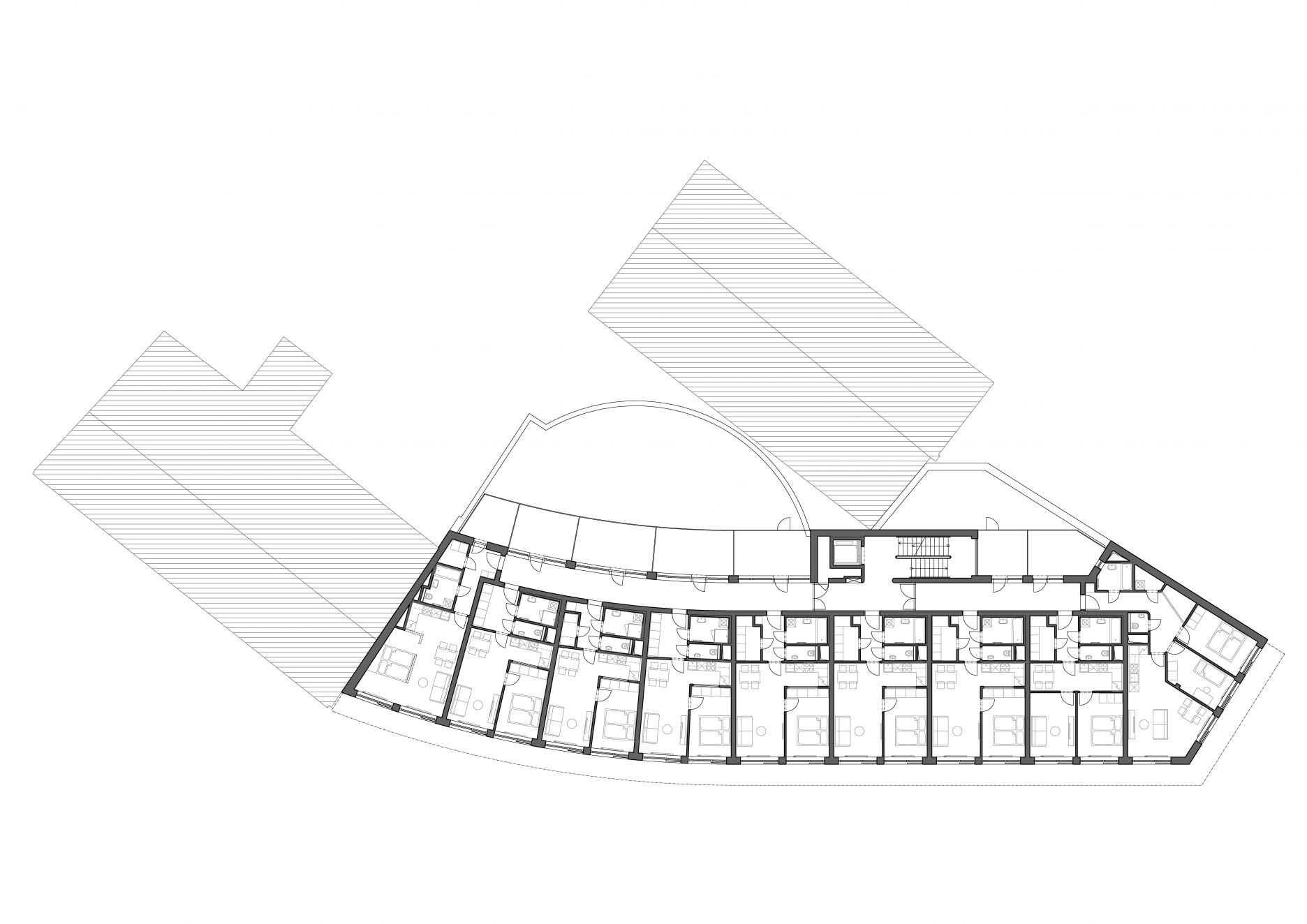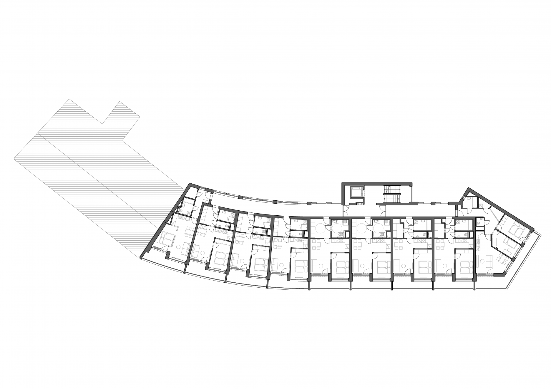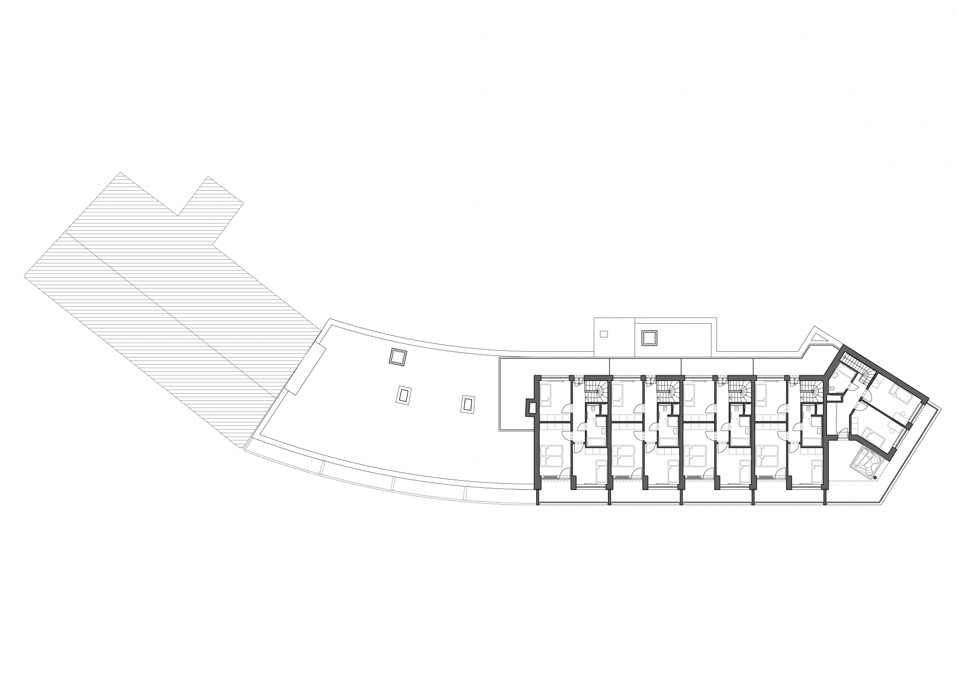 Prízemie a suterén sedempodlažného domu vyhradili architekti pre parkovanie. Ustúpené najvyššie poschodie vytvára priestor pre rozľahlé mezonetové byty, orientované na juhovýchod - smerom do nárožia ulíc Leitnerova - Křídlovická. Bytové jednotky na druhom nadzemnom podlaží rozširujú súkromné terasy v pokojnom vnútrobloku.