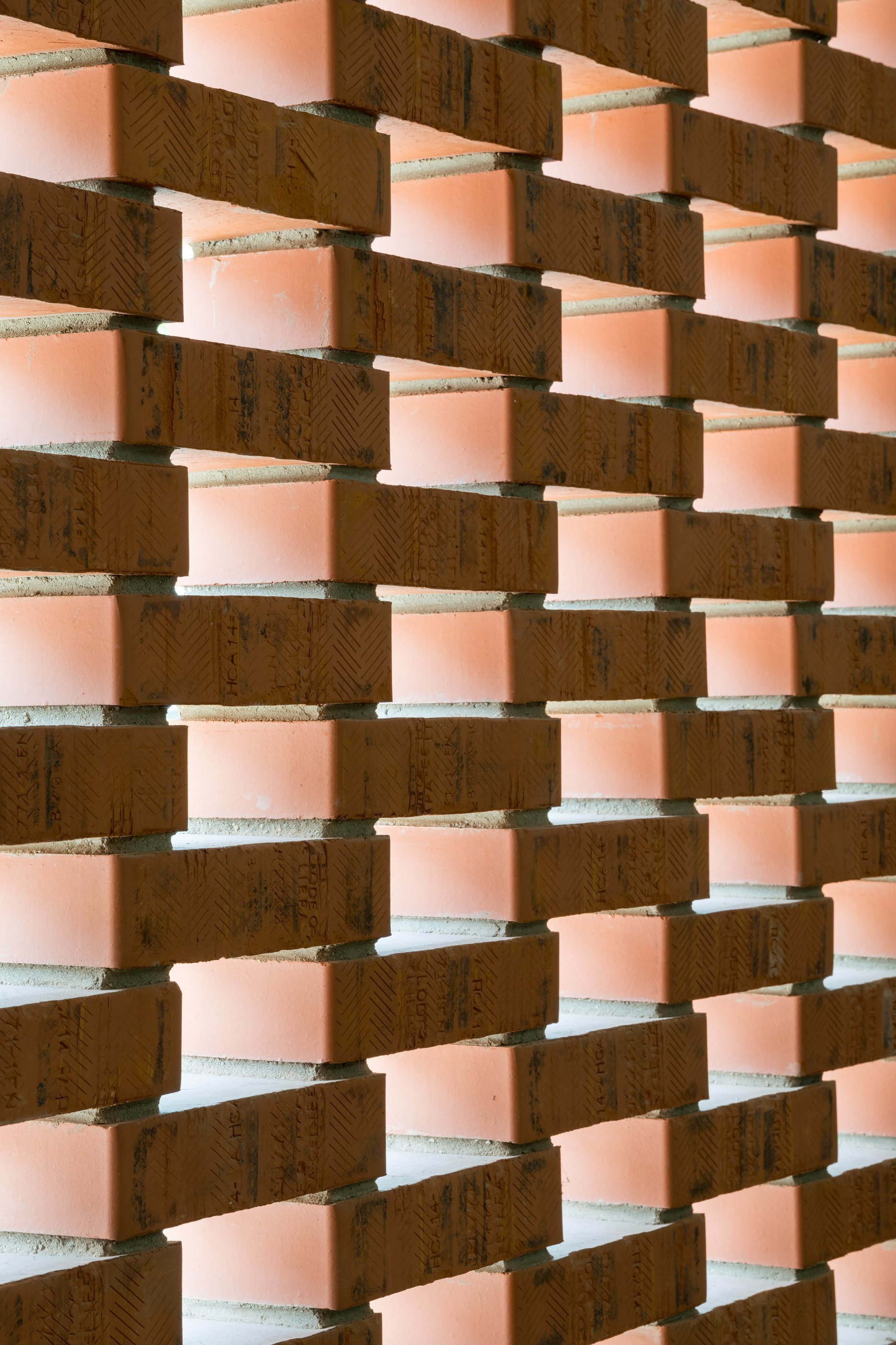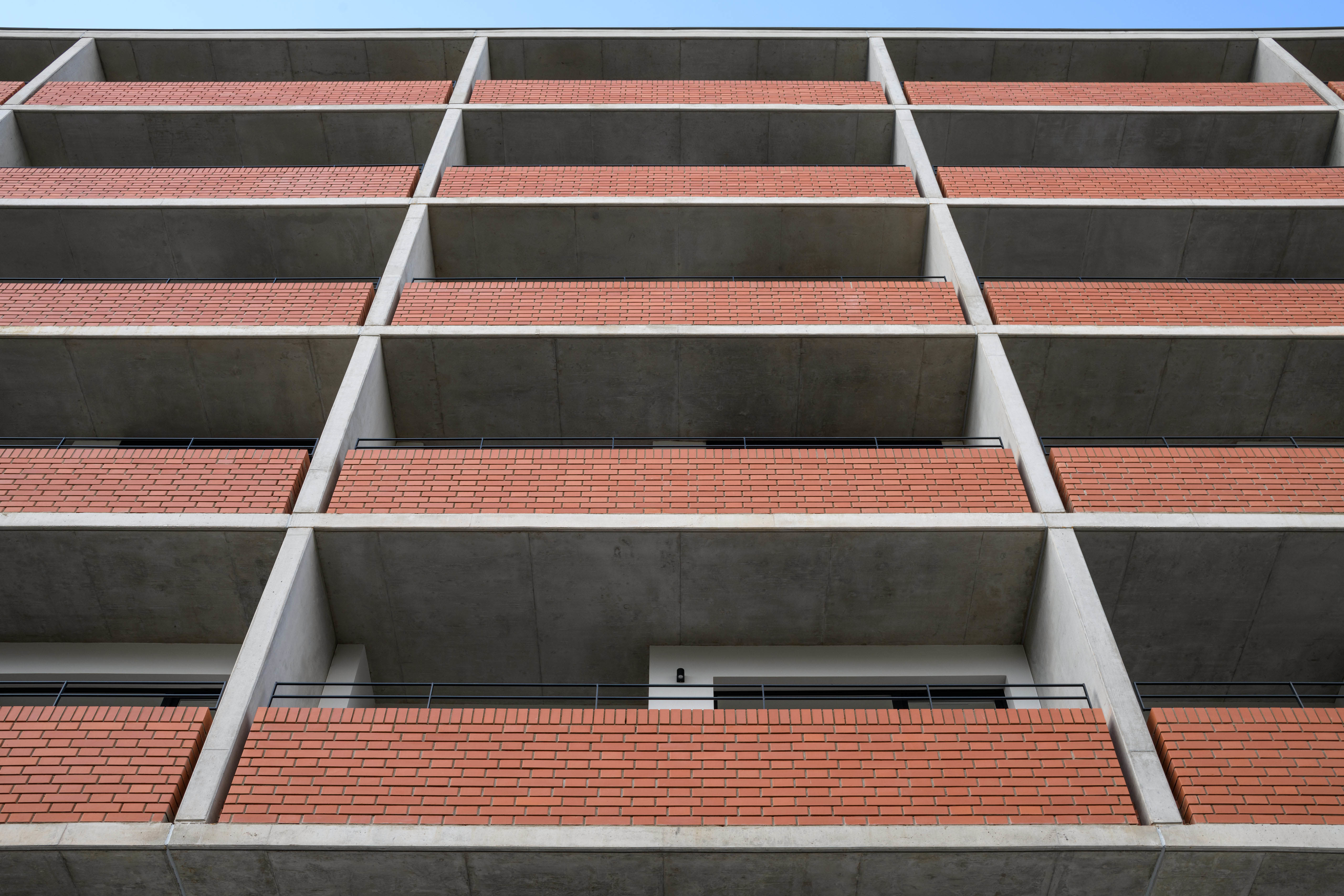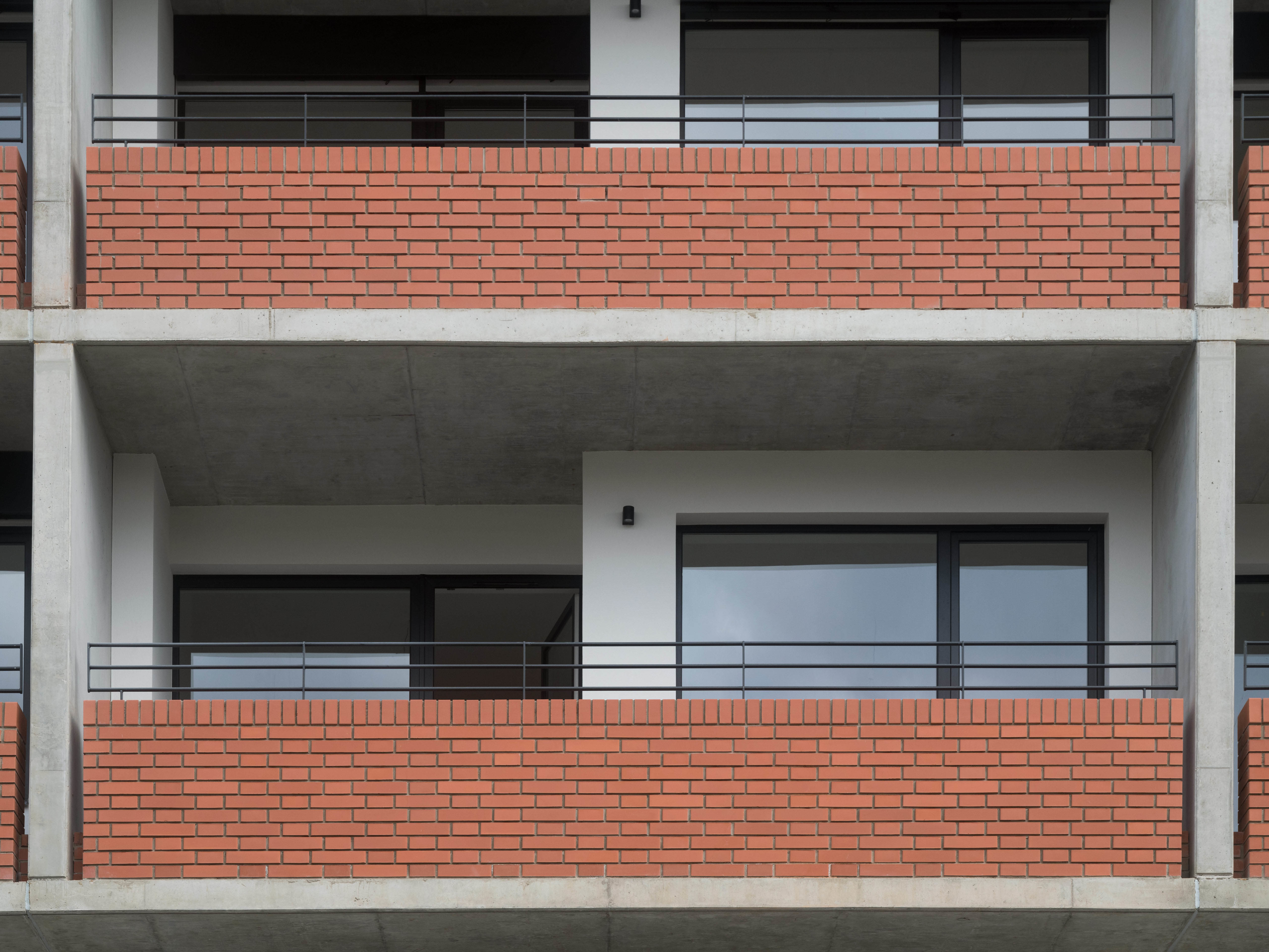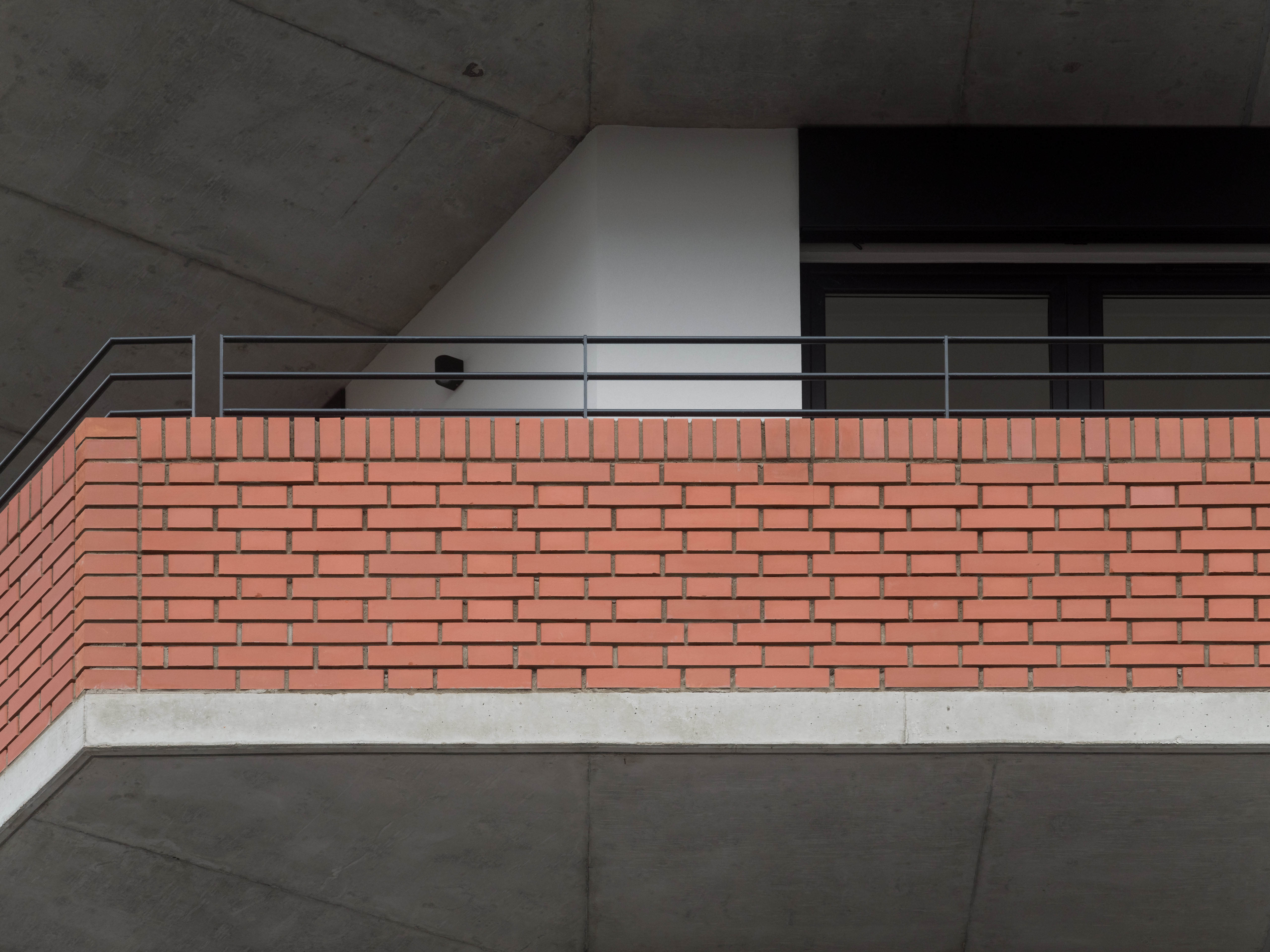 Fasáda, tvorená pravidelným rastrom betónových lodžií kopíruje mierny oblúk uličnej čiary. Horizontálne členenie fasády a linearitu domu podčiarkujú zábradlia vymurované z plných tehál. V kontakte s ulicou siahli architekti po trvácnych materiáloch. Čierny leštený žulový sokel dopĺňajú travertínové dosky, použité ako obklad vstupných priestorov objektu.
