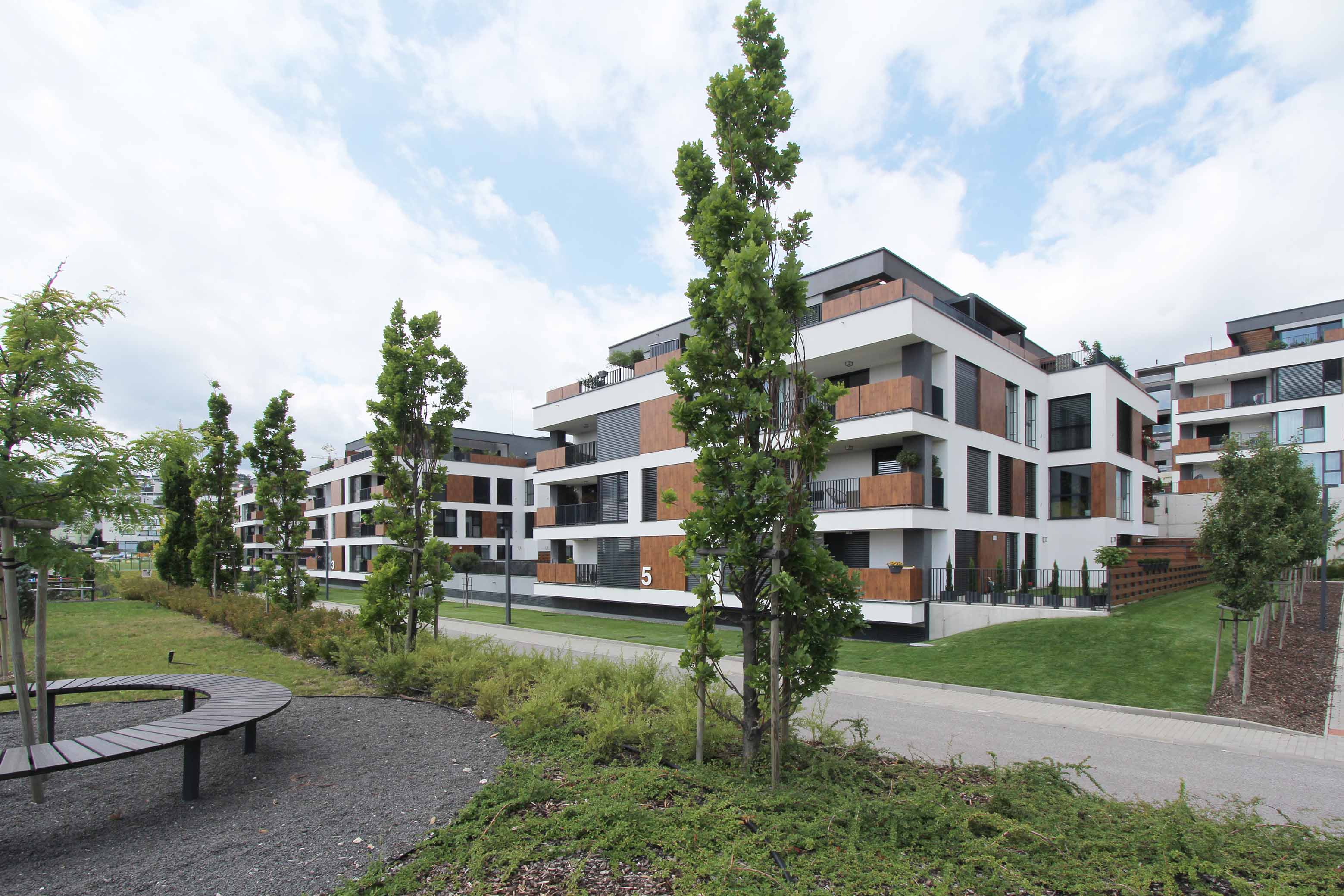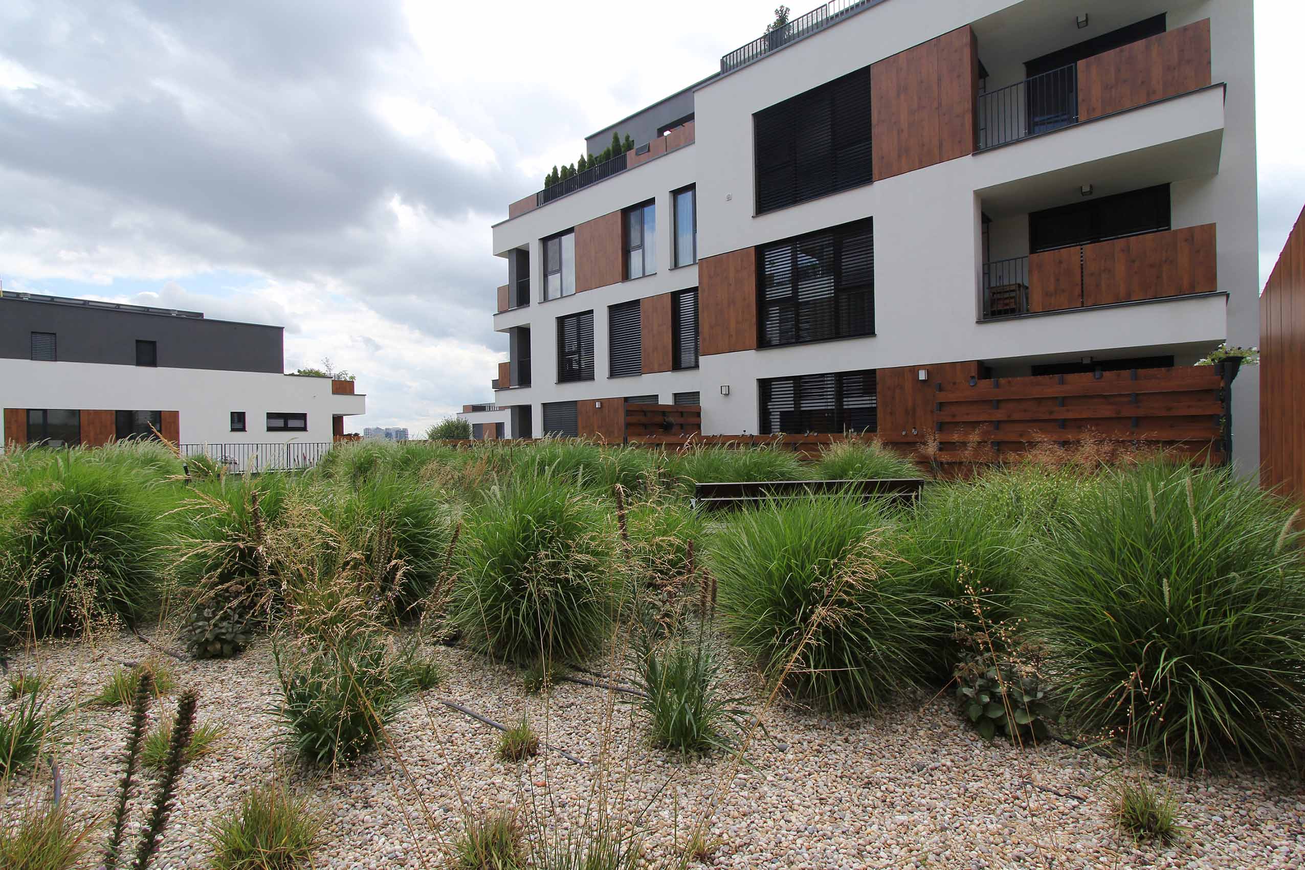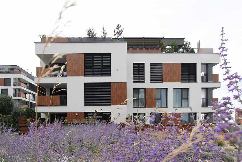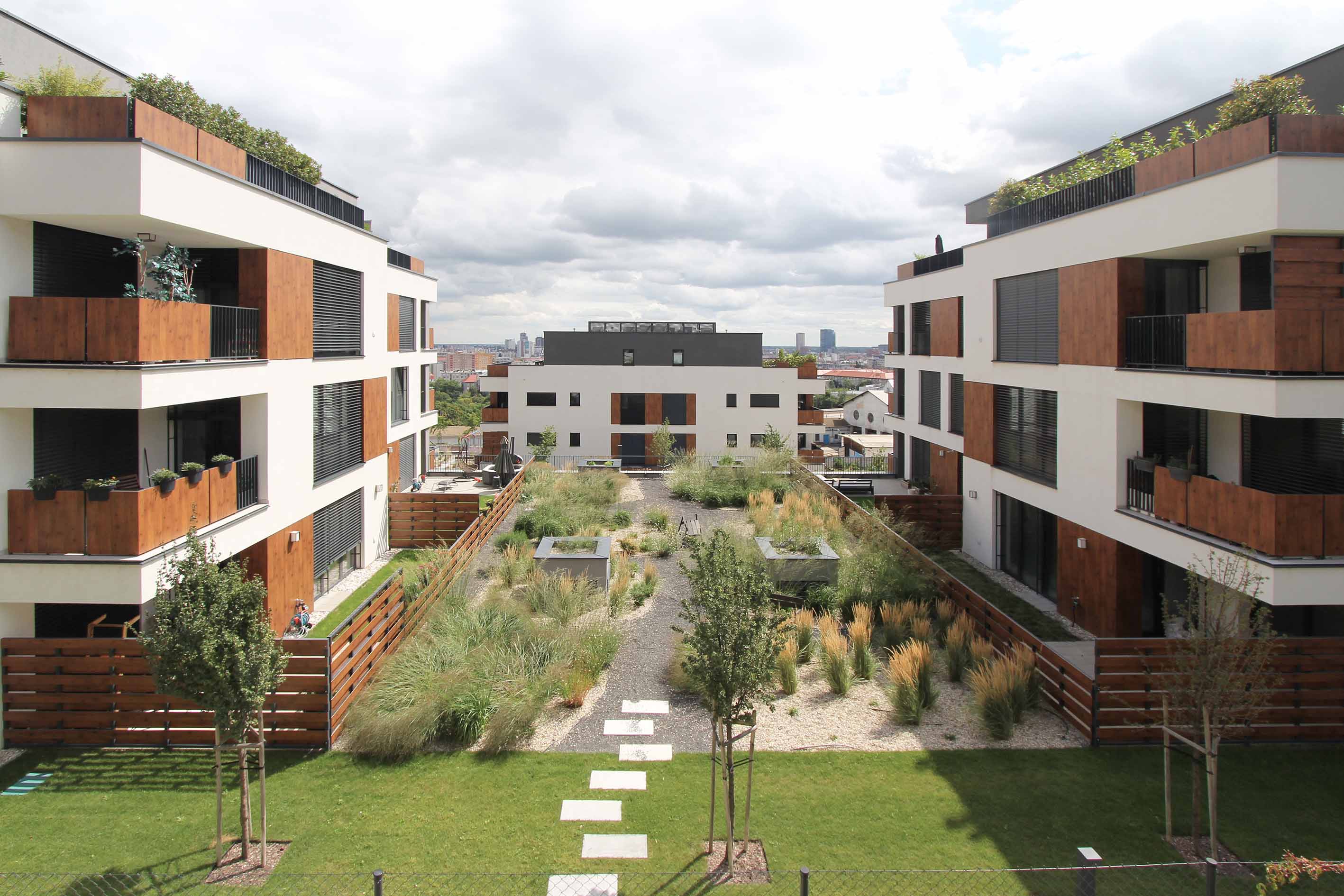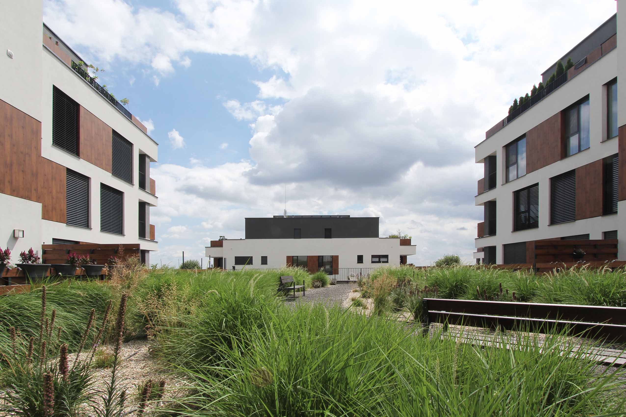 Strechy suterénov sú navrhnuté ako zelené, zatrávnené plochy. Každá z nich po rozkvitnutí extenzívnej zelene bude mať inú farbu a tvar. Budovy sú ukončené bielou štruktúrovanou omietkou, kombinovanou s obkladovými plochami Fundermax.