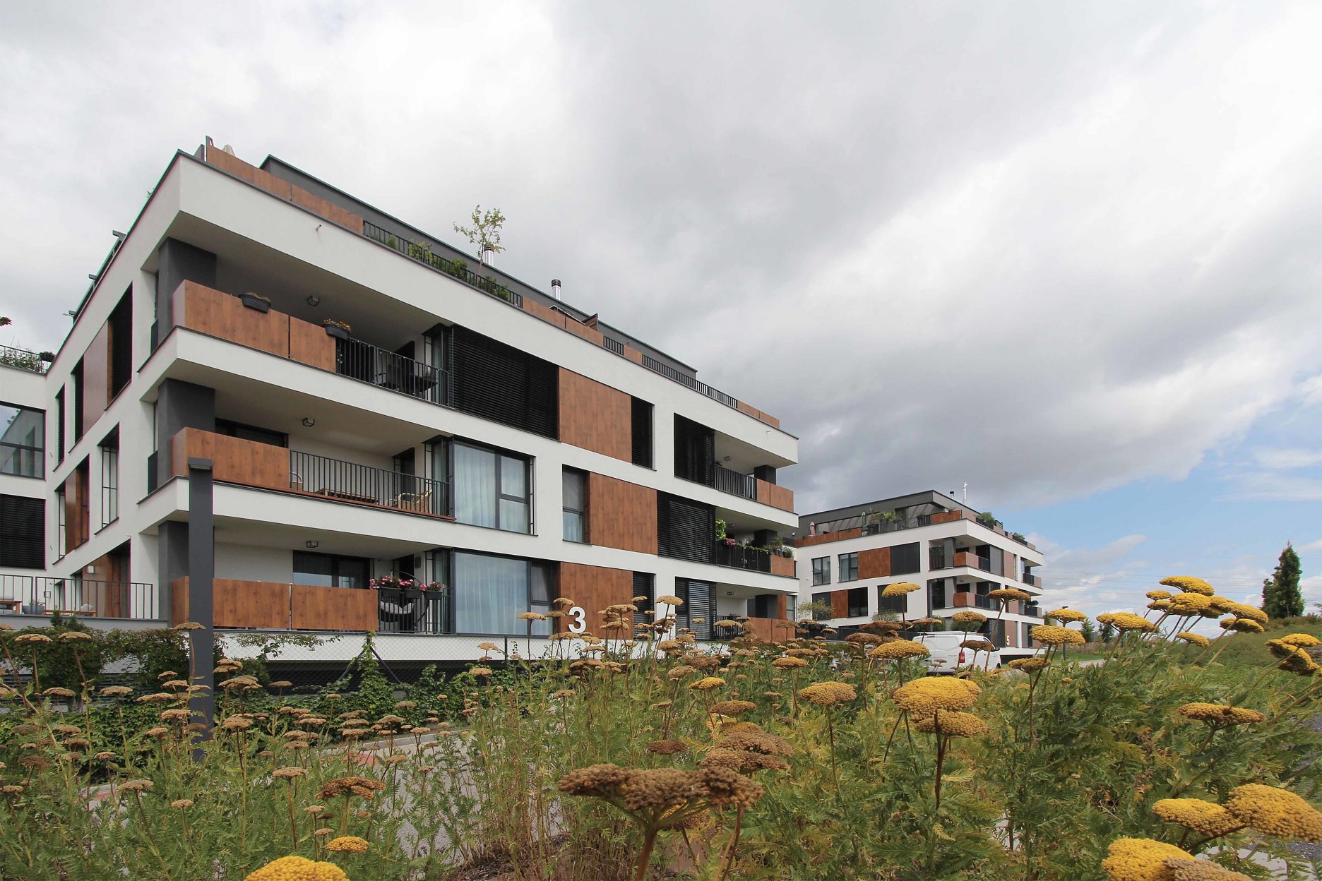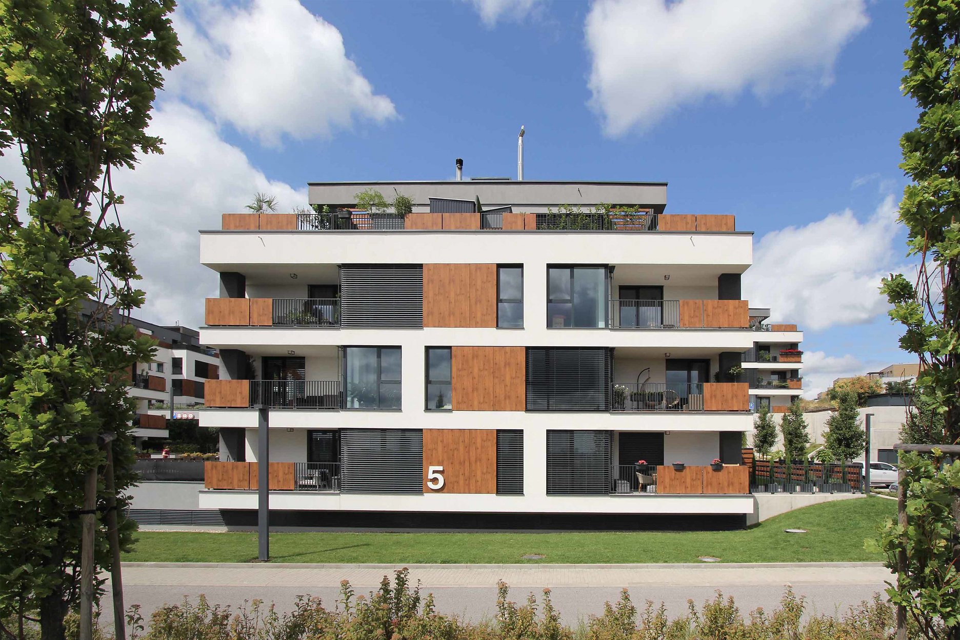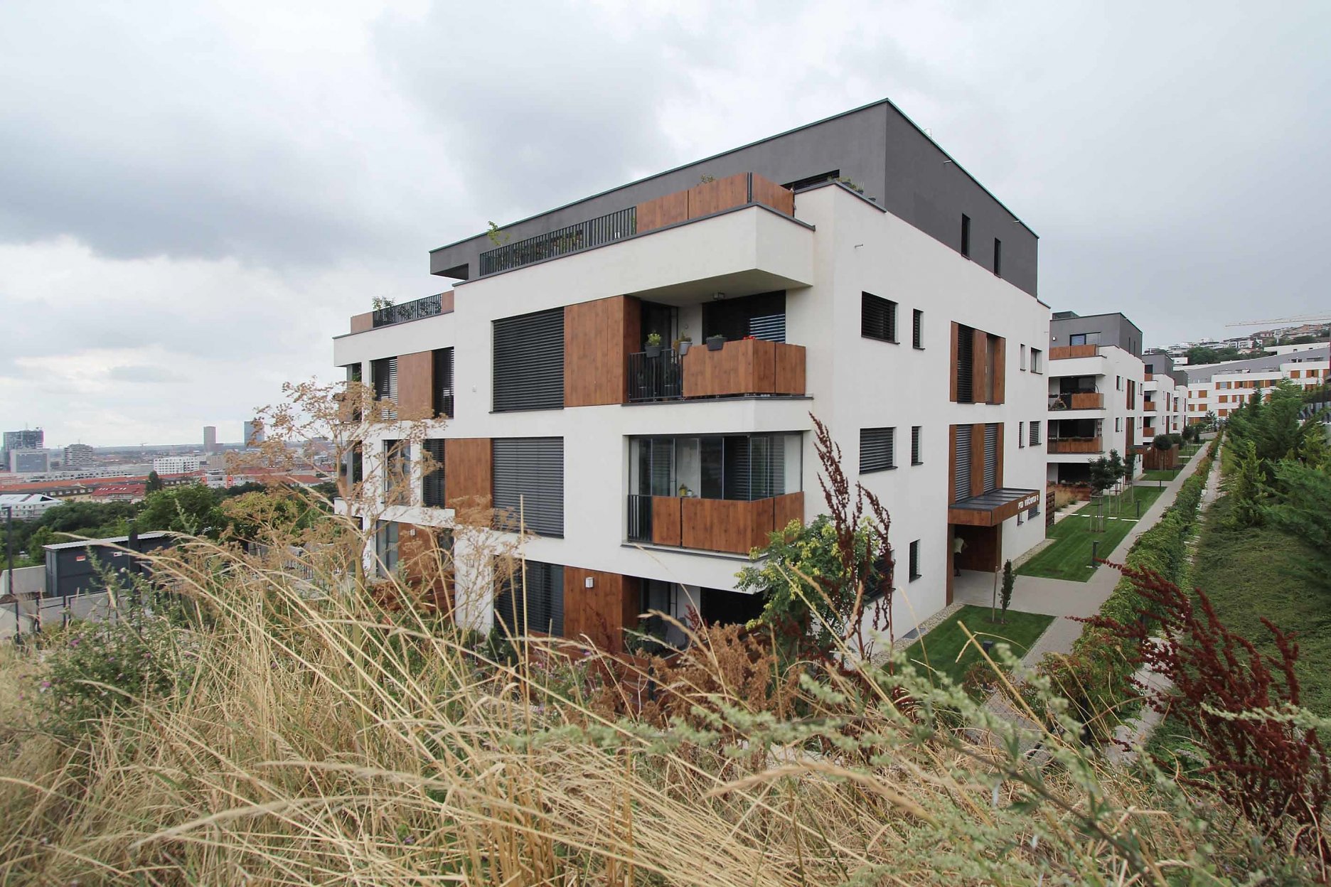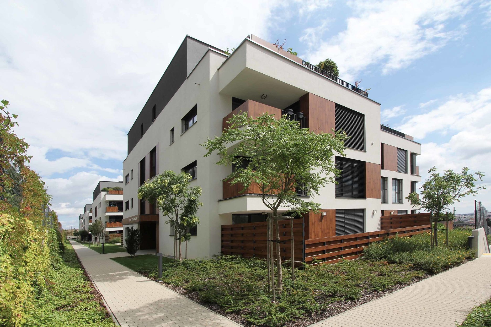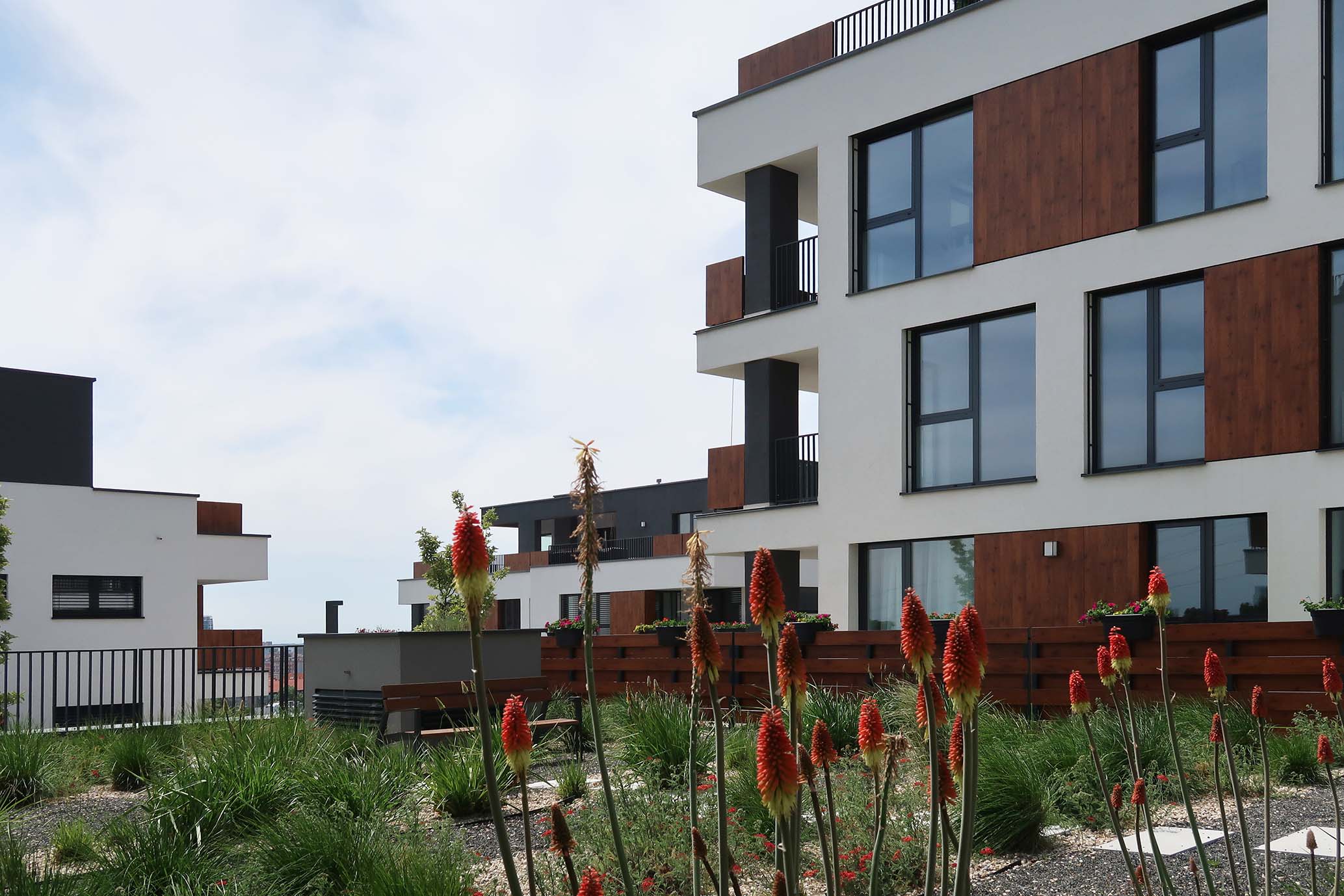Strechy suterénov sú navrhnuté ako zelené, zatrávnené plochy. Každá z nich po rozkvitnutí extenzívnej zelene bude mať inú farbu a tvar. Budovy sú ukončené bielou štruktúrovanou omietkou, kombinovanou s obkladovými plochami Fundermax.