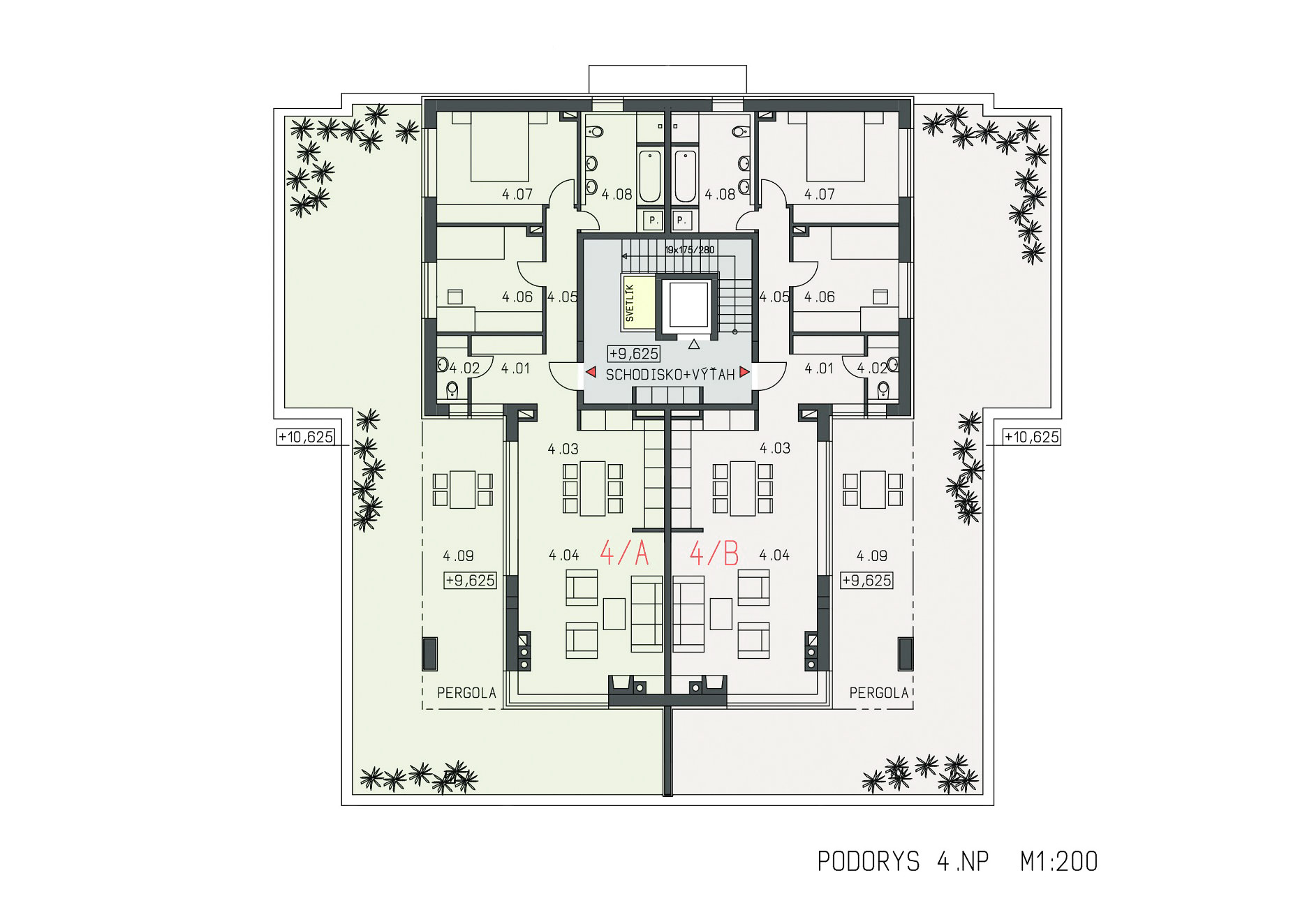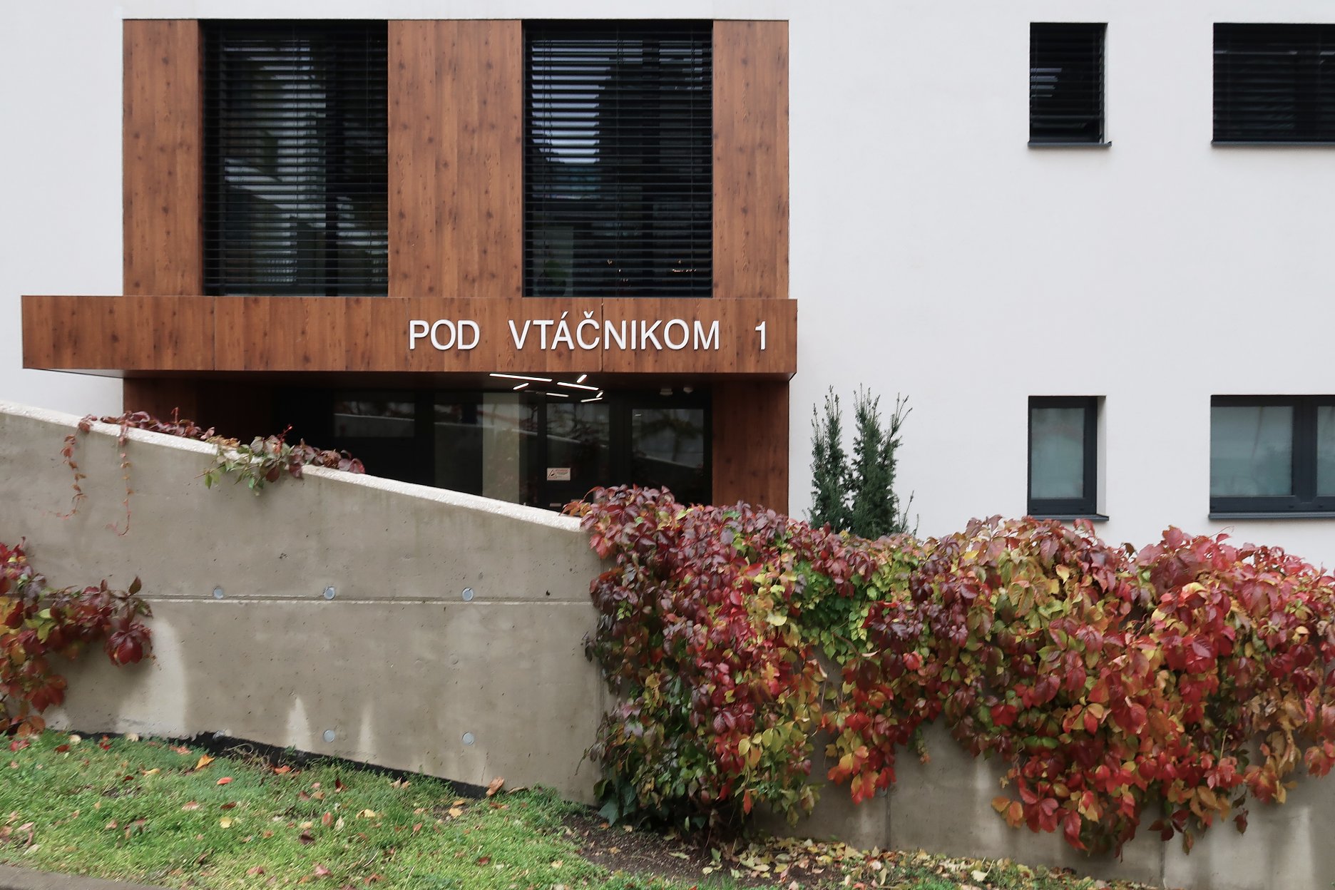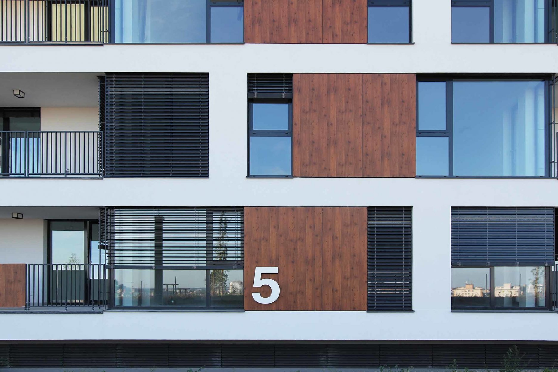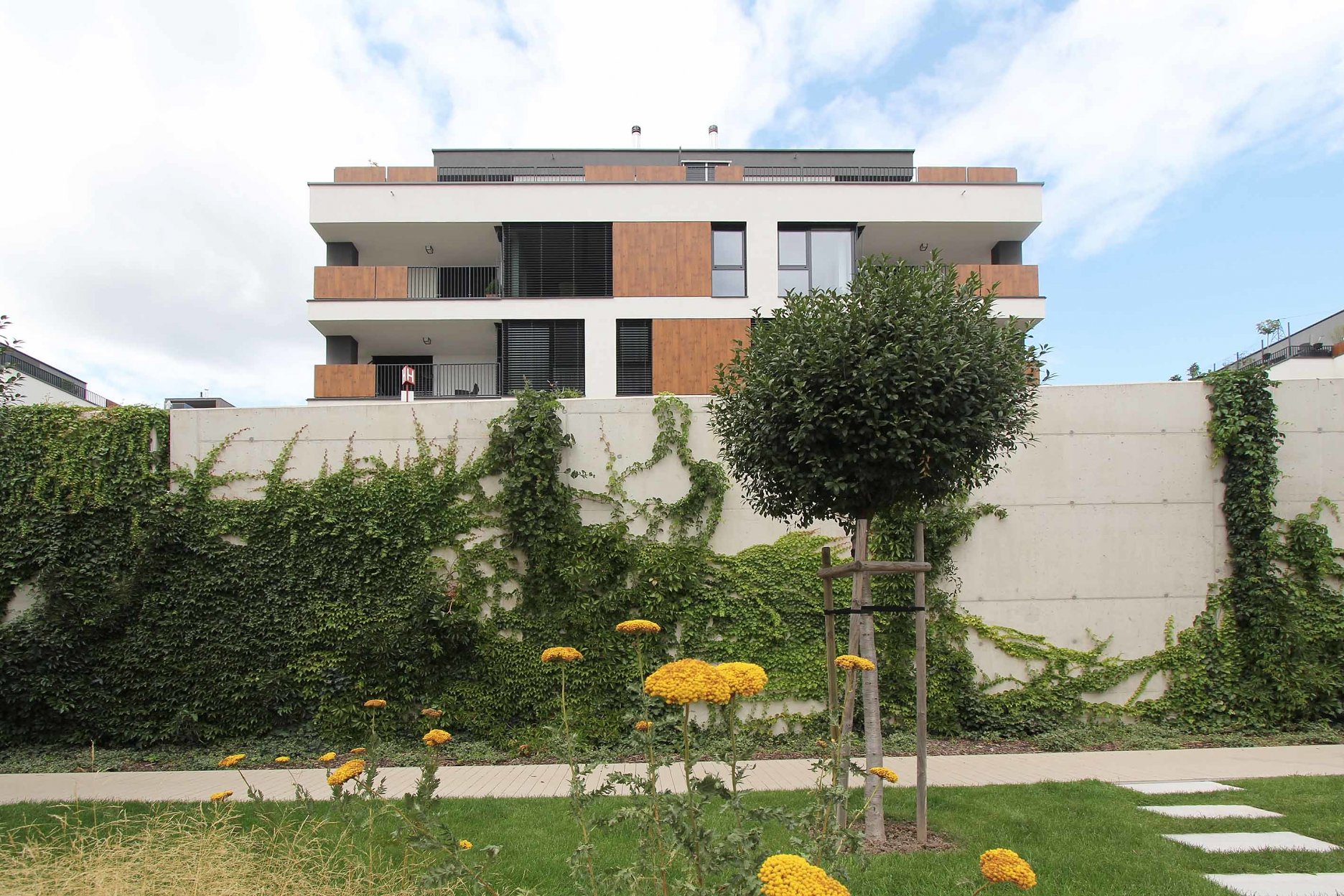 Strechy suterénov sú navrhnuté ako zelené, zatrávnené plochy. Každá z nich po rozkvitnutí extenzívnej zelene bude mať inú farbu a tvar. Budovy sú ukončené bielou štruktúrovanou omietkou, kombinovanou s obkladovými plochami Fundermax.