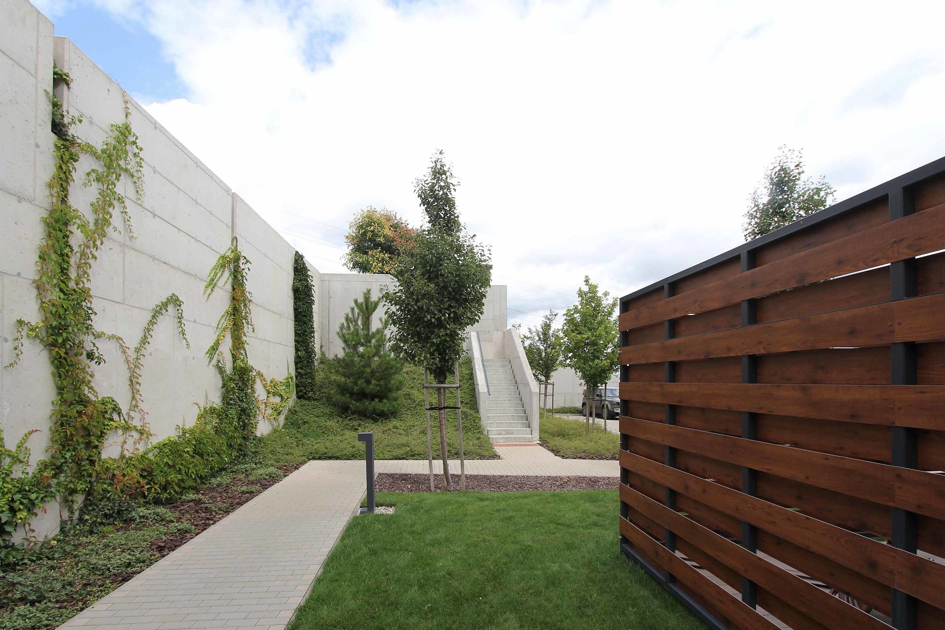 Navrhované oporné múry sú súčasťou spoločných verejných priestorov a budú porastené popínavou zeleňou .