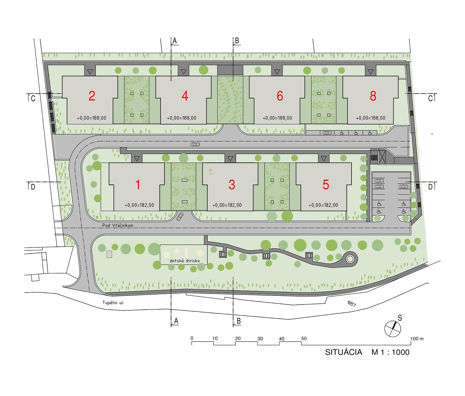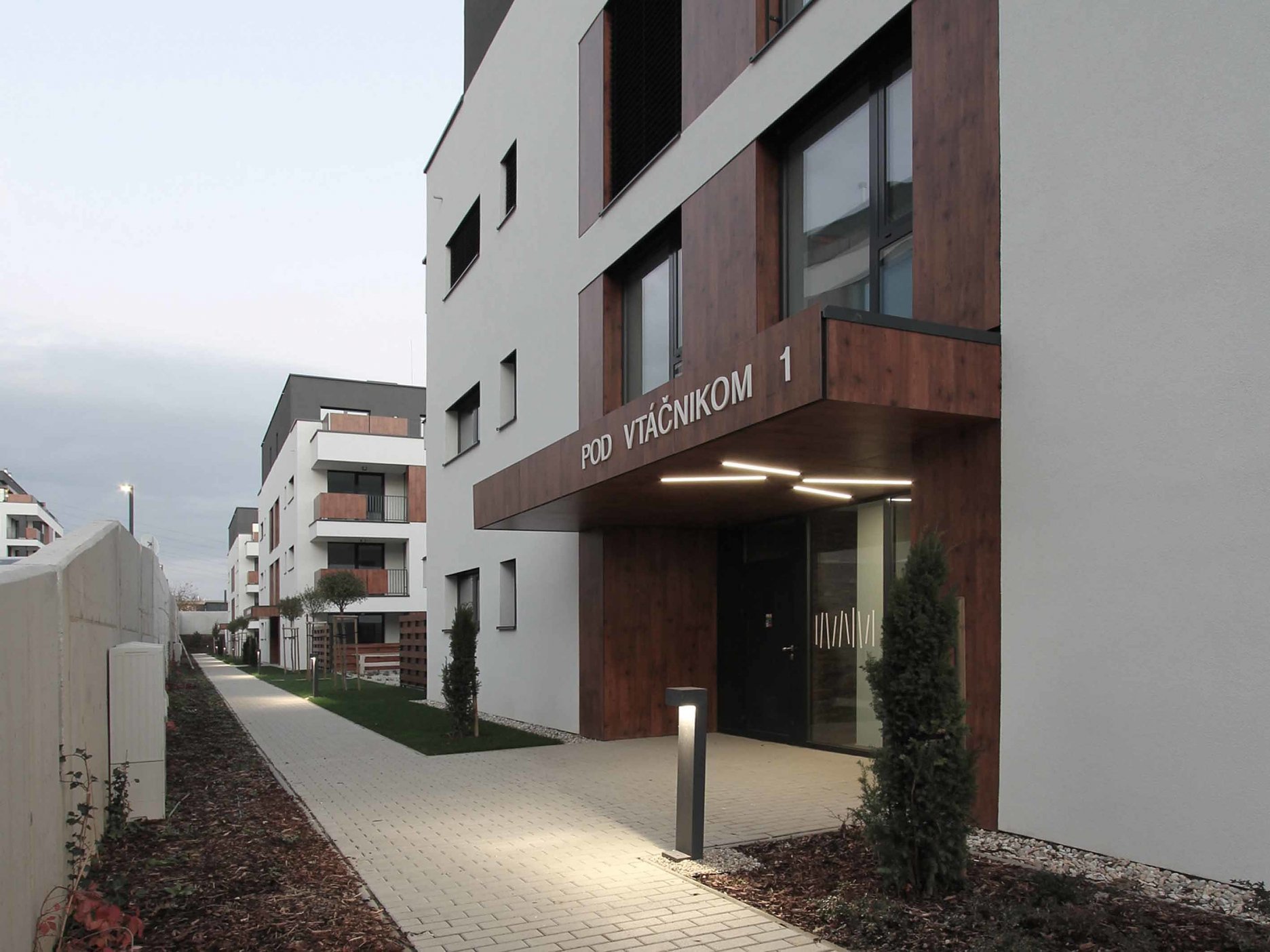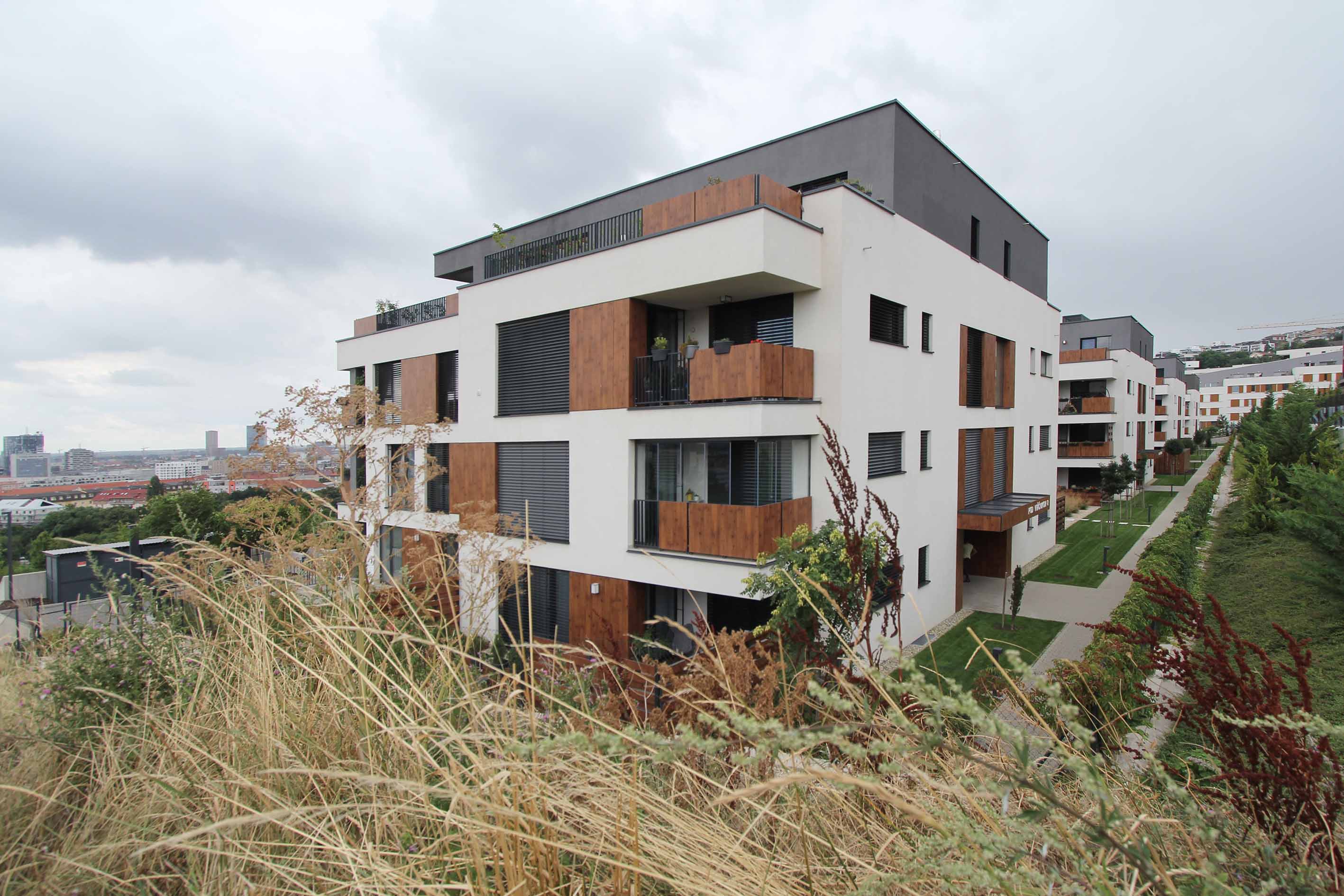 Bytové domy sú navrhnuté ako mestské vilové domy. Sú to nízkopodlažné, sólo stojace objekty. Celkovo sedem bytových domov, ktoré sú vzájomne voči sebe posunuté tak, aby si neprekážali vo výhľade na mesto. Objekty sú osadené na dvoch terénnych terasách s prevýšením 6 m. Pri návrhu sme kládli dôraz, aby vzdialenosť medzi jednotlivými objektmi bola väčšia ako ich výška, čím sme dosiahli príjemný priestorový a svetelný komfort vo vnútroblokoch.