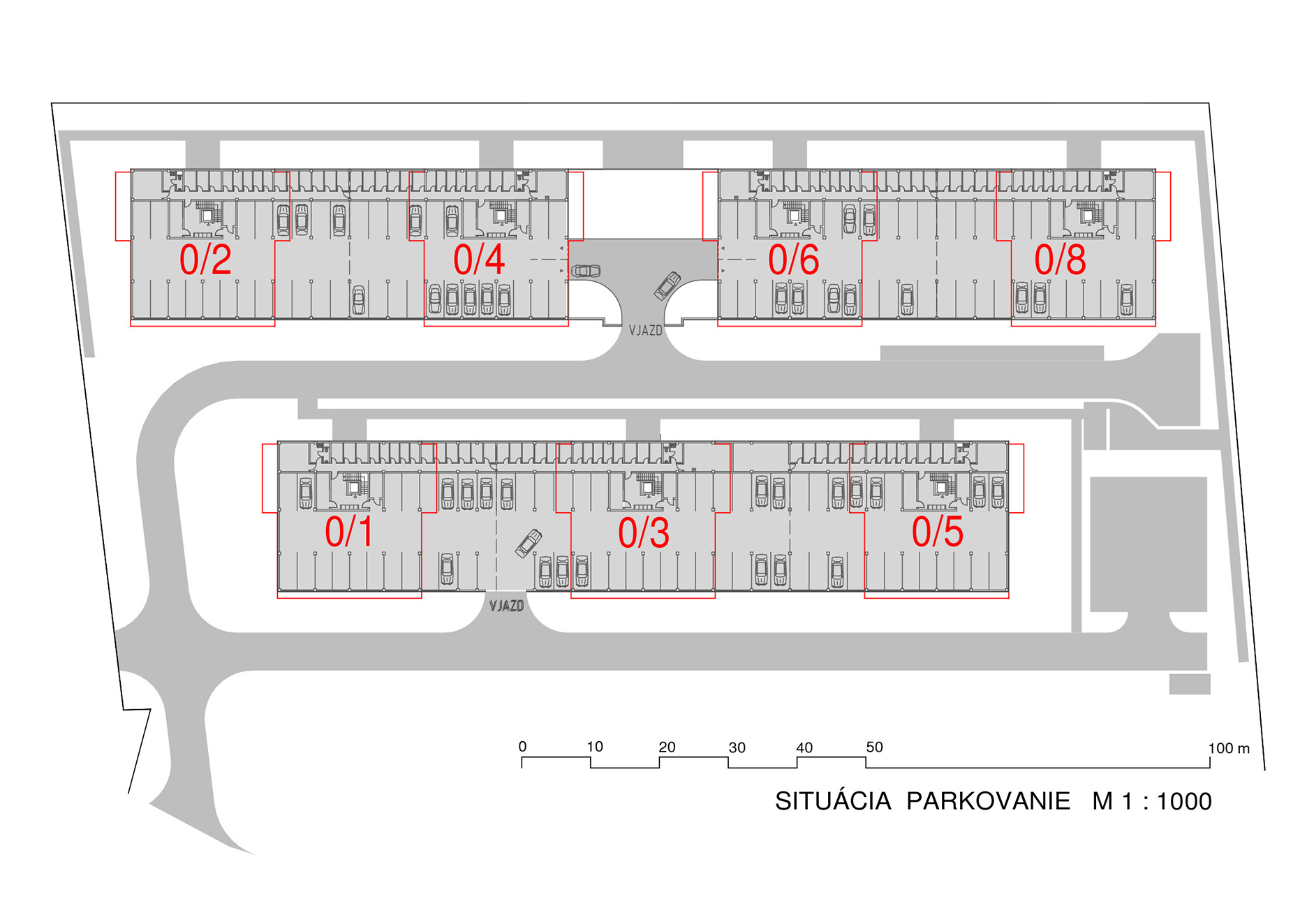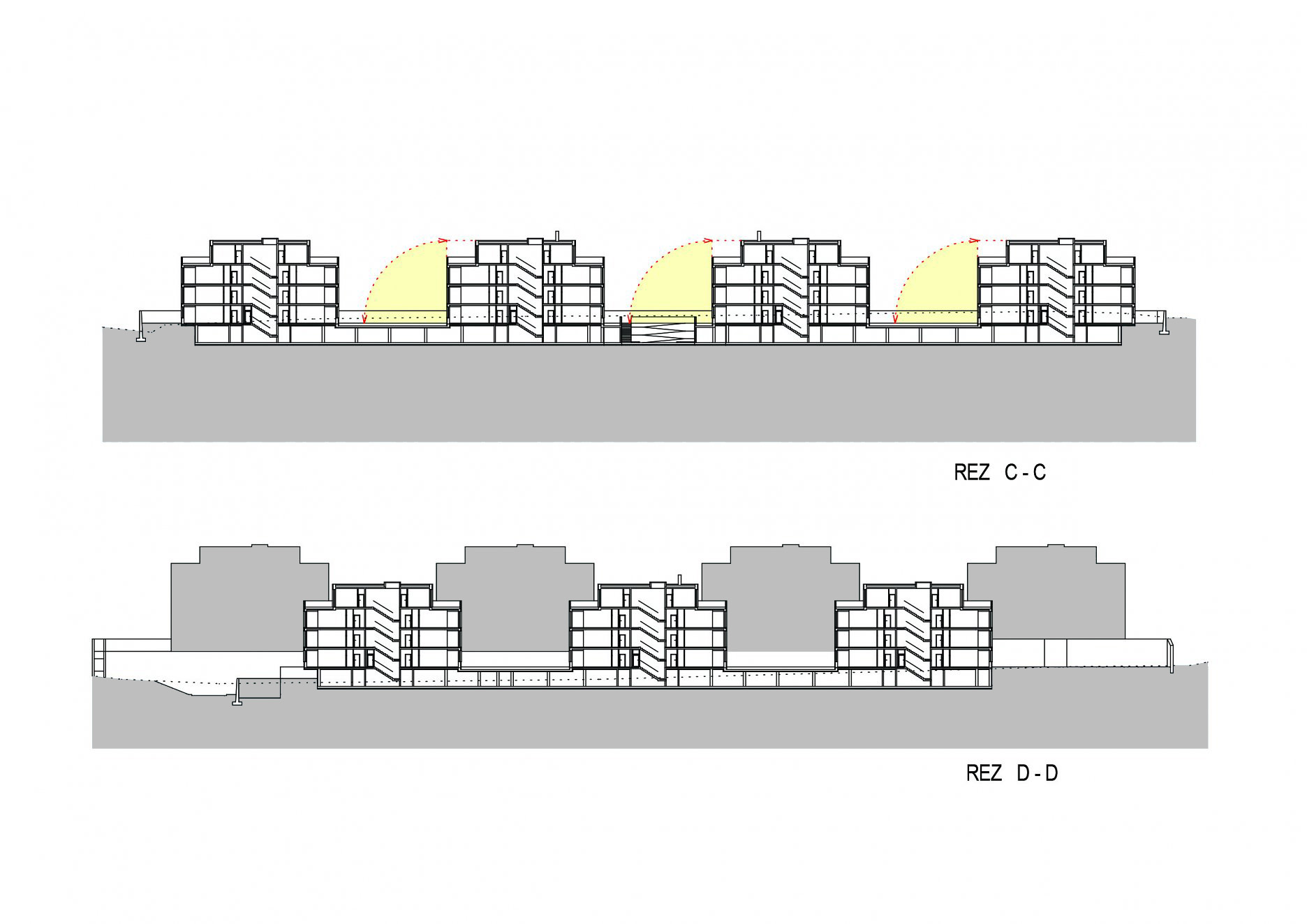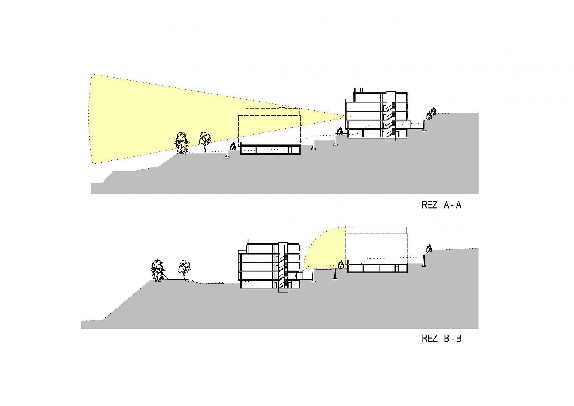 Bytové domy sú navrhnuté ako mestské vilové domy. Sú to nízkopodlažné, sólo stojace objekty. Celkovo sedem bytových domov, ktoré sú vzájomne voči sebe posunuté tak, aby si neprekážali vo výhľade na mesto. Objekty sú osadené na dvoch terénnych terasách s prevýšením 6 m. Pri návrhu sme kládli dôraz, aby vzdialenosť medzi jednotlivými objektmi bola väčšia ako ich výška, čím sme dosiahli príjemný priestorový a svetelný komfort vo vnútroblokoch.