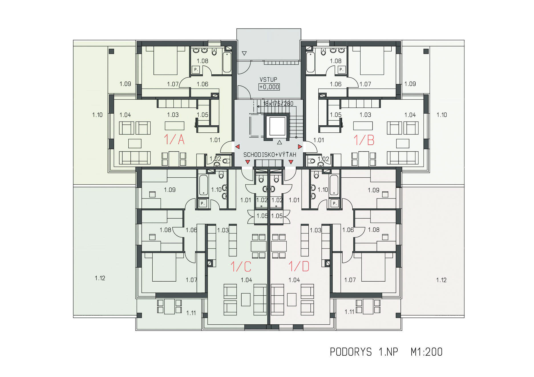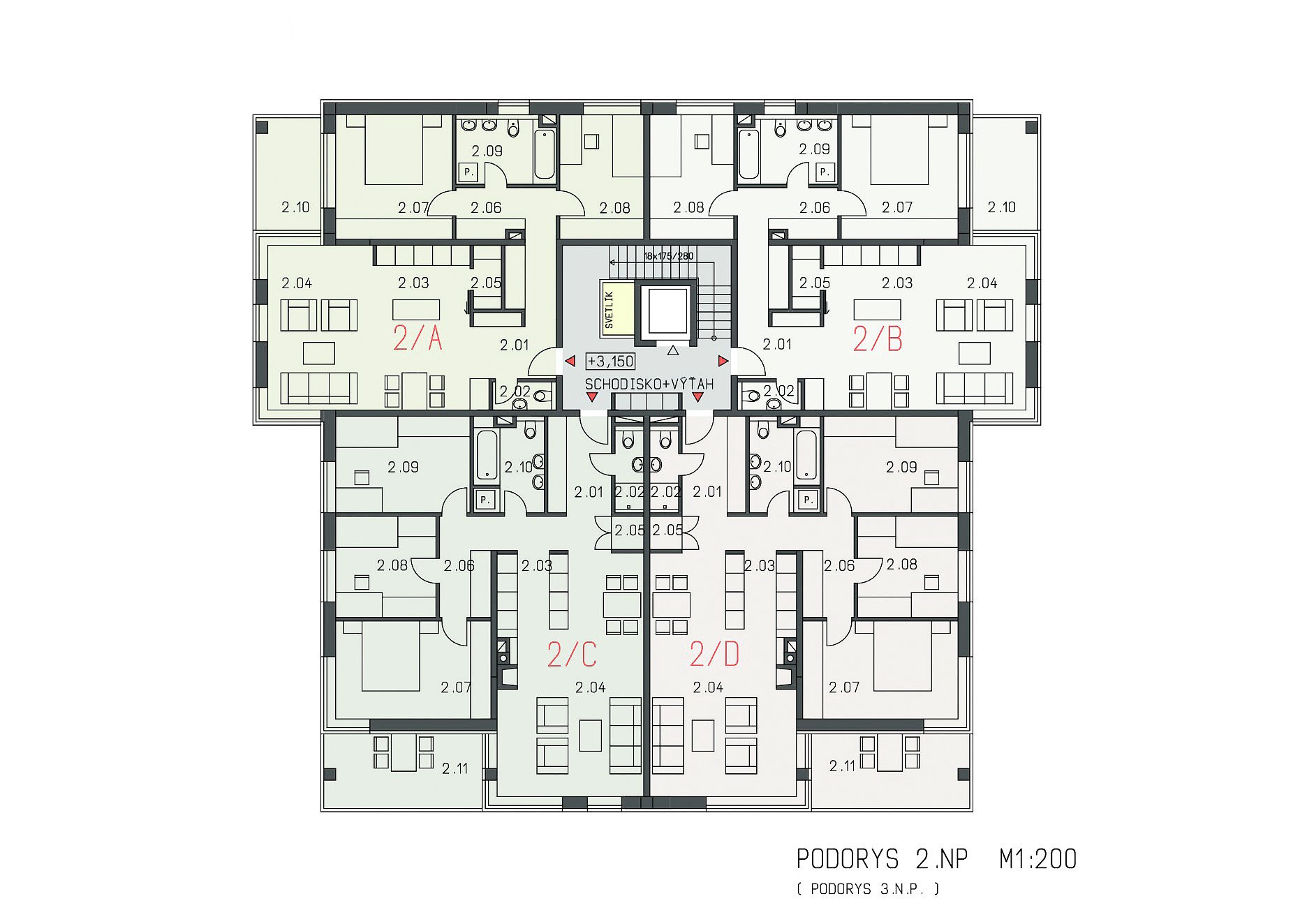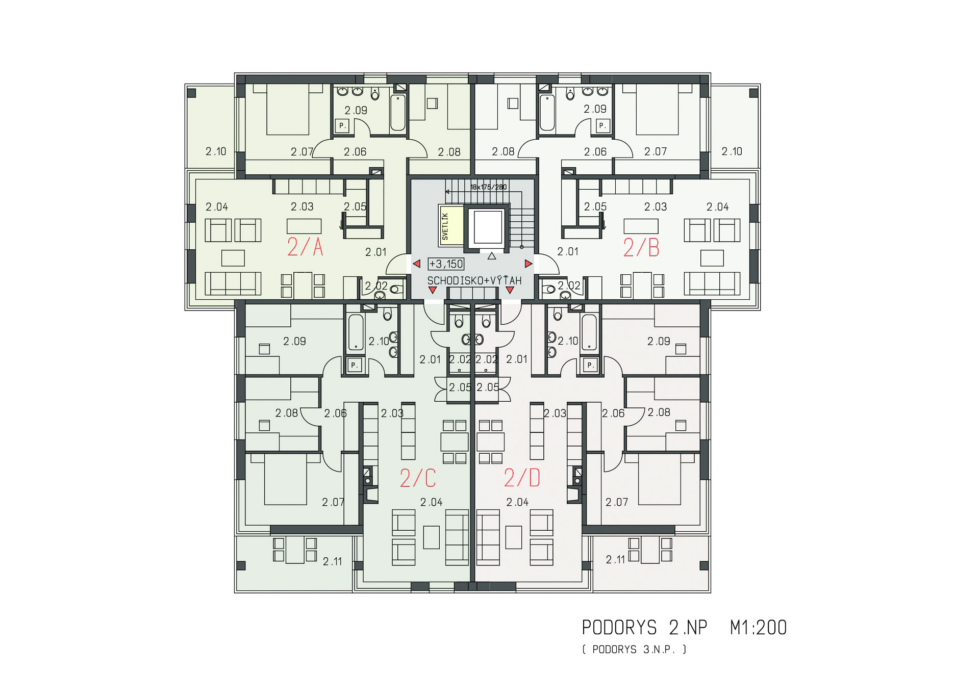 Každý dom má vstupnú halu, ktorá vedie do priestoru centrálneho schodiska s výťahom, osvetleného denným svetlom cez strešný svetlík. Budova má 1 podzemné a 4 nadzemné podlažia, pričom posledné podlažie je riešené ako „posledné ustupujúce podlažie“ . V suteréne sú navrhnuté parkoviská, technické priestory a spoločné nebytové priestory. Na každom podlaží sú 4 byty. Celkovo je v jednom bytovom dome 14 bytových jednotiek v nasledovnej skladbe: 2 x 2-izbové, 6 x 3-izbové, 6 x 4-izbové. V nárožných polohách majú byty navrhnuté pobytové lodžie. Obytné priestory na prízemí majú k dispozícii privátnu zelenú plochu. Byty na poslednom podlaží majú terasu s výhľadom.