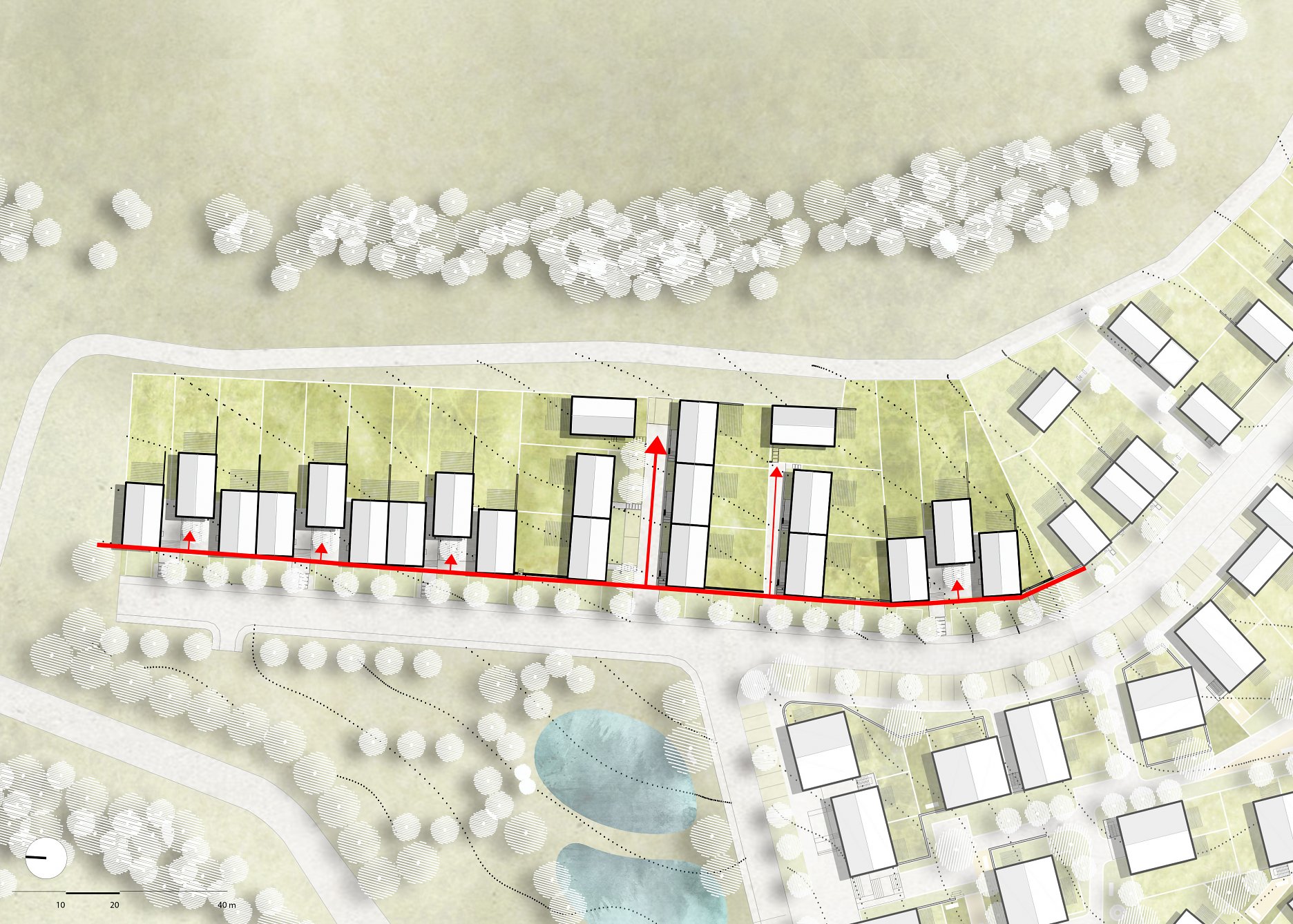 Spomínaná cesta prechádzajúca stredom lokality stúpa svahovitým terénom od námestíčka až po vodojem. Jej charakter sa so stúpaním mení - od urbánneho priestoru, cez parkovú cestu medzi záhradami, až po verejný sad. Urbanistické riešenie vytvára širokú škálu poloverejných a polosúkromných priestorov, ktoré tvoria rozšírenia ulice a vnútrobloky. Medzi rodinnými domami vznikajú intímne zdieľané priestory.