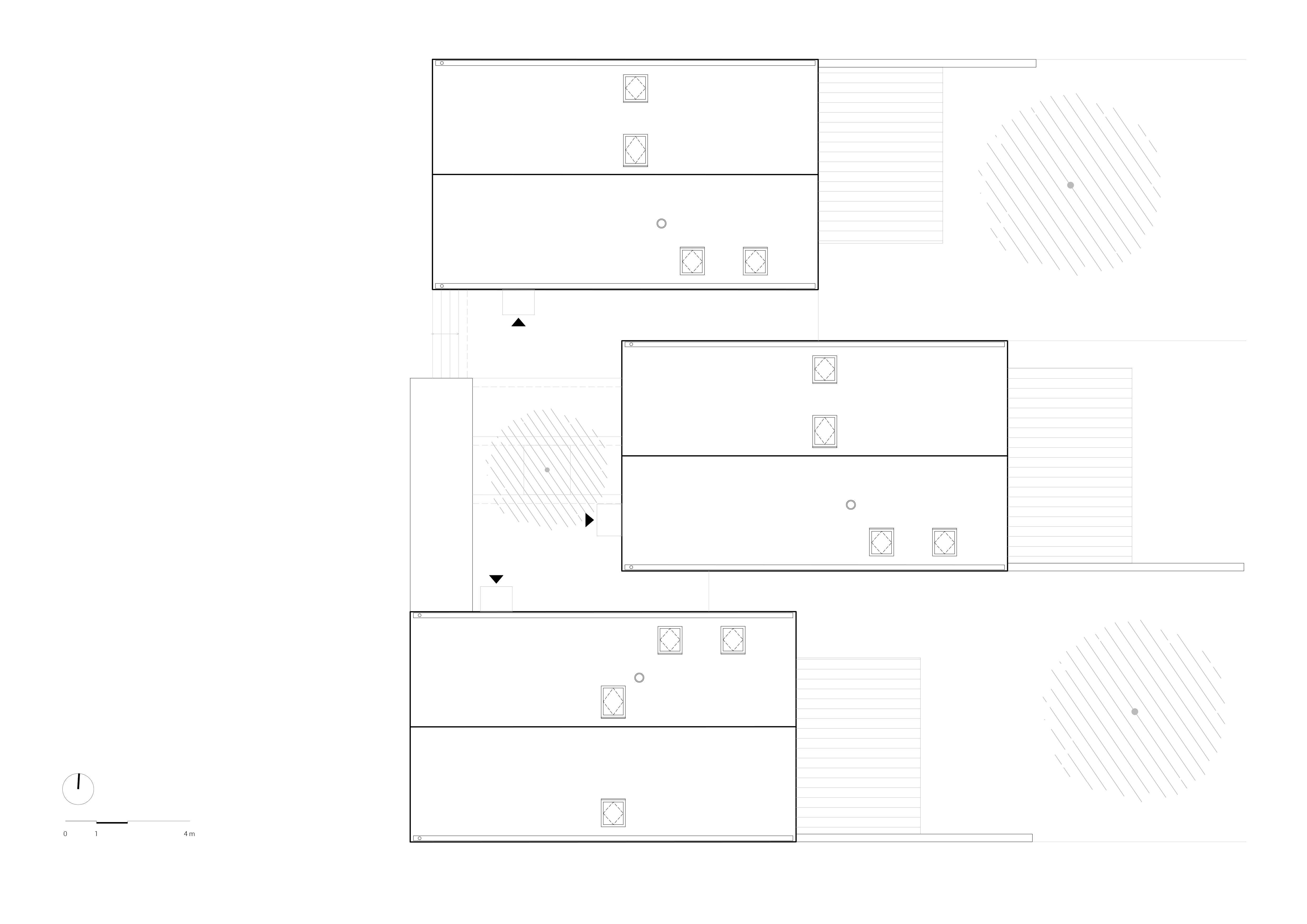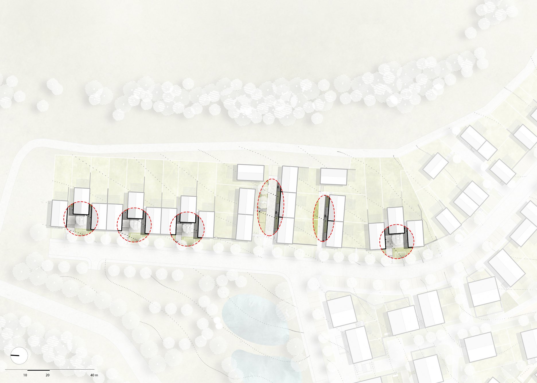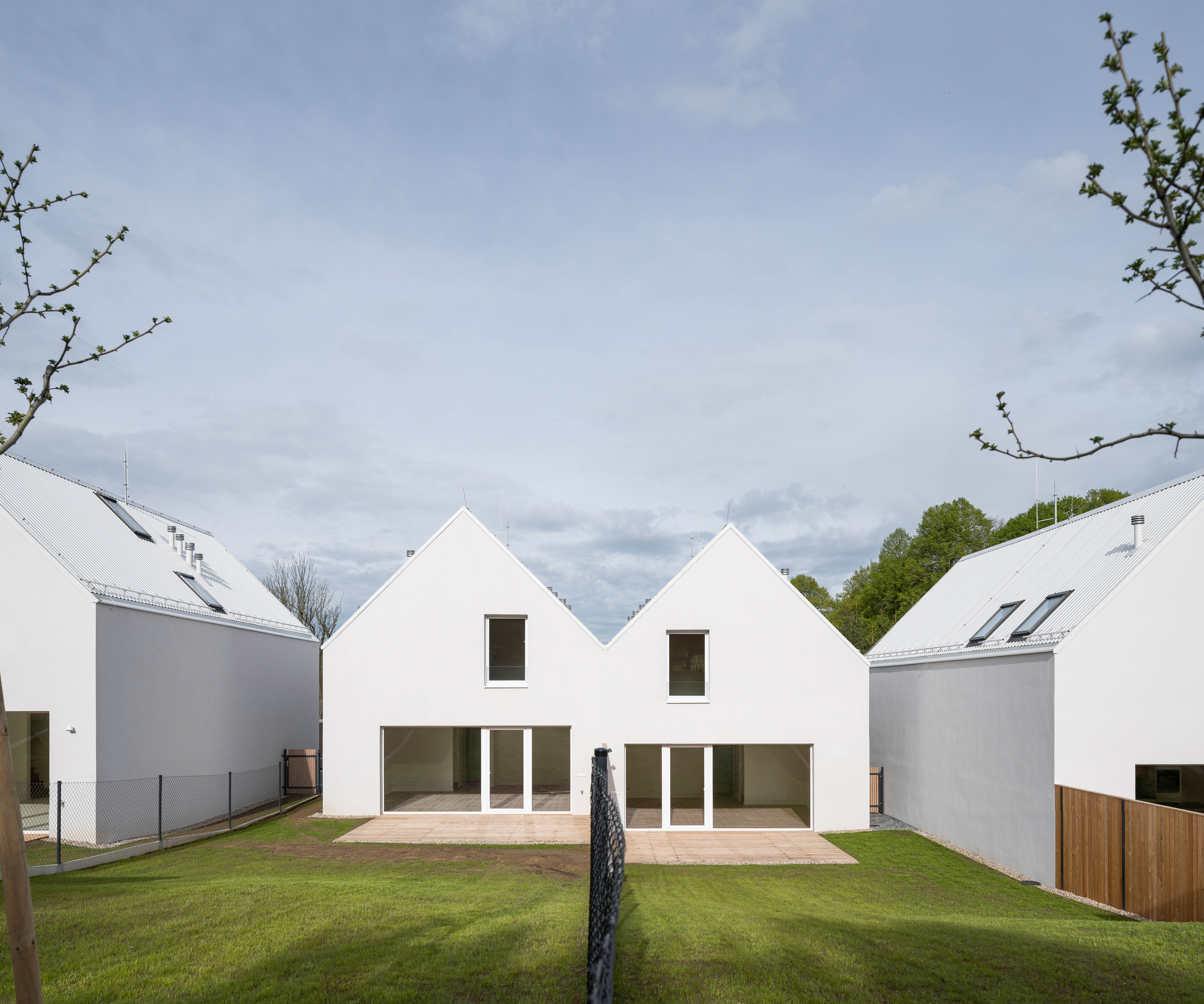 Jeden model využíva umiestnenie jednotiek vedľa seba, s priestormi na prechod do záhrady. Odsunutím strednej jednotky ďalej od uličnej čiary vzniká spoločný vstupný dvor, prechod medzi verejným a súkromným svetom. Dvorček je doplnený o spoločný záhradný domček, rozdelený na kóje pre jednotlivé domácnosti. Tento objem zároveň oddeľuje domy od námestíčka a zabezpečuje intimitu vstupného priestoru. V zadnej časti má každá jednotka súkromnú terasu s výhľadom do záhrady a krajiny.