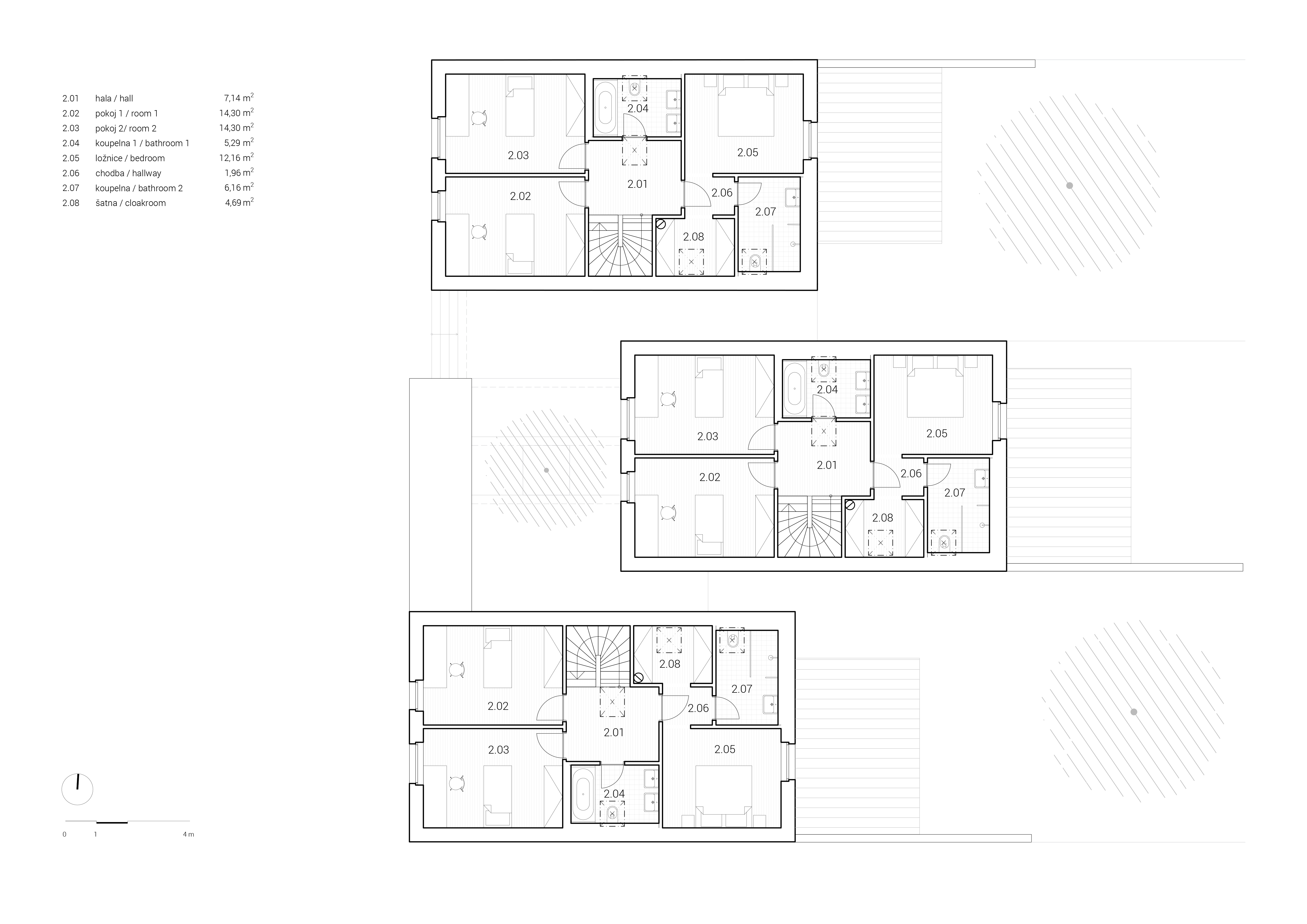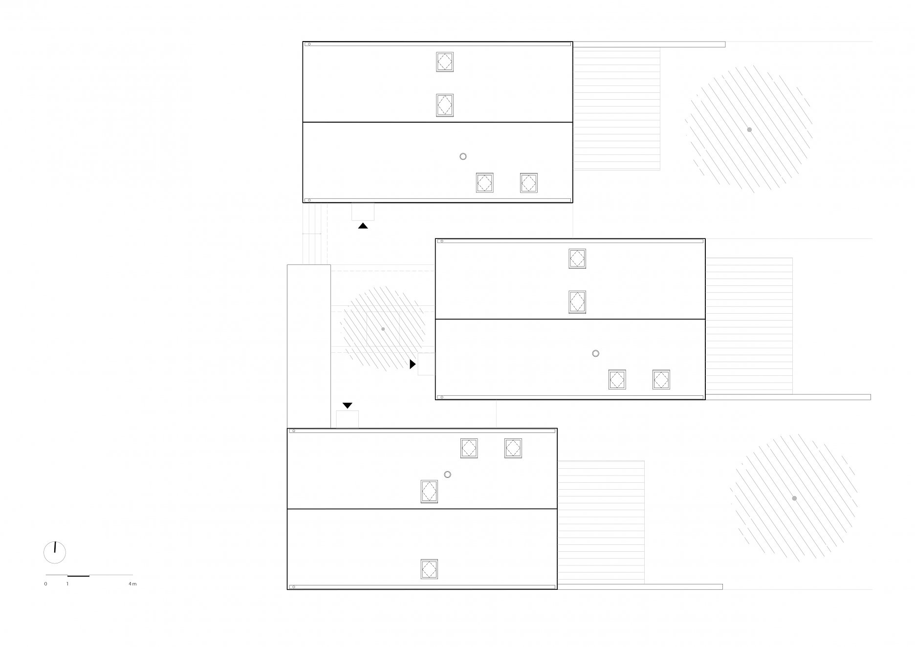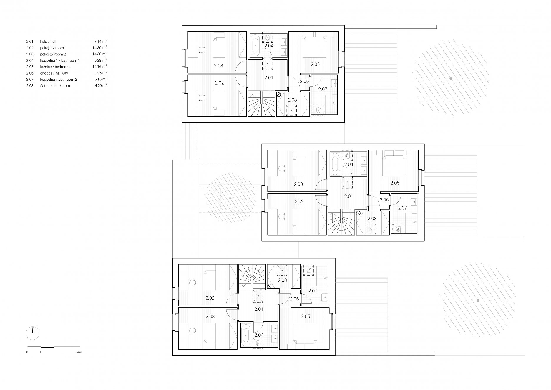 Jeden model využíva umiestnenie jednotiek vedľa seba, s priestormi na prechod do záhrady. Odsunutím strednej jednotky ďalej od uličnej čiary vzniká spoločný vstupný dvor, prechod medzi verejným a súkromným svetom. Dvorček je doplnený o spoločný záhradný domček, rozdelený na kóje pre jednotlivé domácnosti. Tento objem zároveň oddeľuje domy od námestíčka a zabezpečuje intimitu vstupného priestoru. V zadnej časti má každá jednotka súkromnú terasu s výhľadom do záhrady a krajiny.