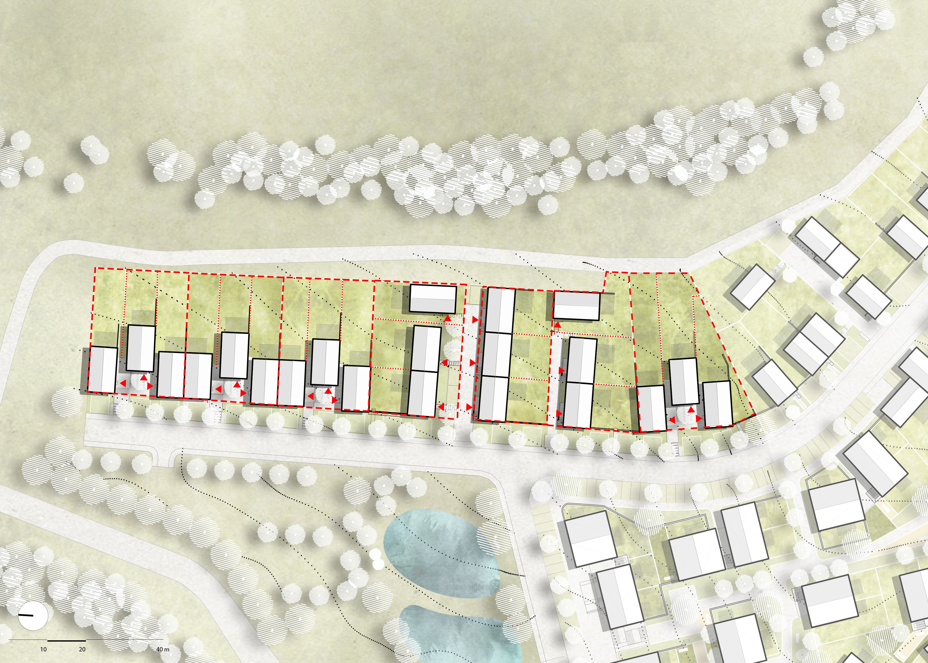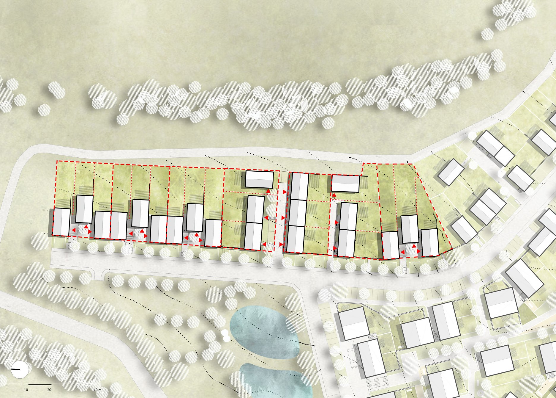 V území sú navrhnuté rodinné a bytové domy. Obvodové partie až na jednu výnimku tvoria rodinné domy. Centrálna zóna, ktorá je jasne definovaná uzavretou účelovou komunikáciou, zahŕňa rodinné aj bytové domy, pričom bytovky sú umiestnené v spodnej časti, v priamej väzbe na námestíčko. Mohutnejší objem domov tvorí pevný chrbát smerom k hlavnému verejnému priestoru v území.