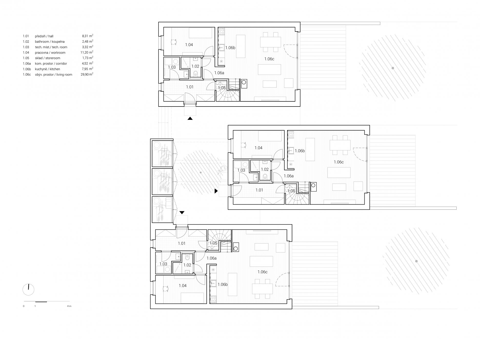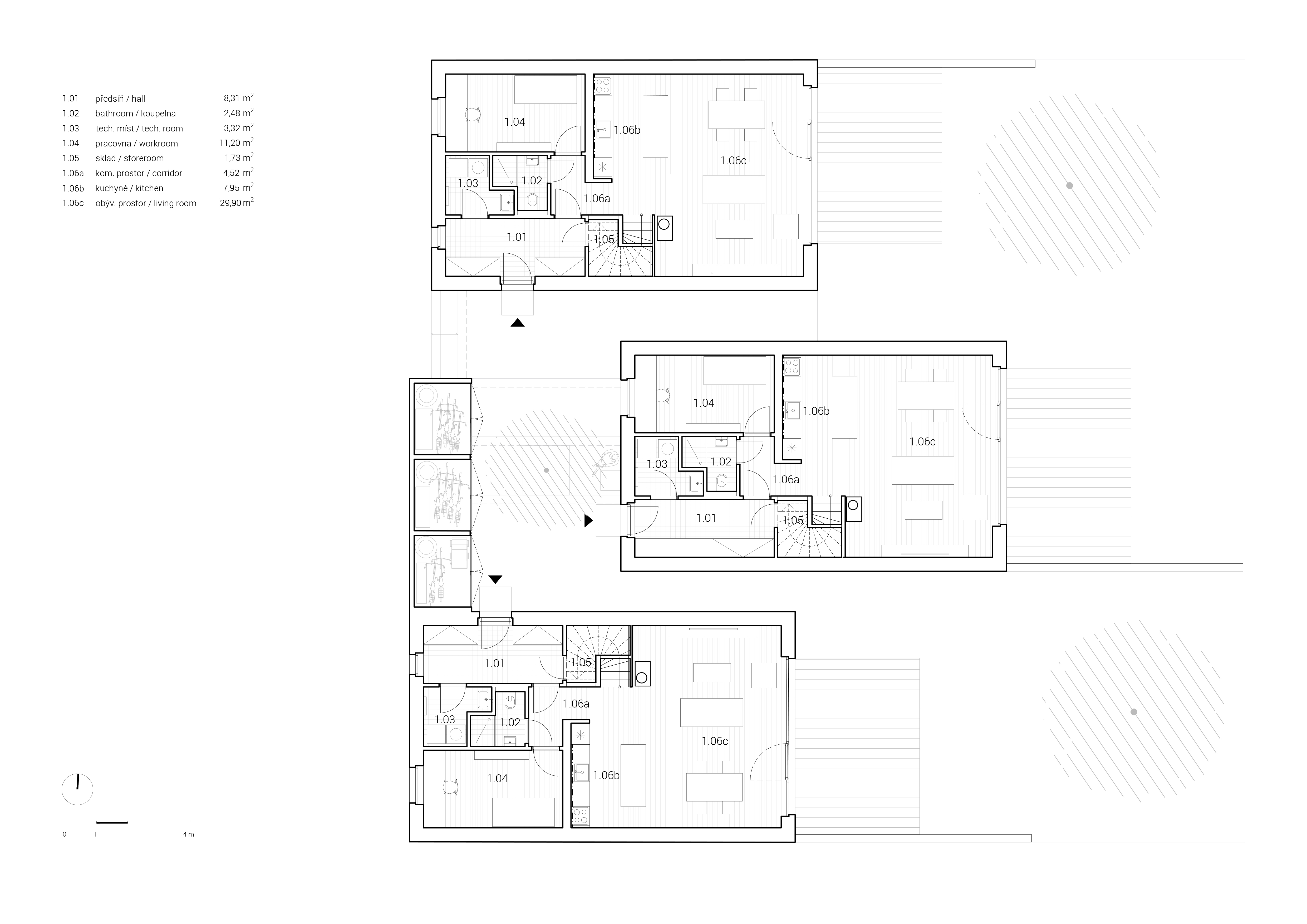 Rodinné domy v zóne I. (prvá etapa) sú navrhnuté ako variácie na radový dom. Okolo spoločného vstupného priestoru sú zoskupené vždy tri objekty.