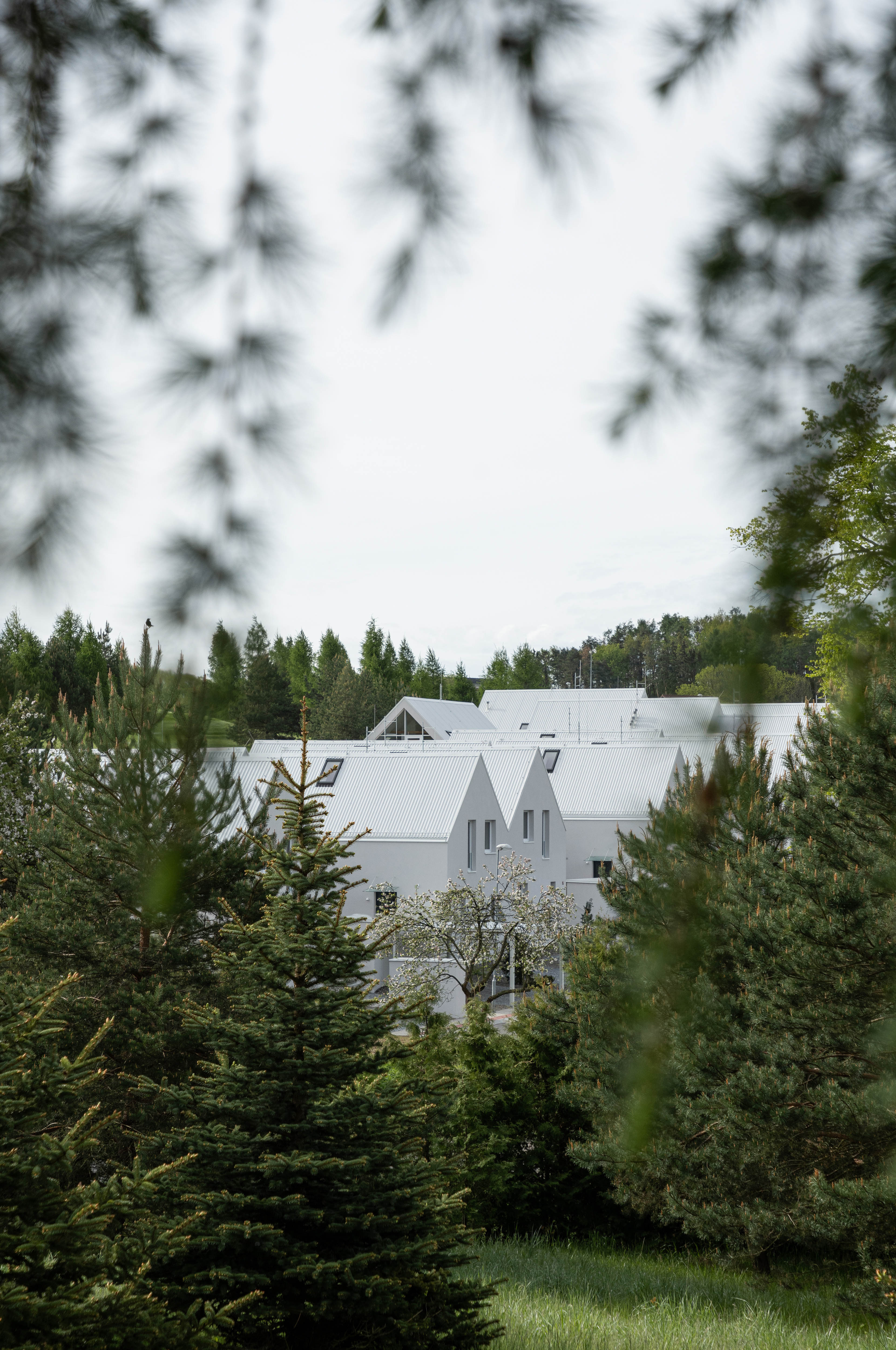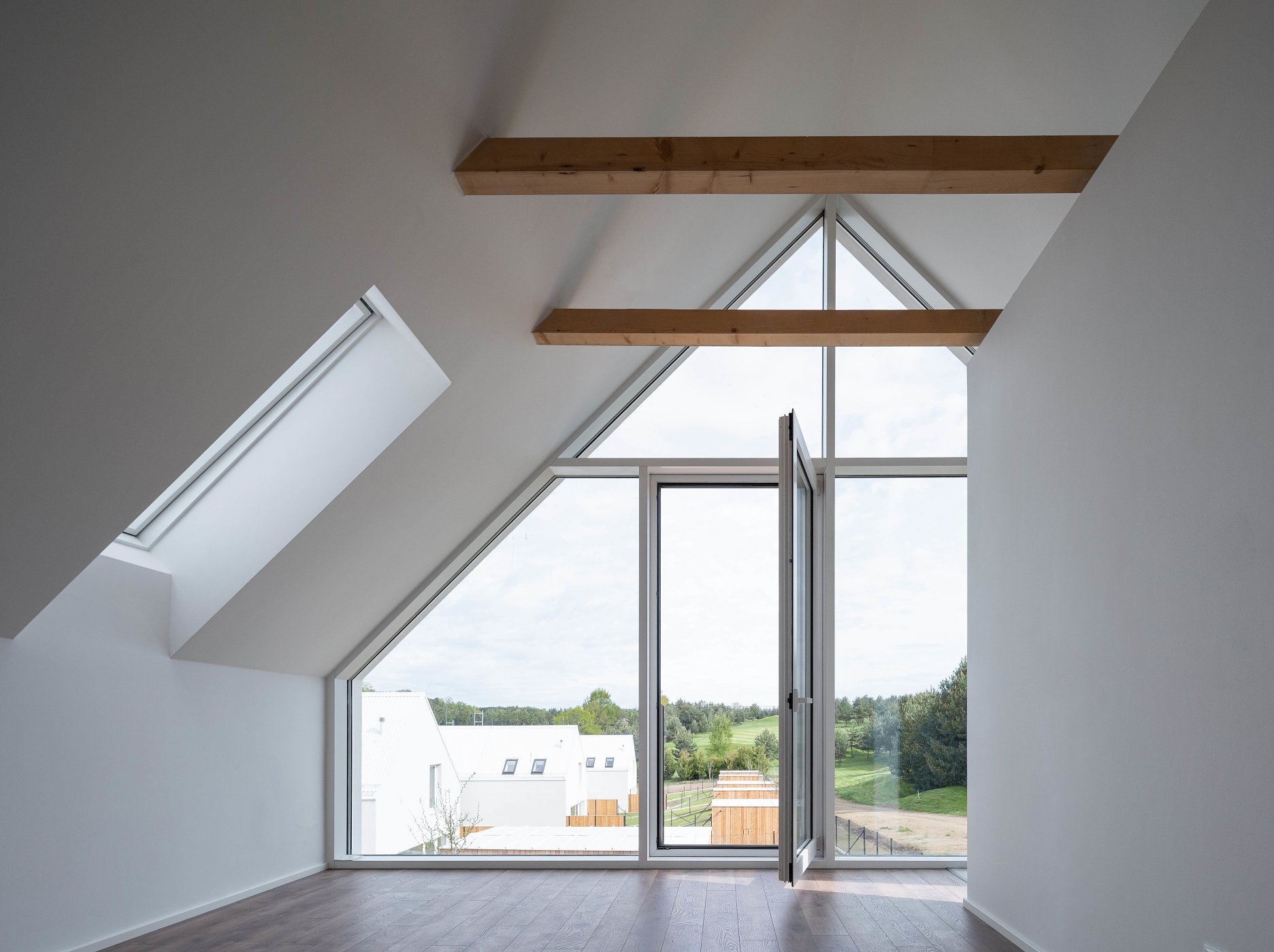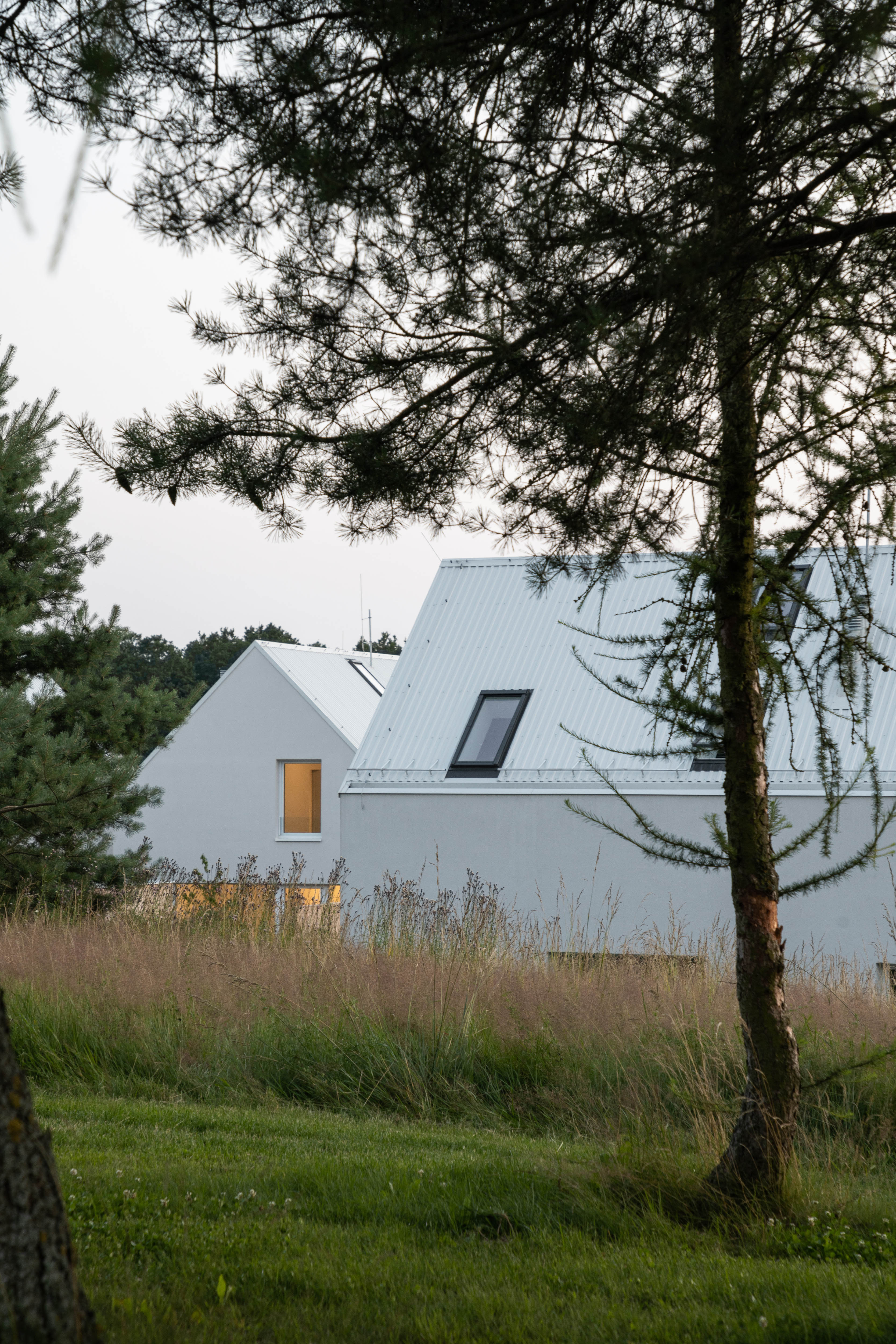 Svetlosivé fasády, strechy, klampiarske prvky a taktiež rámy zasklenia v súlade s autorským zámerom zjednocujú povrchy do konzistentného celku. Ľahké presklené striešky nad vstupmi kryjú celopresklené dvere s antracitovými rámami.
