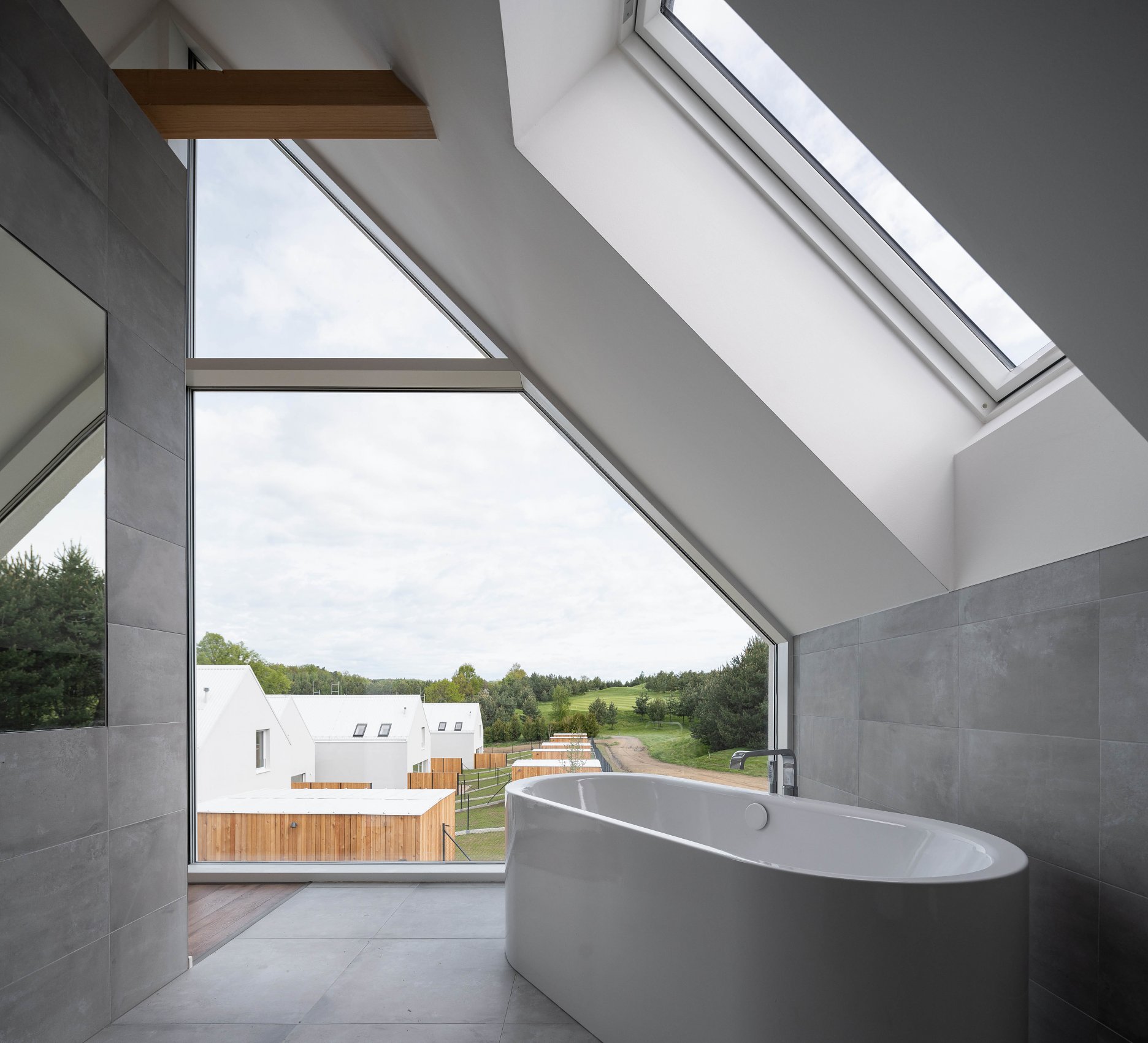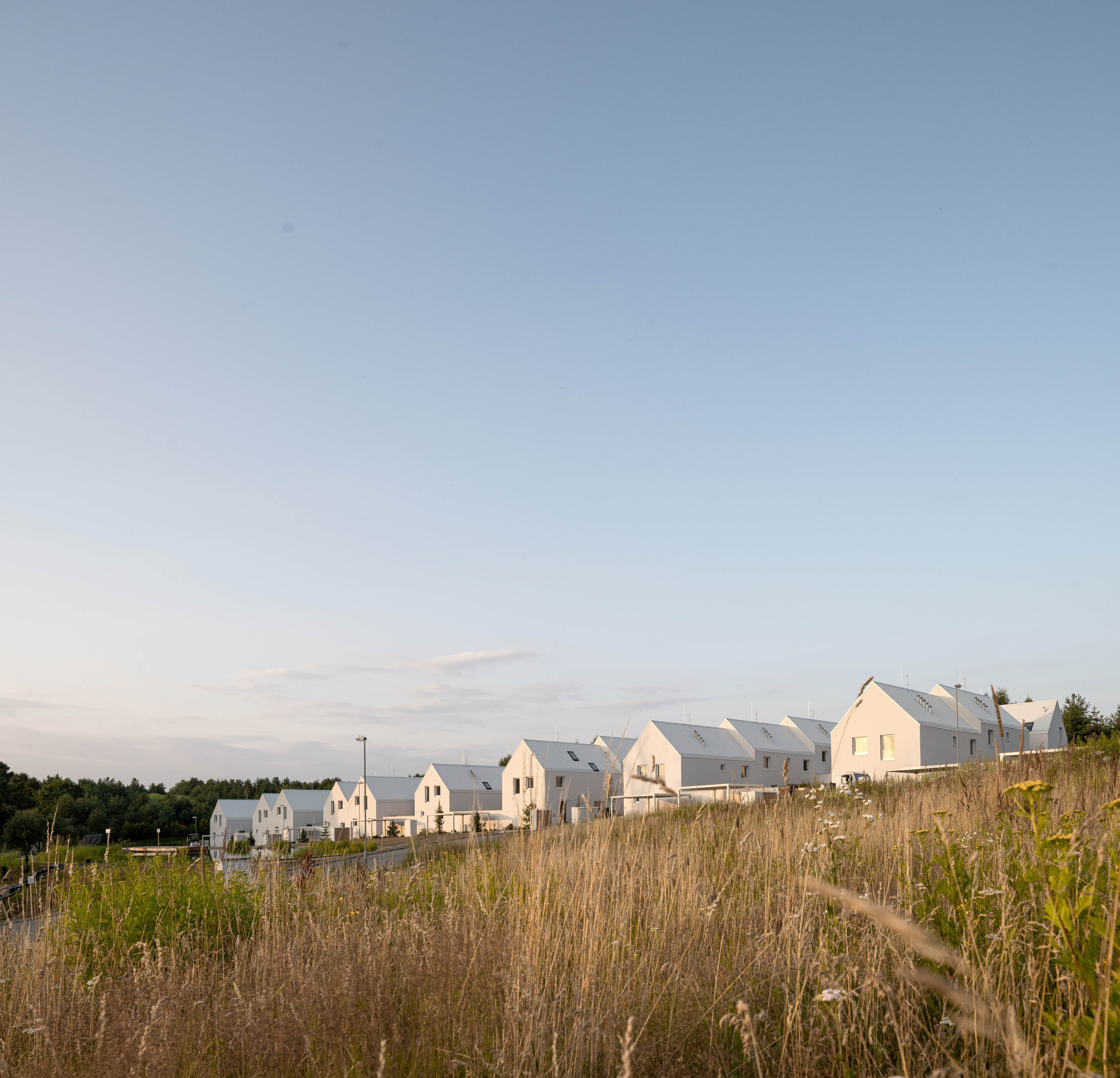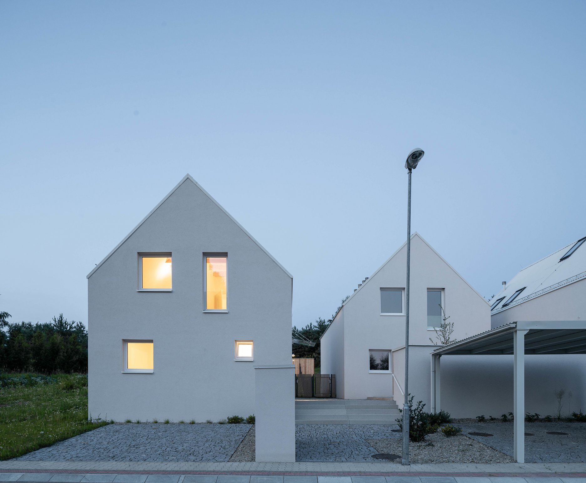 Objekty majú sedlové strechy so sklonom 45° bez presahov, ich veľké presklené steny obývacích miestností sú buď v štíte alebo v pozdĺžnej stene, podľa pozície domu v rámci bloku. Taktiež vstupy do objektov môžu byť zo štítu alebo z pozdĺžnej steny. Domy sa navzájom líšia rôznym umiestnením a veľkosťou otvorov vo fasádach.