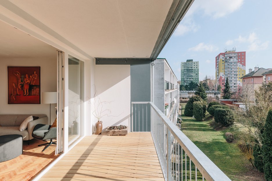 Lodžie obtížně využitelné hloubky 1,1 m jsme pomocí konzolové konstrukce rozšířili na cca 2 m. Každý byt má nyní jednu souvislou lodžii namísto dvou menších.