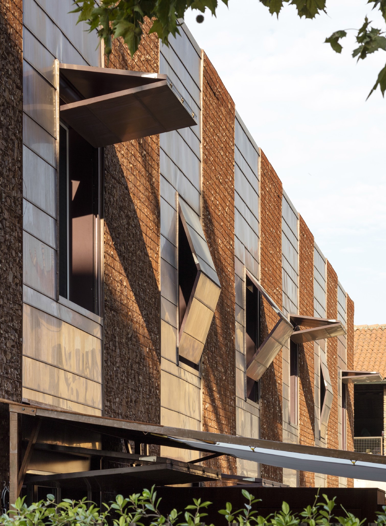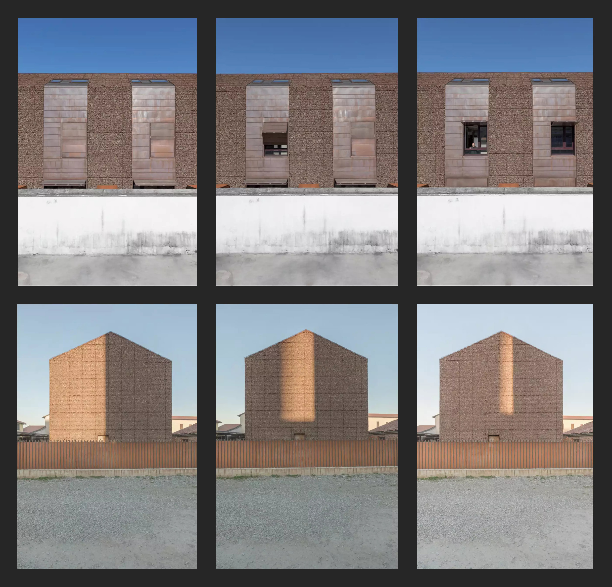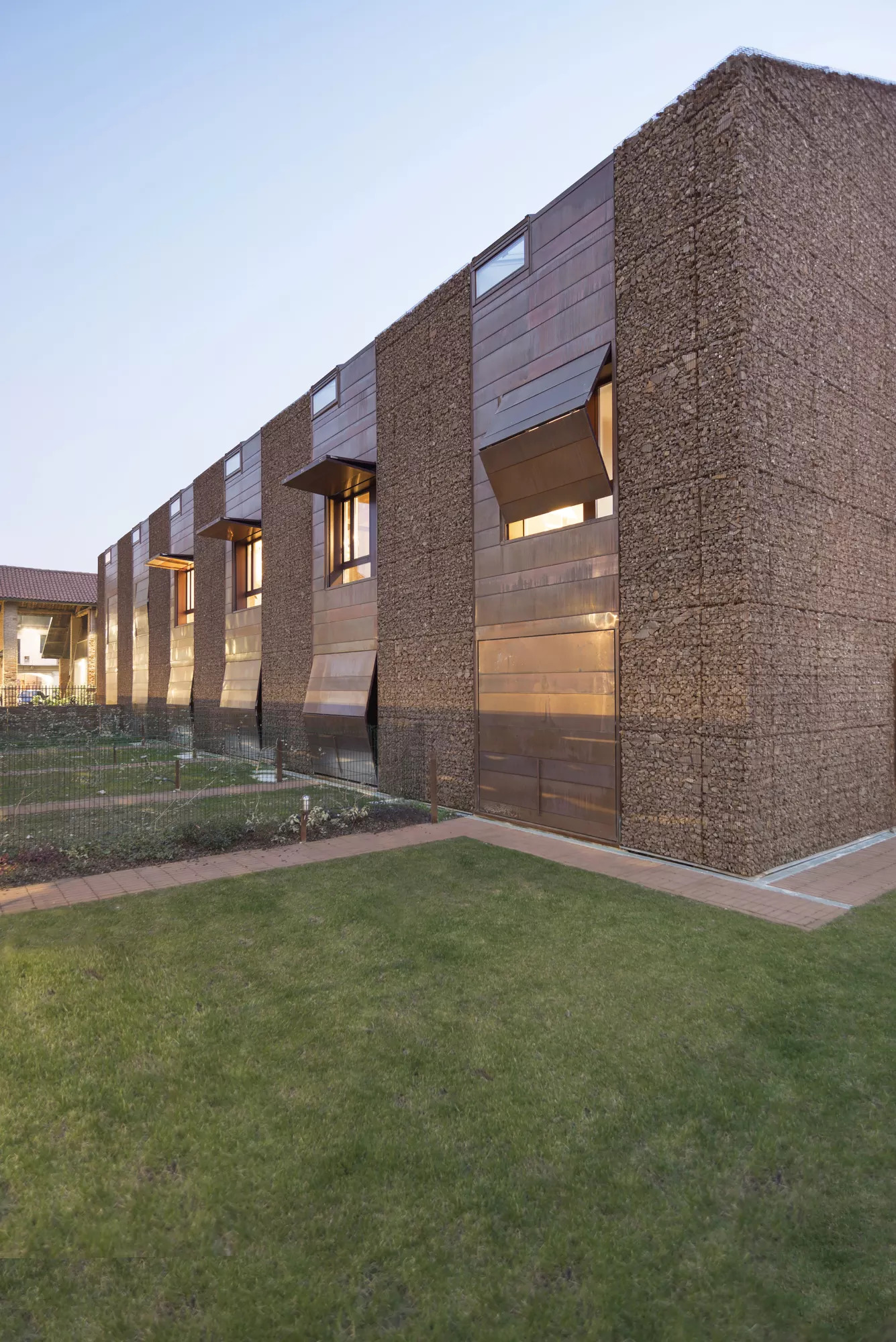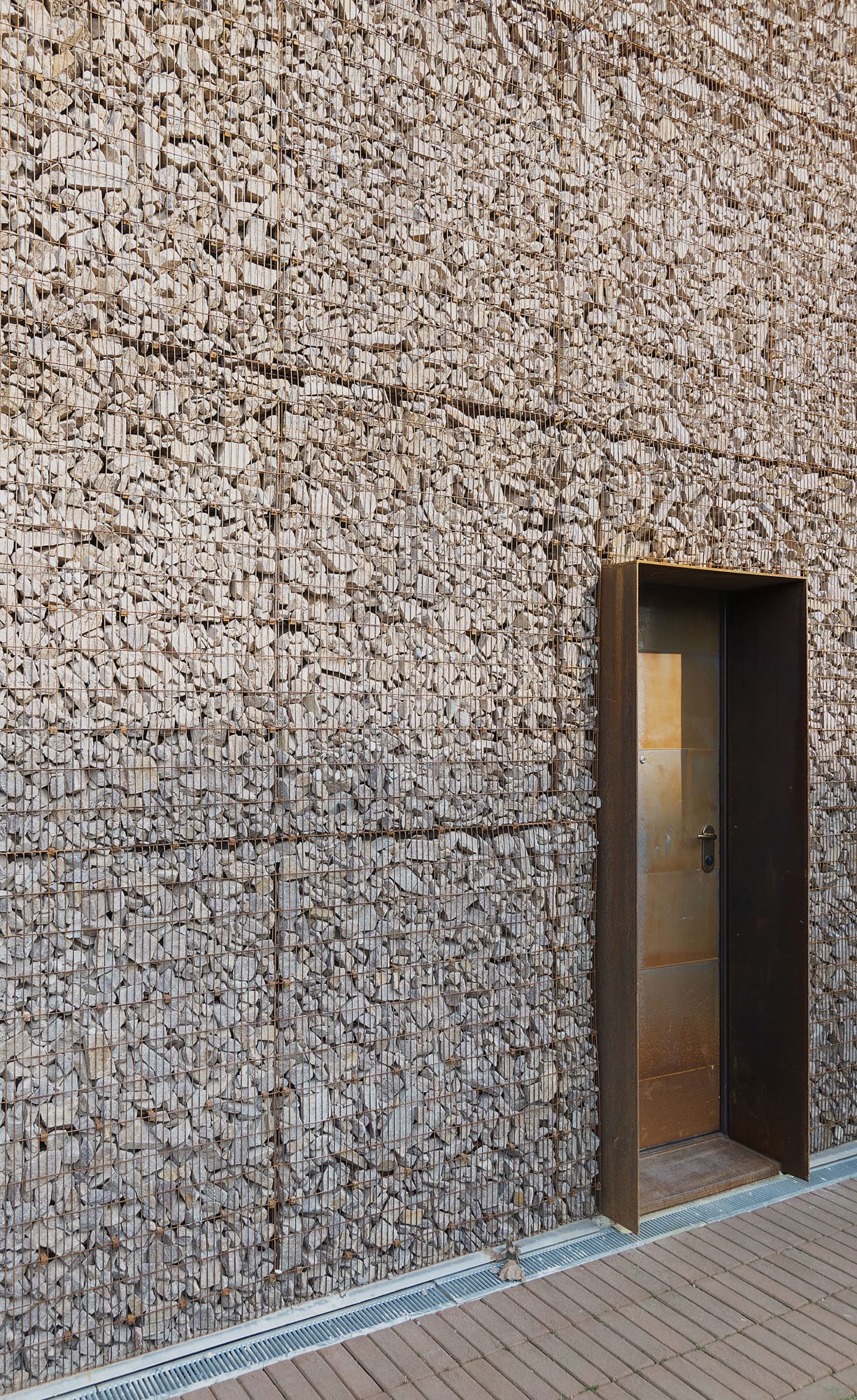Autori verili, že materiál z demolácie môže nájsť uplatnenie aj pri stavbe novej bytovky. Mohutné tehlové steny a betónové podlahy stodoly boli rozdrvené na kamenivo s rozmermi niekoľkých centimetrov. Vonkajšiu pohľadovú vrstvu novej bytovky tak tvorí práve materiál z pôvodnej stavby. Rozdrvenú masu drží po kope sieť z korténovej ocele. Napriek hrúbke obkladu v rádoch niekoľkých centimetrov pôsobí obklad celistvo a presvedčivo. Riešenie umožnilo kotviť obklad na úrovni jednotlivých podlaží. Prevetrávaná fasáda je prerušená šiestimi sekciami s medeným pášťom. Pred zasklenie každého bytu je predsadený systém skladacieho tienenia. Mechanicky otvárateľné rámové okenice obložené medeným plechom chránia interiér pred priamym slnkom a dažďom. O dostatok svetla v podkroví sa starajú rozmerné strešné okná.