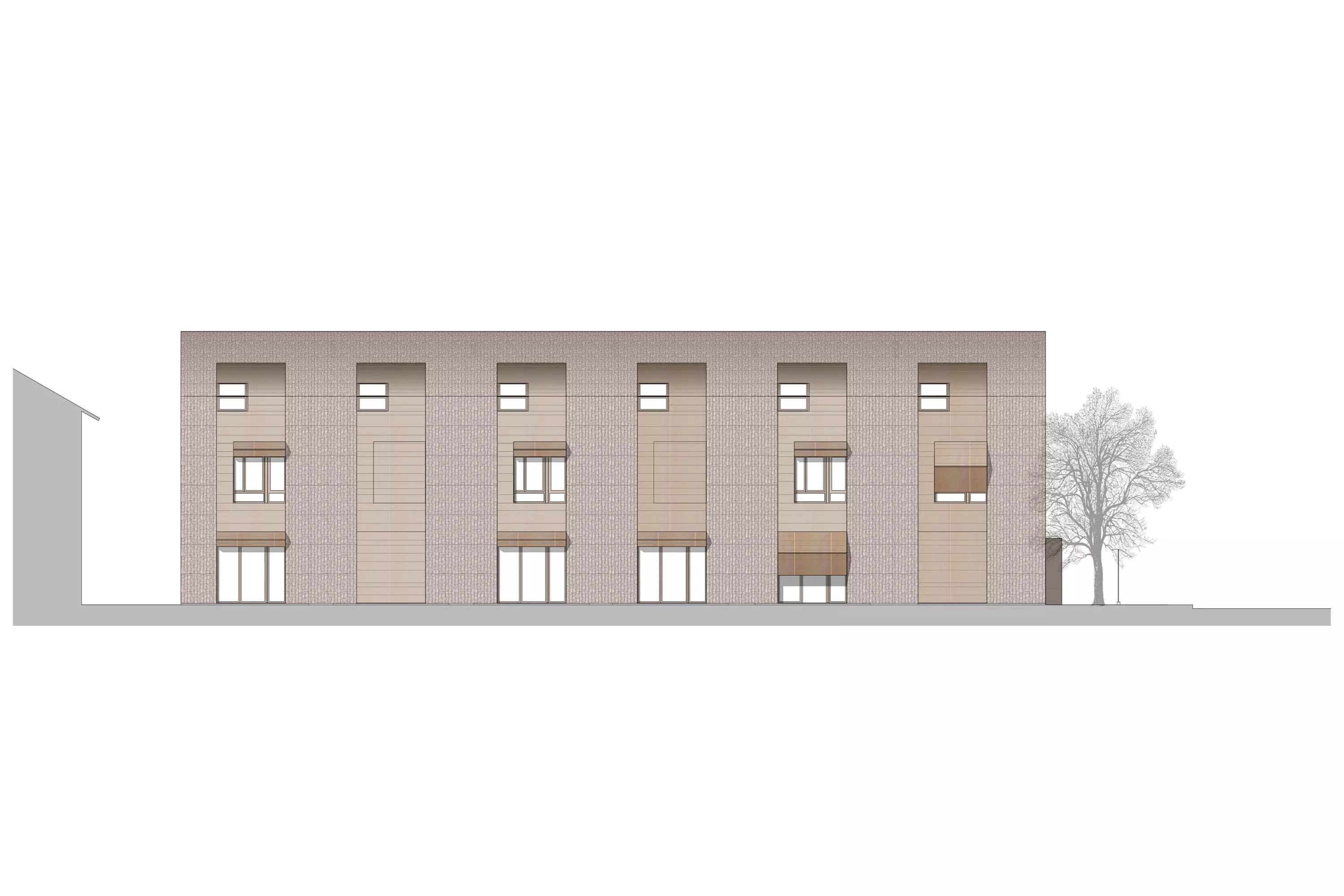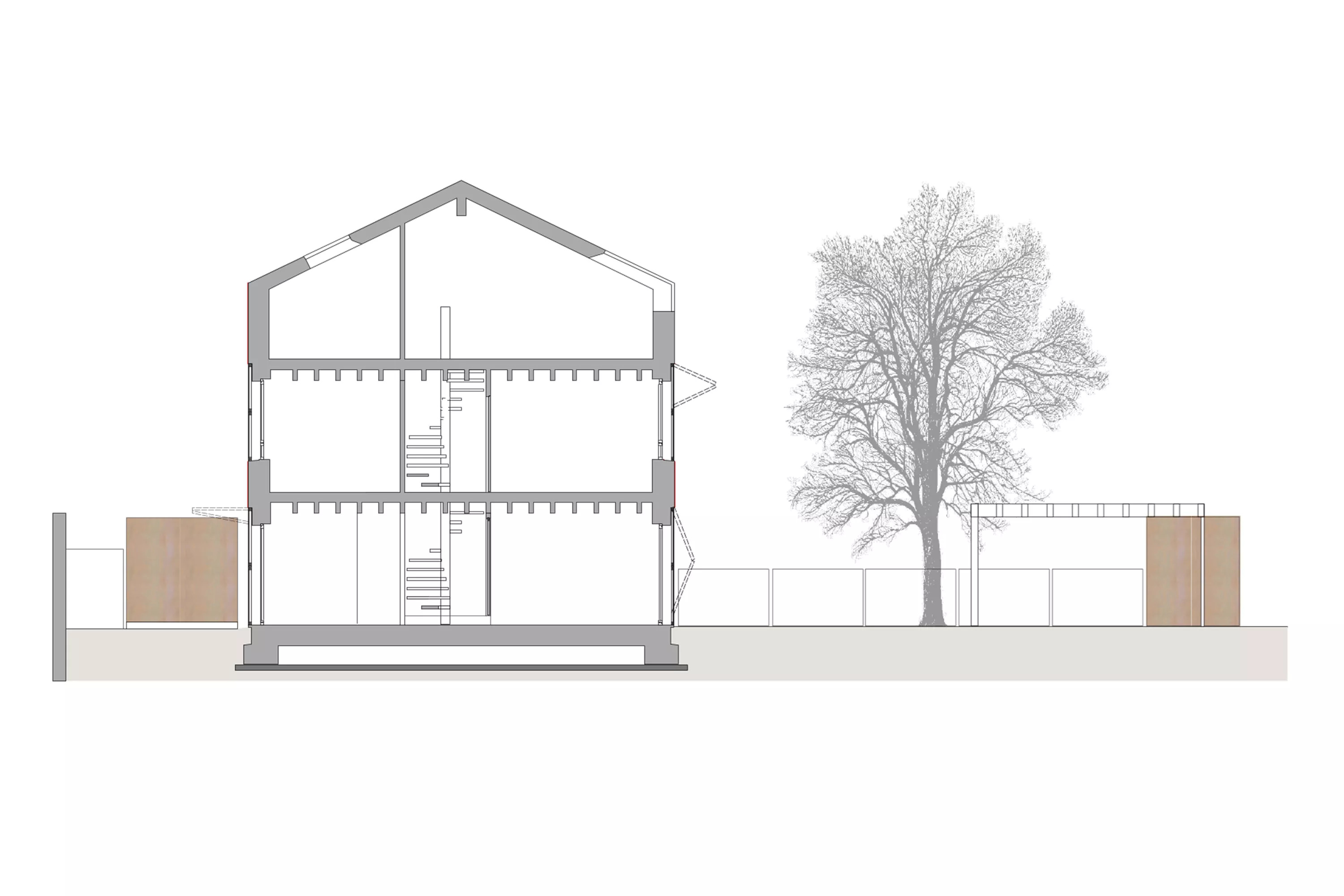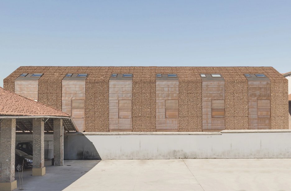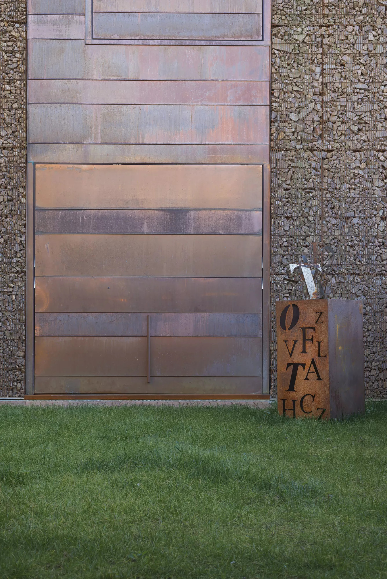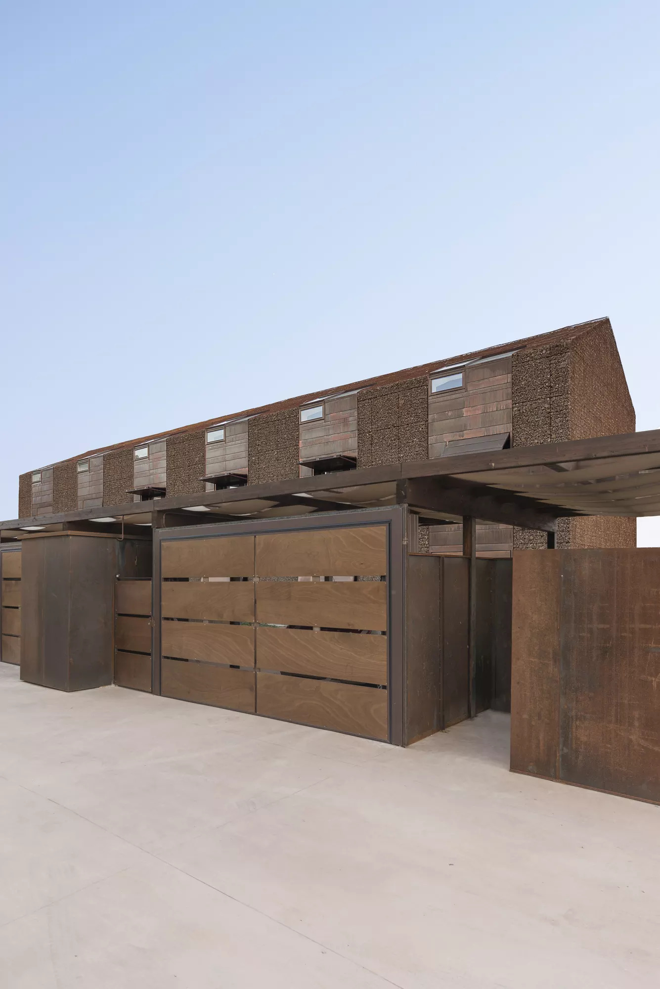 Autori verili, že materiál z demolácie môže nájsť uplatnenie aj pri stavbe novej bytovky. Mohutné tehlové steny a betónové podlahy stodoly boli rozdrvené na kamenivo s rozmermi niekoľkých centimetrov. Vonkajšiu pohľadovú vrstvu novej bytovky tak tvorí práve materiál z pôvodnej stavby. Rozdrvenú masu drží po kope sieť z korténovej ocele. Napriek hrúbke obkladu v rádoch niekoľkých centimetrov pôsobí obklad celistvo a presvedčivo. Riešenie umožnilo kotviť obklad na úrovni jednotlivých podlaží. Prevetrávaná fasáda je prerušená šiestimi sekciami s medeným pášťom. Pred zasklenie každého bytu je predsadený systém skladacieho tienenia. Mechanicky otvárateľné rámové okenice obložené medeným plechom chránia interiér pred priamym slnkom a dažďom. O dostatok svetla v podkroví sa starajú rozmerné strešné okná.