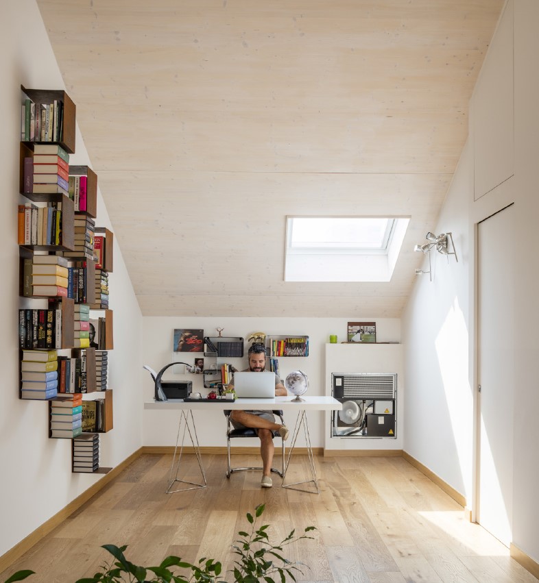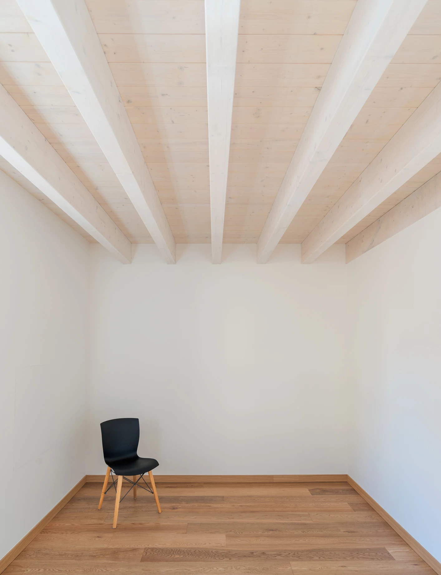 Nový plášť budovy pôsobí napriek pestrej materiálovej skladbe ako jednoliaty celok. Spomínaná predsadená fasáda so vzduchovou medzerou a dvojplášťová strecha umožnili elegantne integrovať žľaby, zvody, parapety aj tienenie. Tepelná zotrvačnosť kameniva spolu s dostatočnou tepelnou izoláciou prispievajú k energetickej efektívnosti stavby. Ako zdroj tepla a chladu slúži tepelné čerpadlo, ktoré napája podlahové kúrenie integrované v skladbe drevenej podlahy.