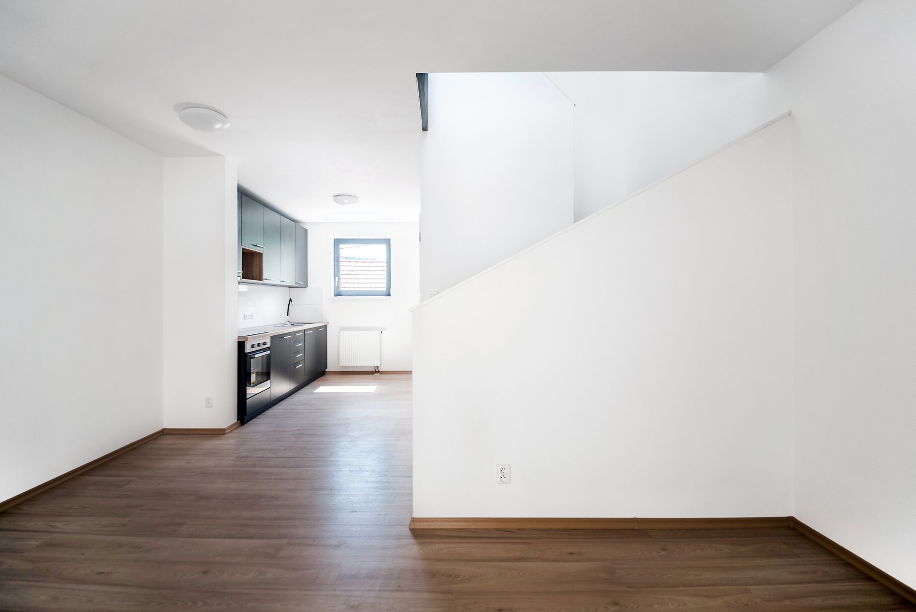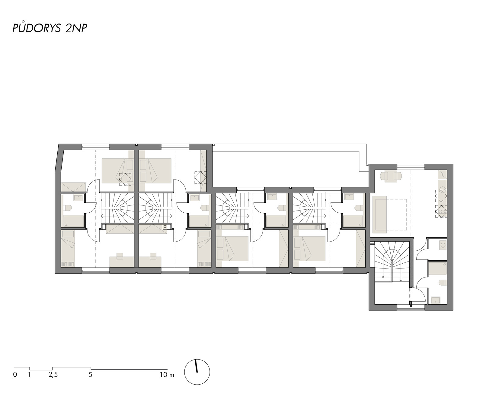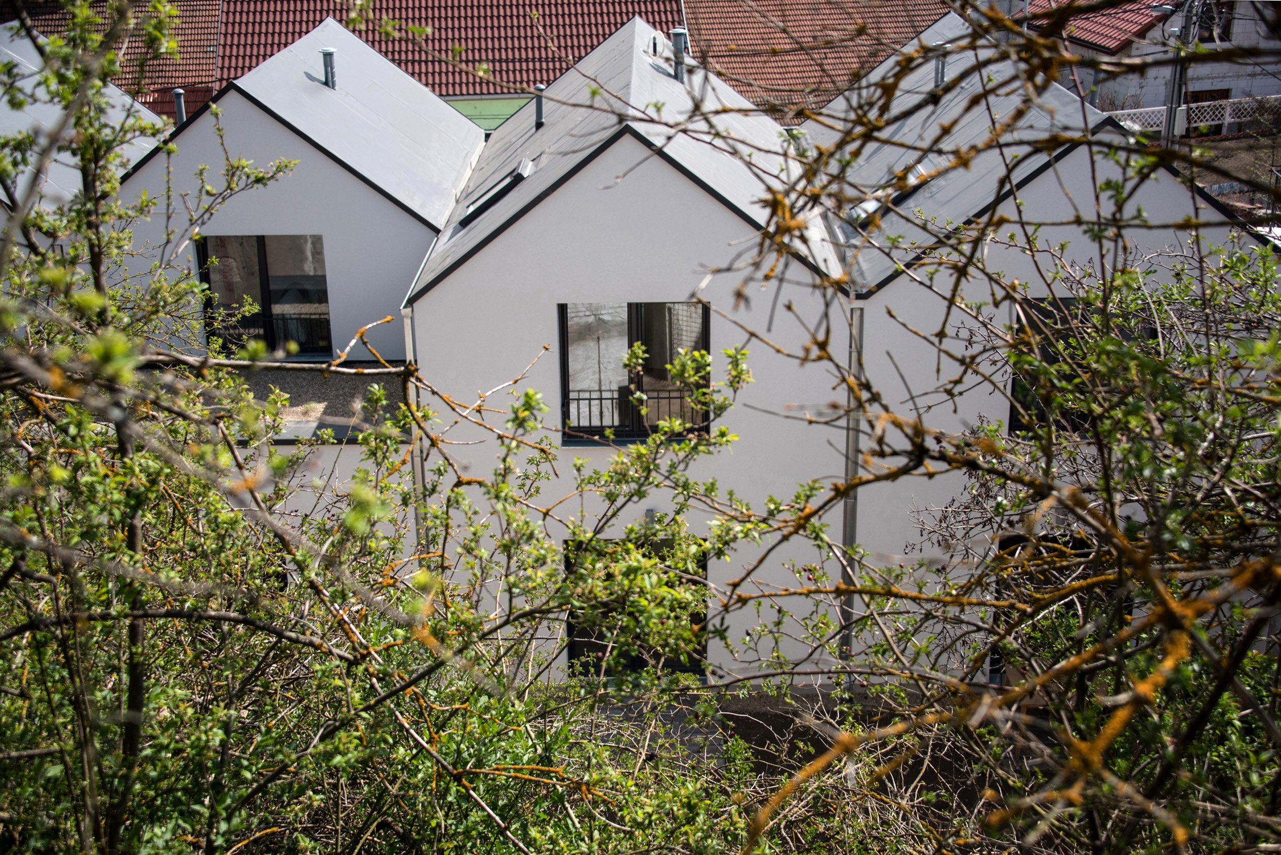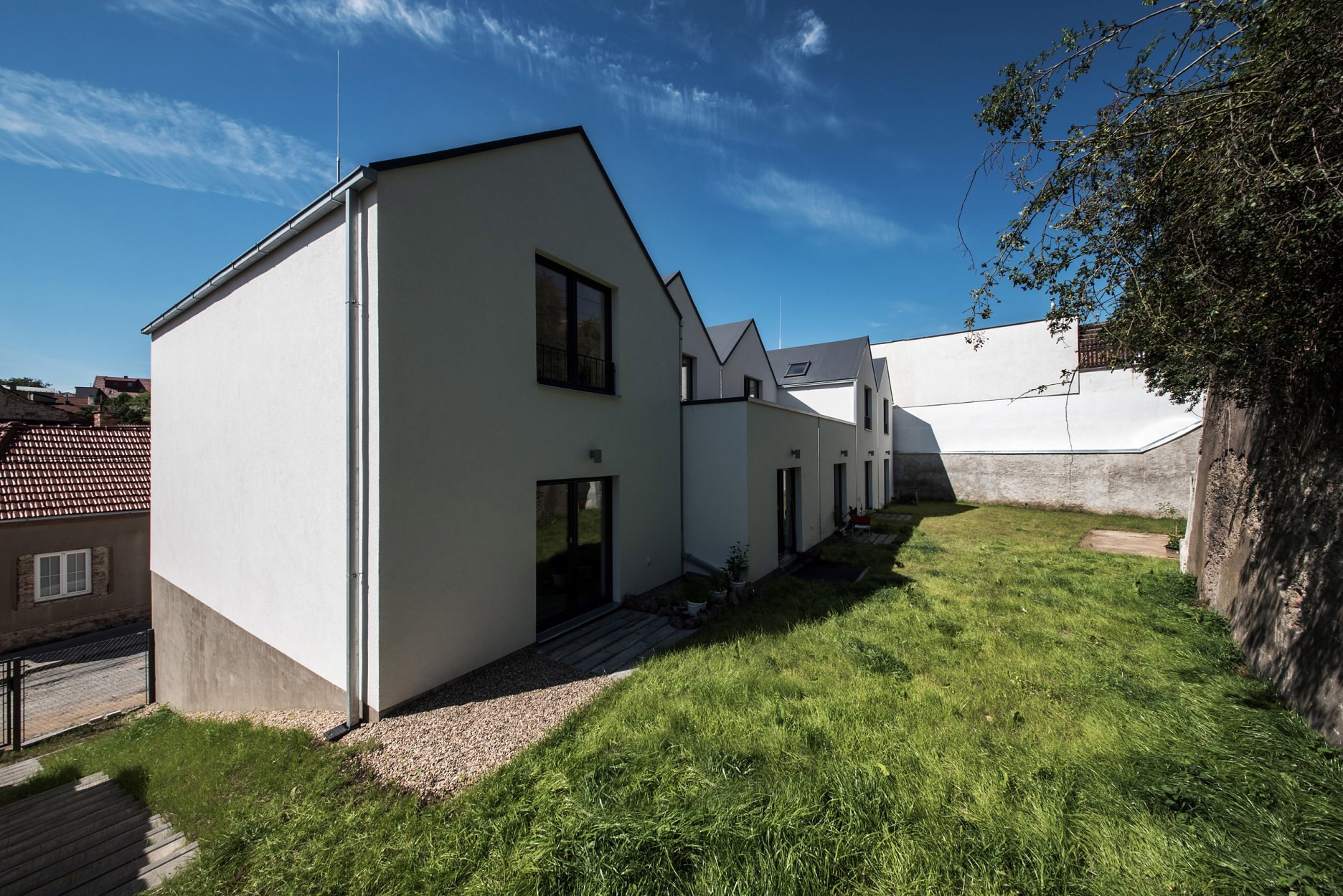 S respektem k charakteru lokality má objekt sedlové střechy, tvar, který se vyskytuje všude v okolí. Drobnějšího měřítka jsme dosáhli otočením jednotlivých domů, štíty do ulice. To jednak umožnilo dostat střešními okny slunce do zadních, horních místností a tím zajistit nutné proslunění bytů a zároveň dalo celému souboru dynamiku a přívětivý charakter. Jednotlivé byty - domy jsou logicky členěny i navázány na pavlač. U venkovního schodiště jsou větší, dva třípokojové byty, uprostřed menší, dva dvoupokojové (s budoucí možností rozšíření pokoje na terasu) a v koncové části jsou nad sebou dvě garsoniéry. Tím se na pavlači logicky rozmělňuje provoz i pohyb osob.