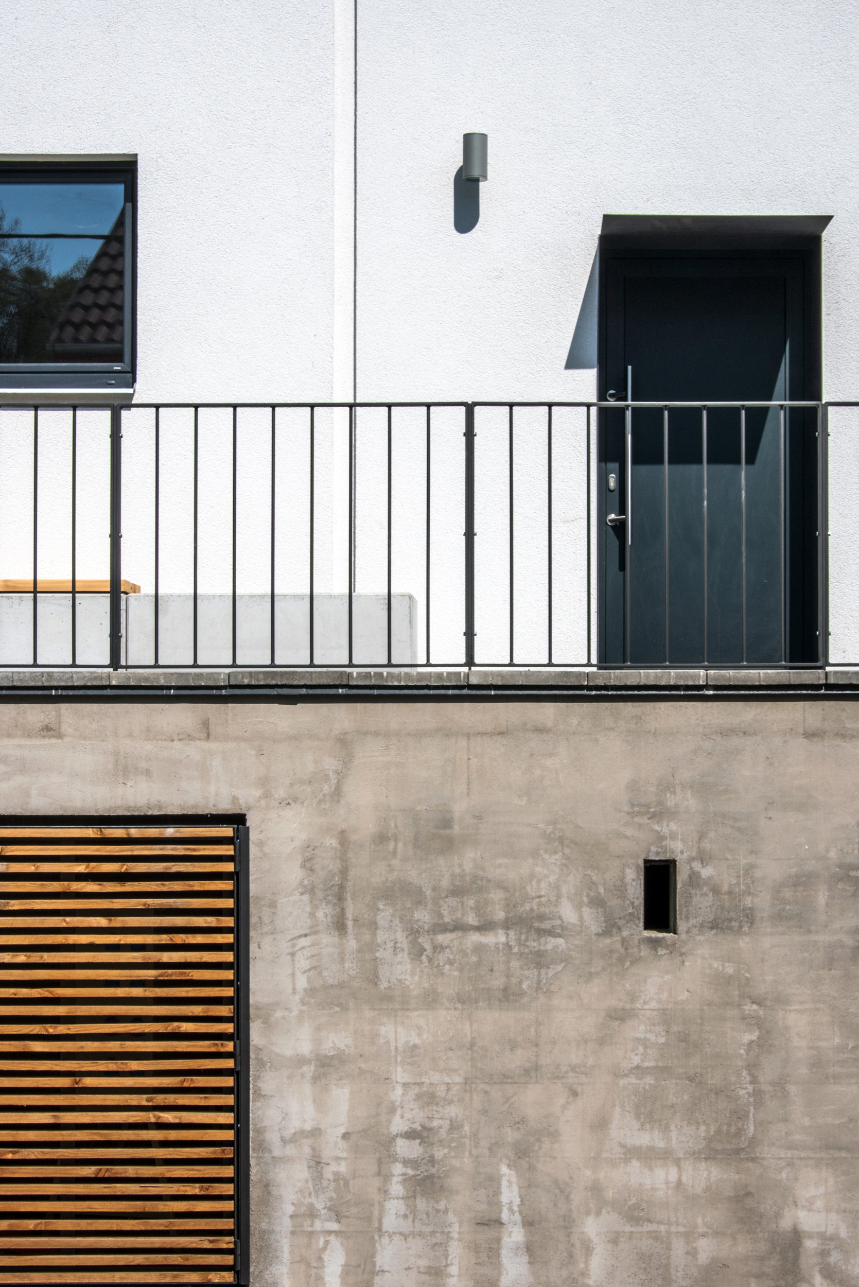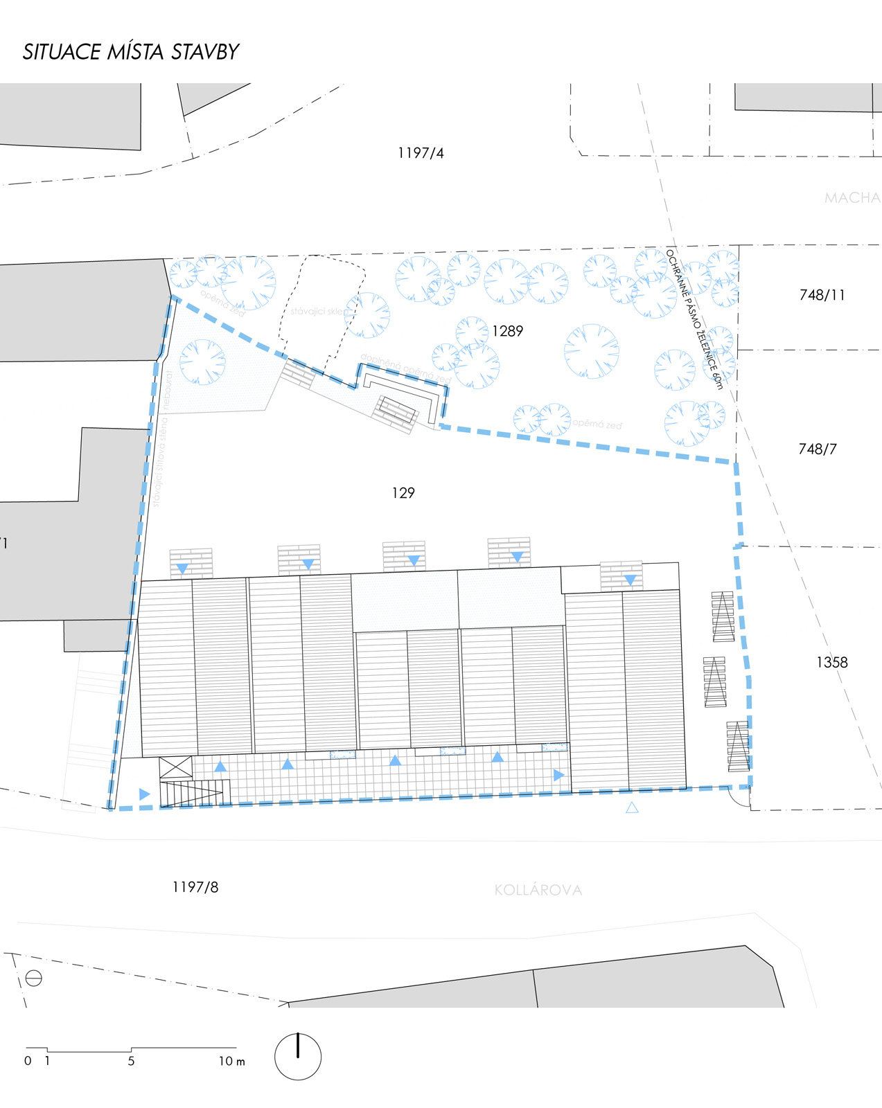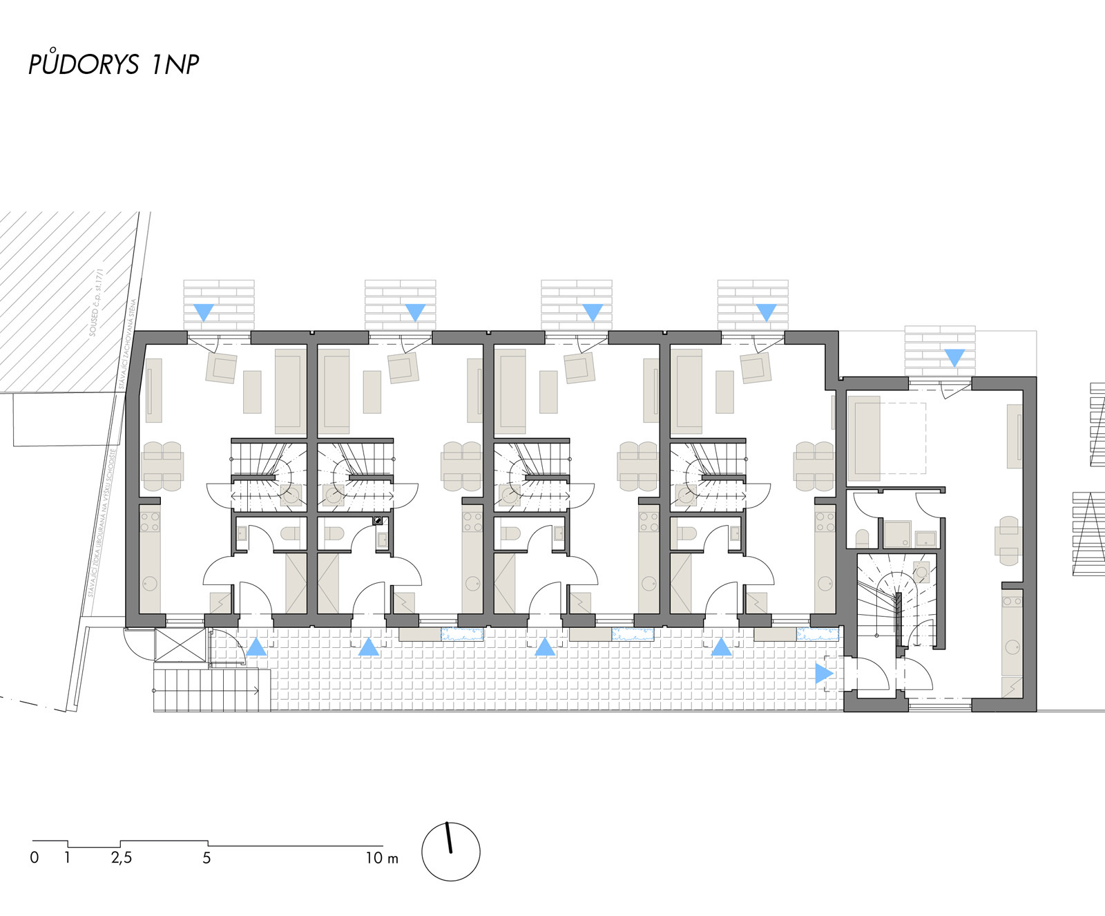 Do polozapuštěného suterénu, přístupného z ulice jsme umístili technické zázemí a garáže. Z této platformy vyrůstají jednotlivé domy-byty ustoupené o pavlač. Tuto pavlač jsme záměrně rozšířili a vytvořili z ní nejen komunikaci k jednotlivým vstupům do bytů, ale i poloveřejný prostor, který slouží k vzájemné interakci mezi obyvateli jednotlivých bytů. Obyvatelé se zde mohou setkávat se svými sousedy a vytvořit tak vzájemné vazby a vztahy. Interakci podporují i u vstupů umístěné lavičky s květinovými truhlíky, které si obyvatelé mohli sami osázet. Zároveň tyto bloky vytváří odstup od oken z kuchyní, orientovaných do pavlače.