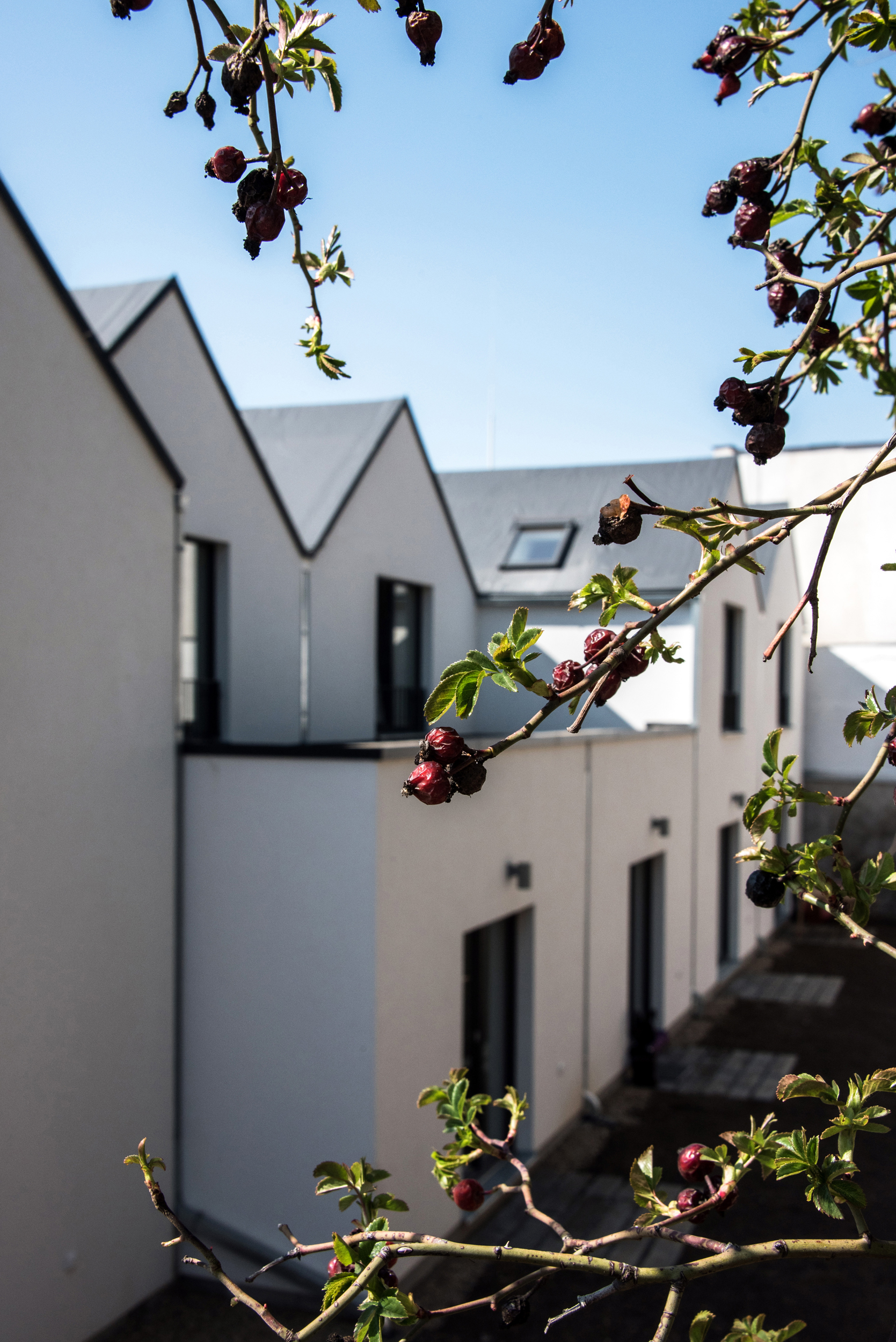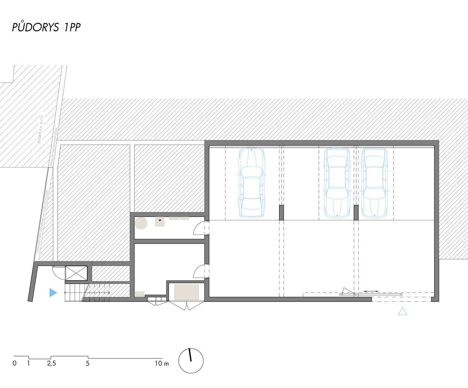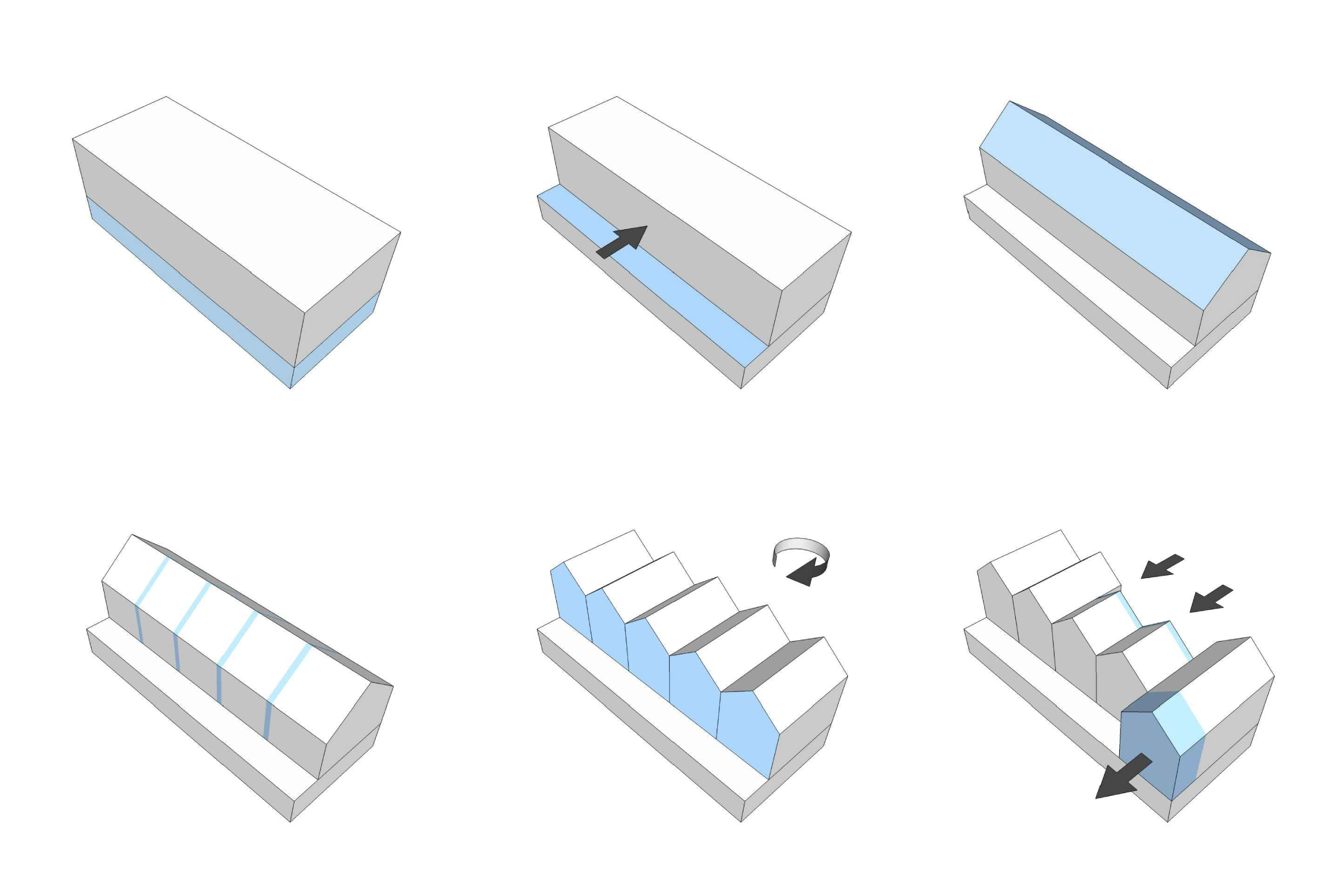 Do polozapuštěného suterénu, přístupného z ulice jsme umístili technické zázemí a garáže. Z této platformy vyrůstají jednotlivé domy-byty ustoupené o pavlač. Tuto pavlač jsme záměrně rozšířili a vytvořili z ní nejen komunikaci k jednotlivým vstupům do bytů, ale i poloveřejný prostor, který slouží k vzájemné interakci mezi obyvateli jednotlivých bytů. Obyvatelé se zde mohou setkávat se svými sousedy a vytvořit tak vzájemné vazby a vztahy. Interakci podporují i u vstupů umístěné lavičky s květinovými truhlíky, které si obyvatelé mohli sami osázet. Zároveň tyto bloky vytváří odstup od oken z kuchyní, orientovaných do pavlače.