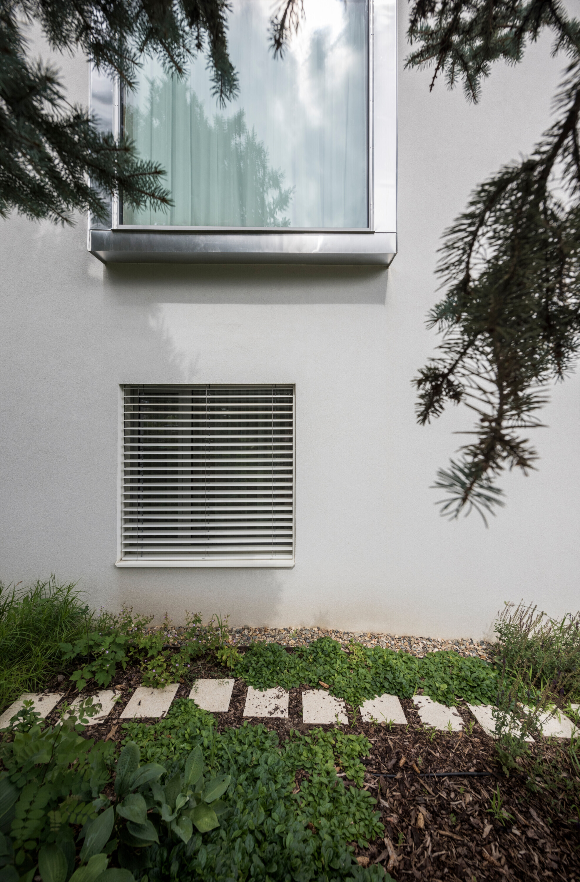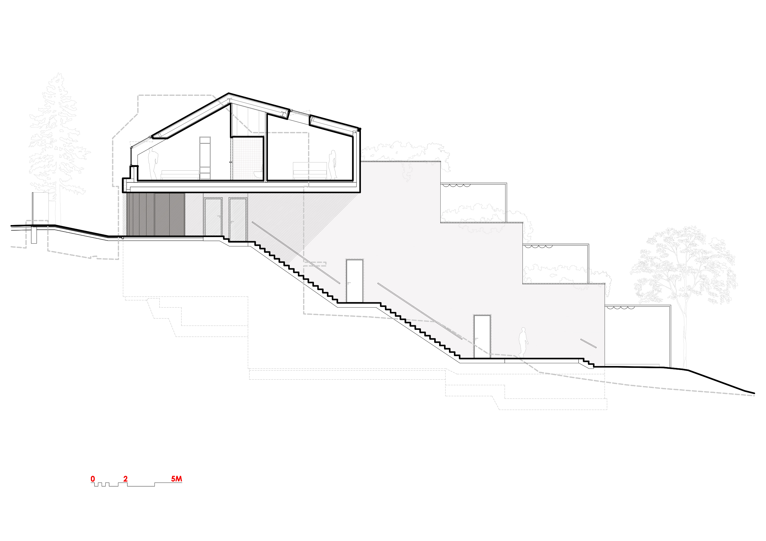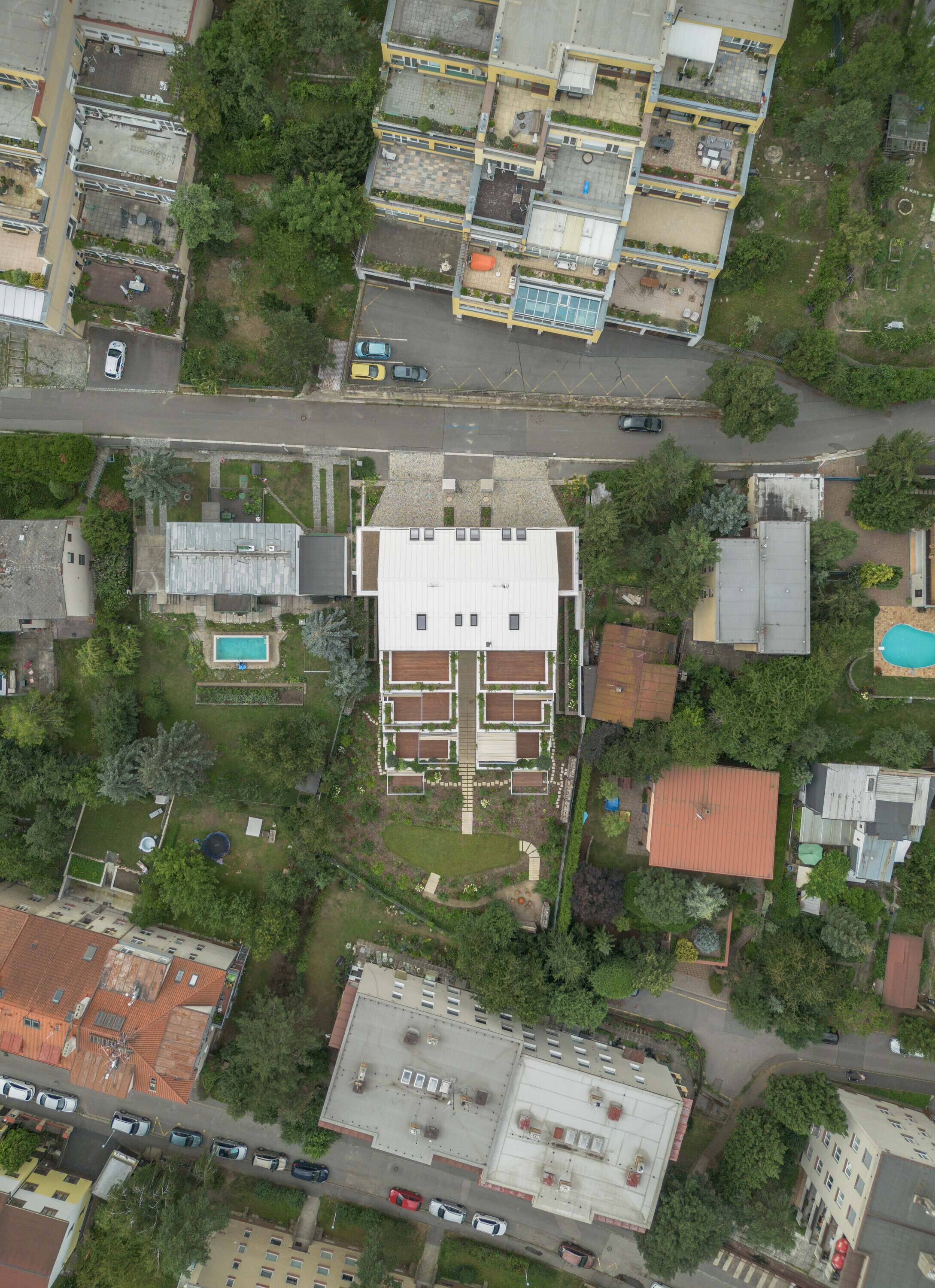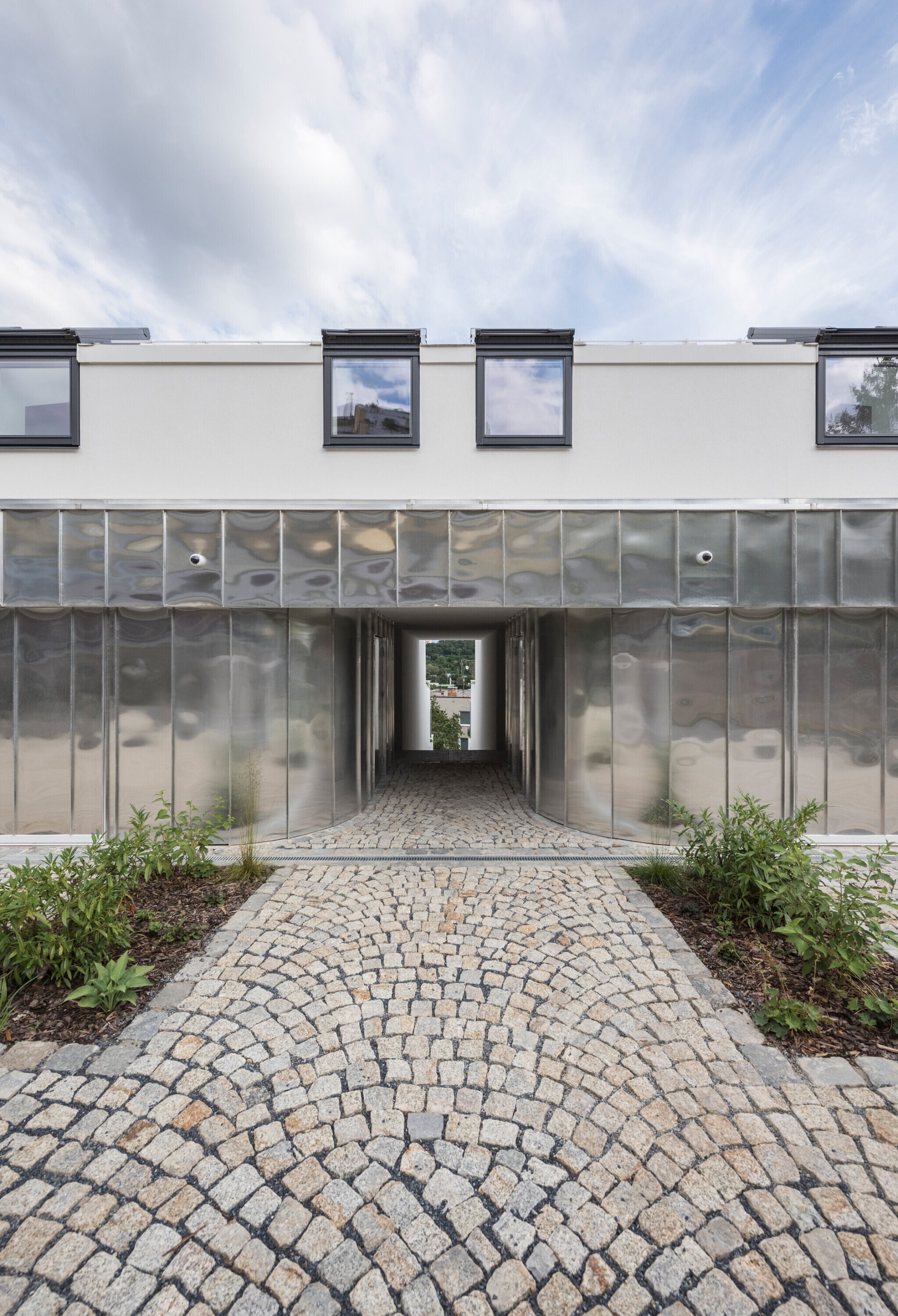Z ulice stavba pôsobí ako jednopodlažný objem so šikmou strechou, čím reaguje na bezprostredne susediace rodinné domy a nimi danú stavebnú čiaru aj výšku. S klesajúcim južným svahom stavba postupne rastie a odkazuje na terasové bytové domy, ktoré sa nachádzajú nad ňou. Dom má teda dve tváre – smerom do mesta a do zelene.