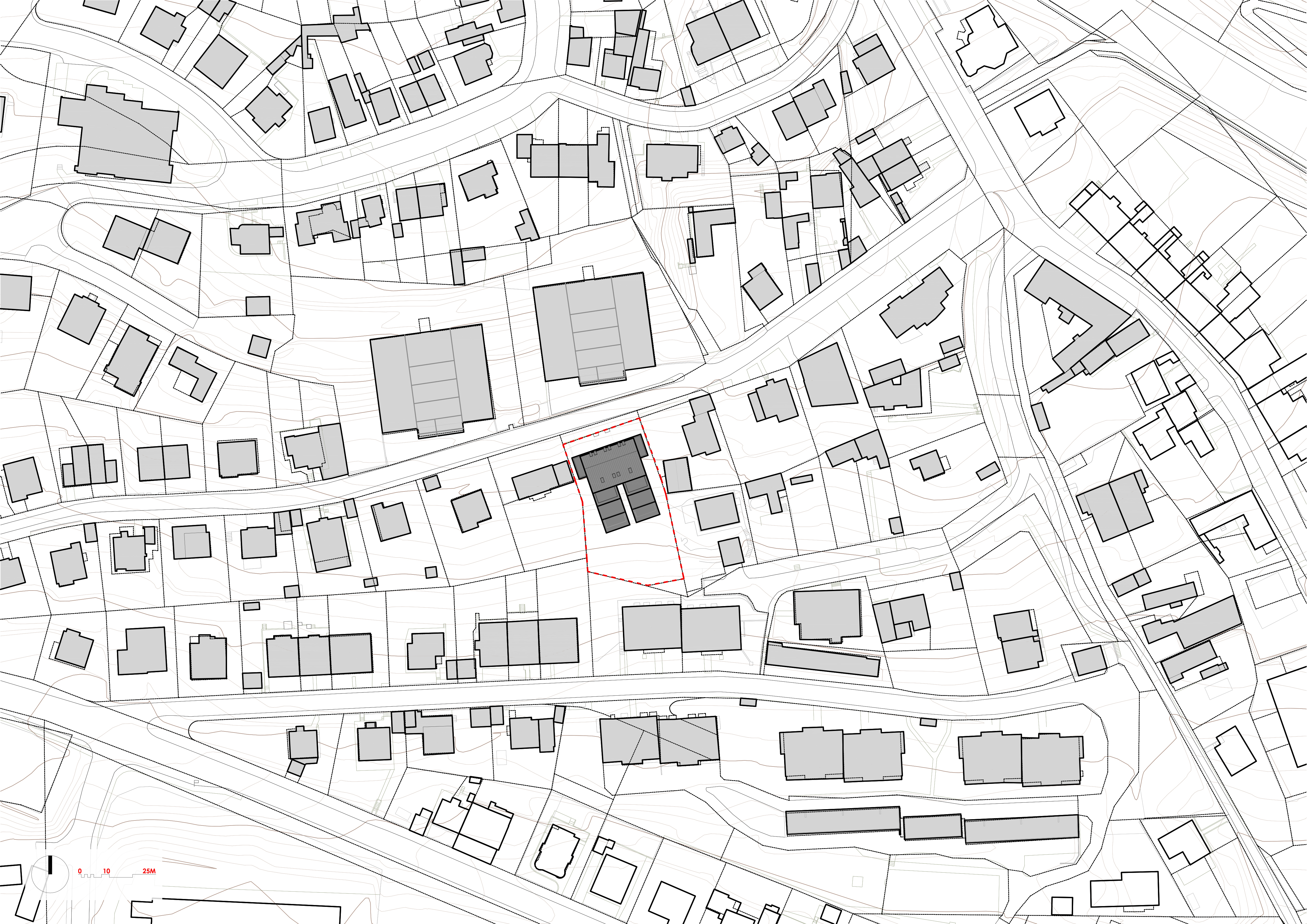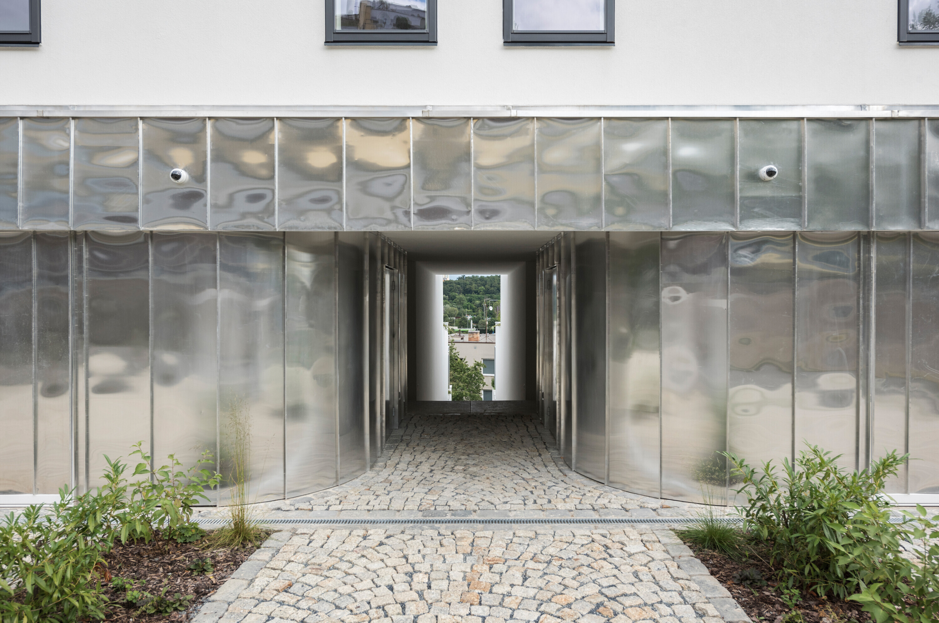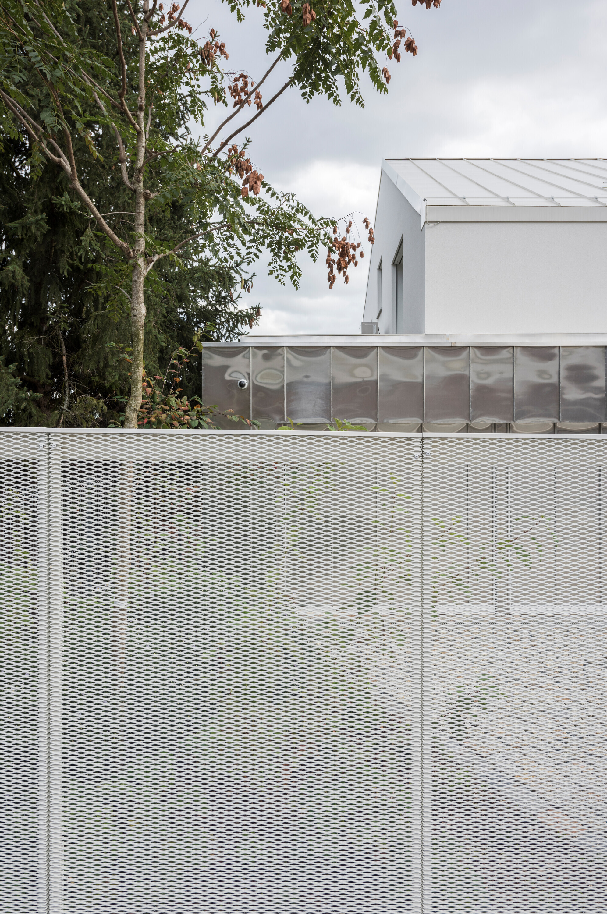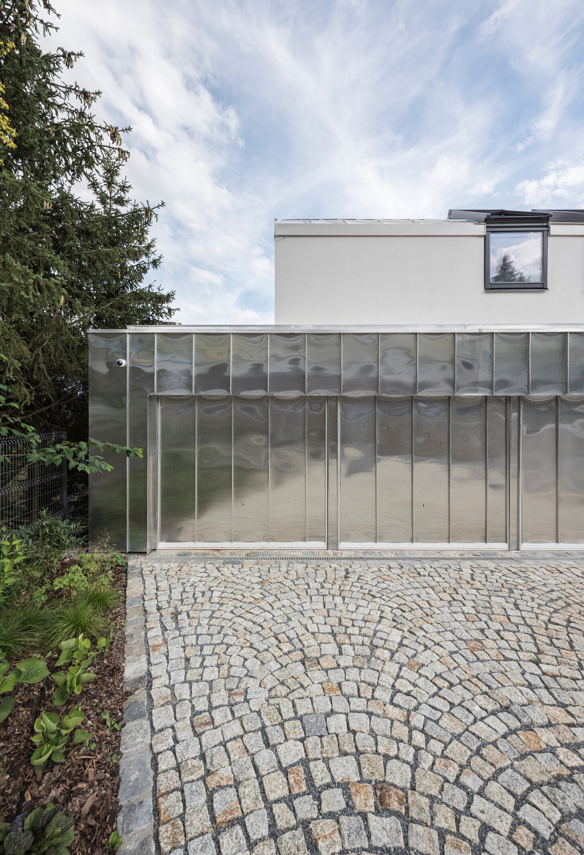 Z ulice stavba pôsobí ako jednopodlažný objem so šikmou strechou, čím reaguje na bezprostredne susediace rodinné domy a nimi danú stavebnú čiaru aj výšku. S klesajúcim južným svahom stavba postupne rastie a odkazuje na terasové bytové domy, ktoré sa nachádzajú nad ňou. Dom má teda dve tváre – smerom do mesta a do zelene.