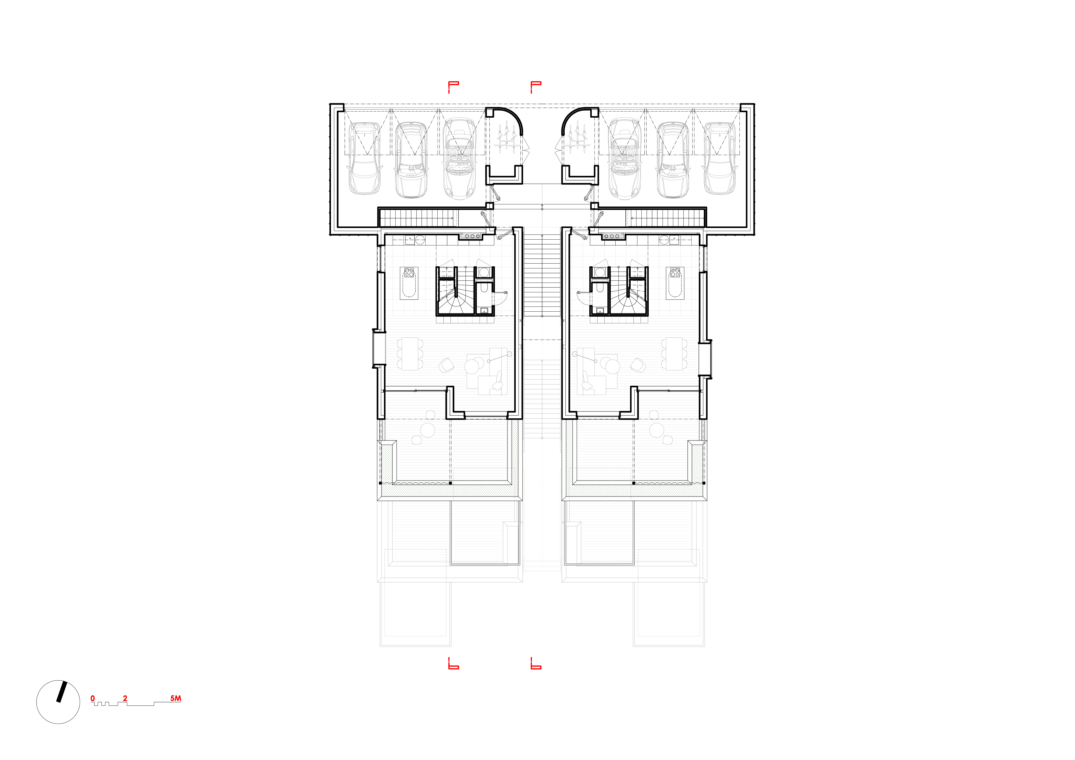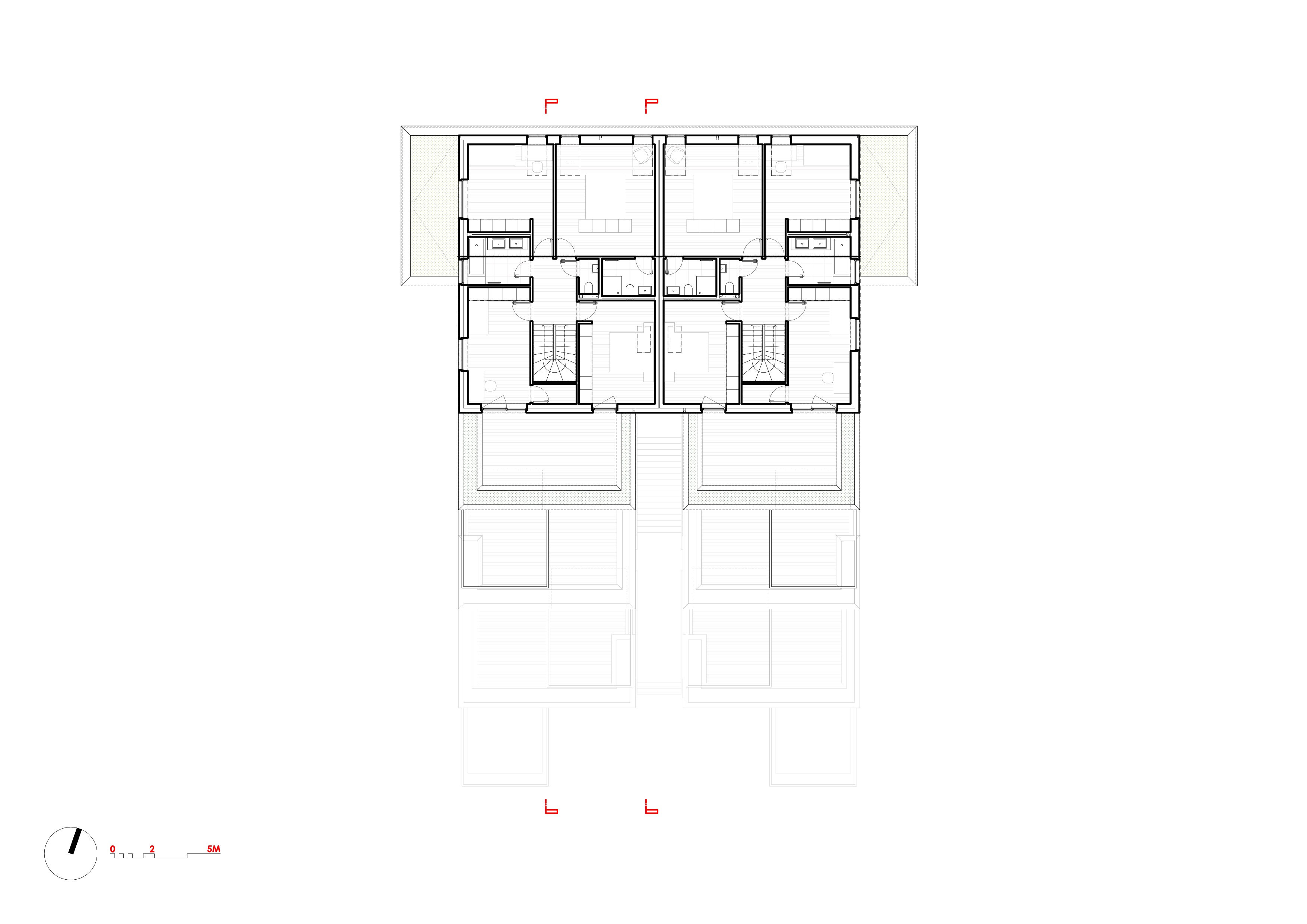 Vstupy do bytov sú riešené z vonkajšieho schodiska, ktoré pretína dom v osi medzi oboma sekciami, a je čiastočne prekryté objemom podkrovia. Výrazný rez hmotou stavby zároveň prepája ulicu a záhradu, ktorá je takmer o 8 metrov nižšie. Riešenie prevádzky inšpirovali klasické činžiakové vily: každý z dvojice zrkadlovo riešených domov obsahuje tri väčšie bytové jednotky (4+kk, 3+kk + mezonetové 5+kk) so samostatnými vstupmi a spoločné zázemie s pivnicami, garážami a bicyklárňami. Záhrada s ohniskom a vzrastlou zeleňou (pôvodnou aj novovysadenou) je spoločná.