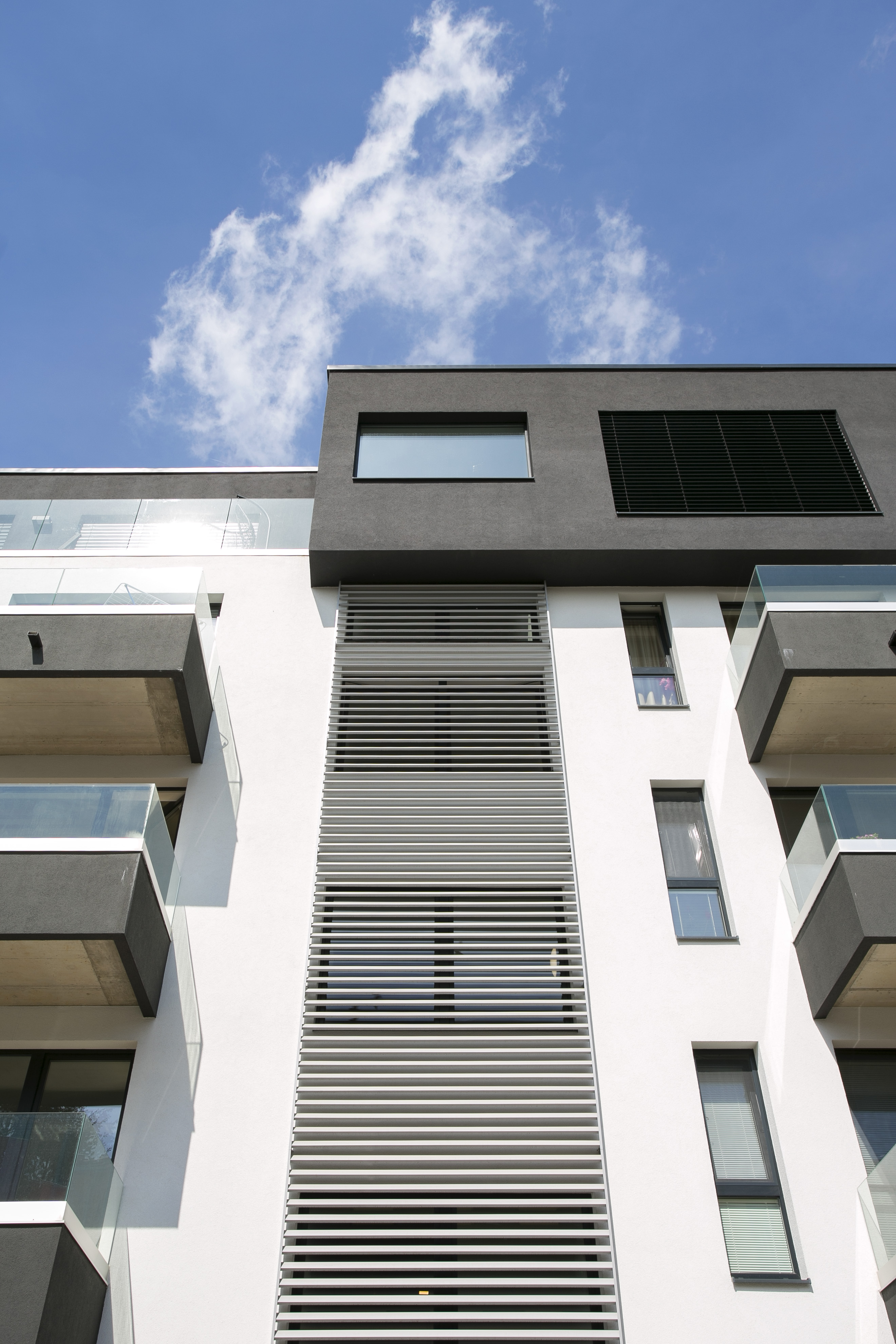 "Hlavným zámerom bolo malé byty opticky zväčšiť o exteriér a 'priniesť' do nich veľa svetla. Preto sme zvolili nadštandardne veľké okná so zníženými parapetmi, kde horizontálny predel tvorí zábranu proti prepadnutiu. Aby sme do bytov na západnej fasáde dostali aj zapadajúce slnko, umiestnili sme sem lodžie s rohovými oknami smerované na západ. Na zvyšných fasádach sú vystupujúce balkóny doplnené o decentné zábradlie z bezrámového skla. Pri vstupe do objektu je po celej výške oceľová lamelová konštrukcia, ktorá nabúrava uniformitu objektu a súčasne prekrýva okná na schodisku," opisuje architekt.