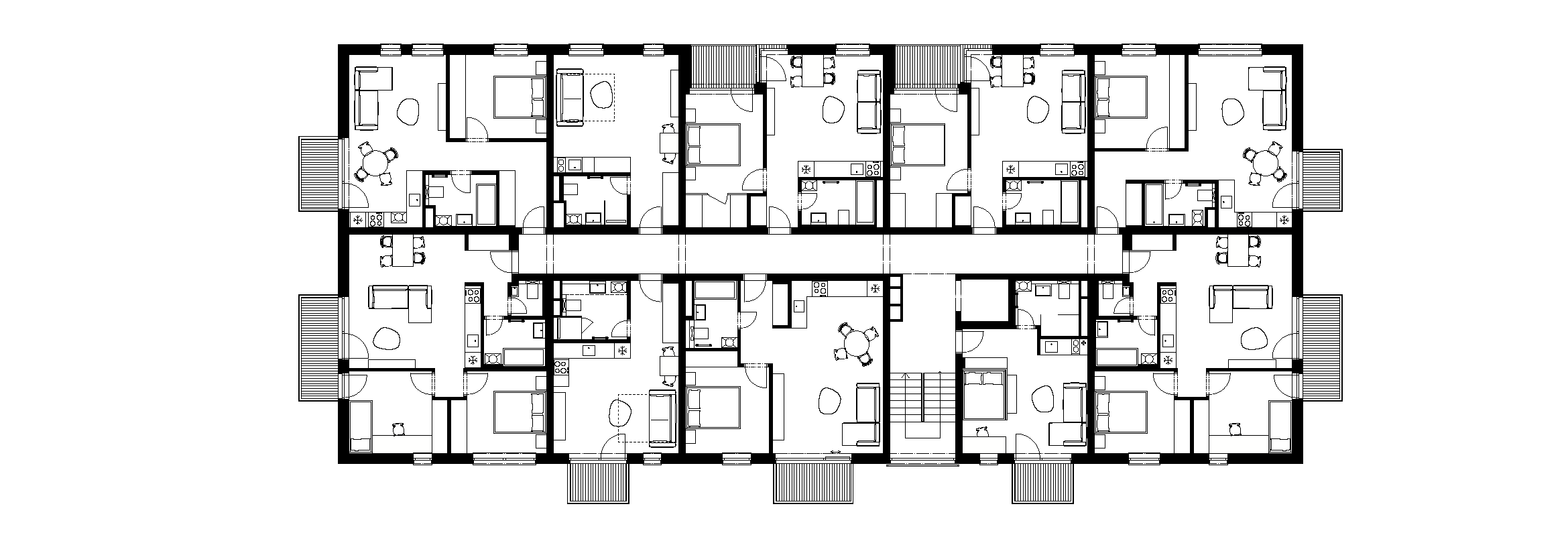 Byty napriek menším plošným výmerám pôsobia vďaka otvorenej dispozícii a rozsiahlemu zaskleniu celkom priestranne. Medzi ne patrí aj zrkadlová dvojica trojizbových bytov s výmerou 58m2, ktoré architekti umiestnili na každé poschodie. Tie prekvapivo, aj napriek svojej veľkosti poskytujú slušné množstvo úložného priestoru. Ostatné menšie byty sú riešené s dôrazom na väčšiu spoločenskú časť.