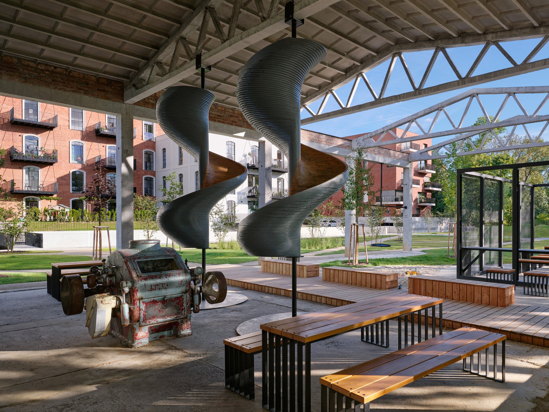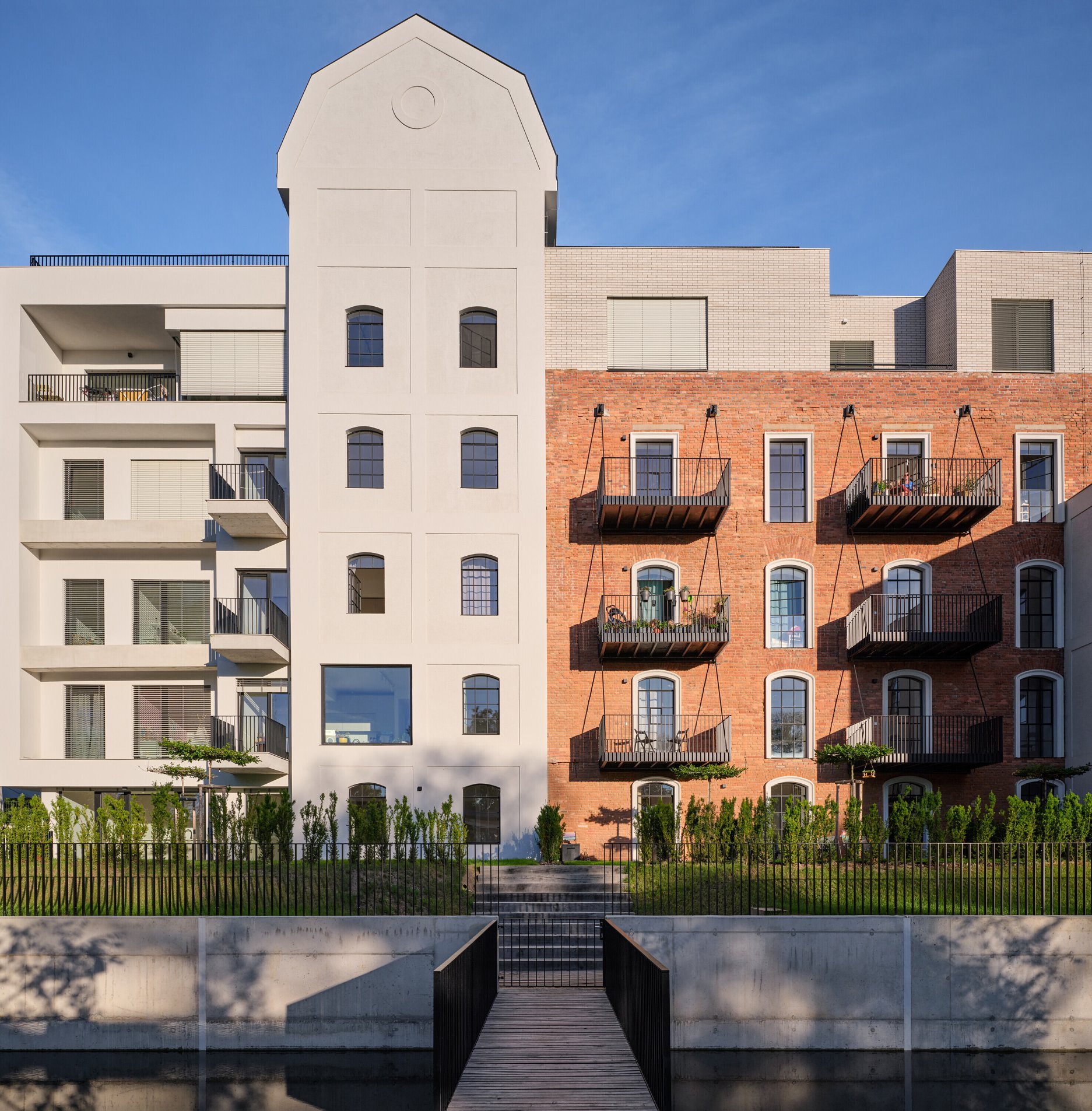 Konverzia areálu je založená na využití pôvodných stavieb. Projekt dopĺňajú zelené strechy a hospodárenie s dažďovou vodou, ktorá napája obnovený kanál.