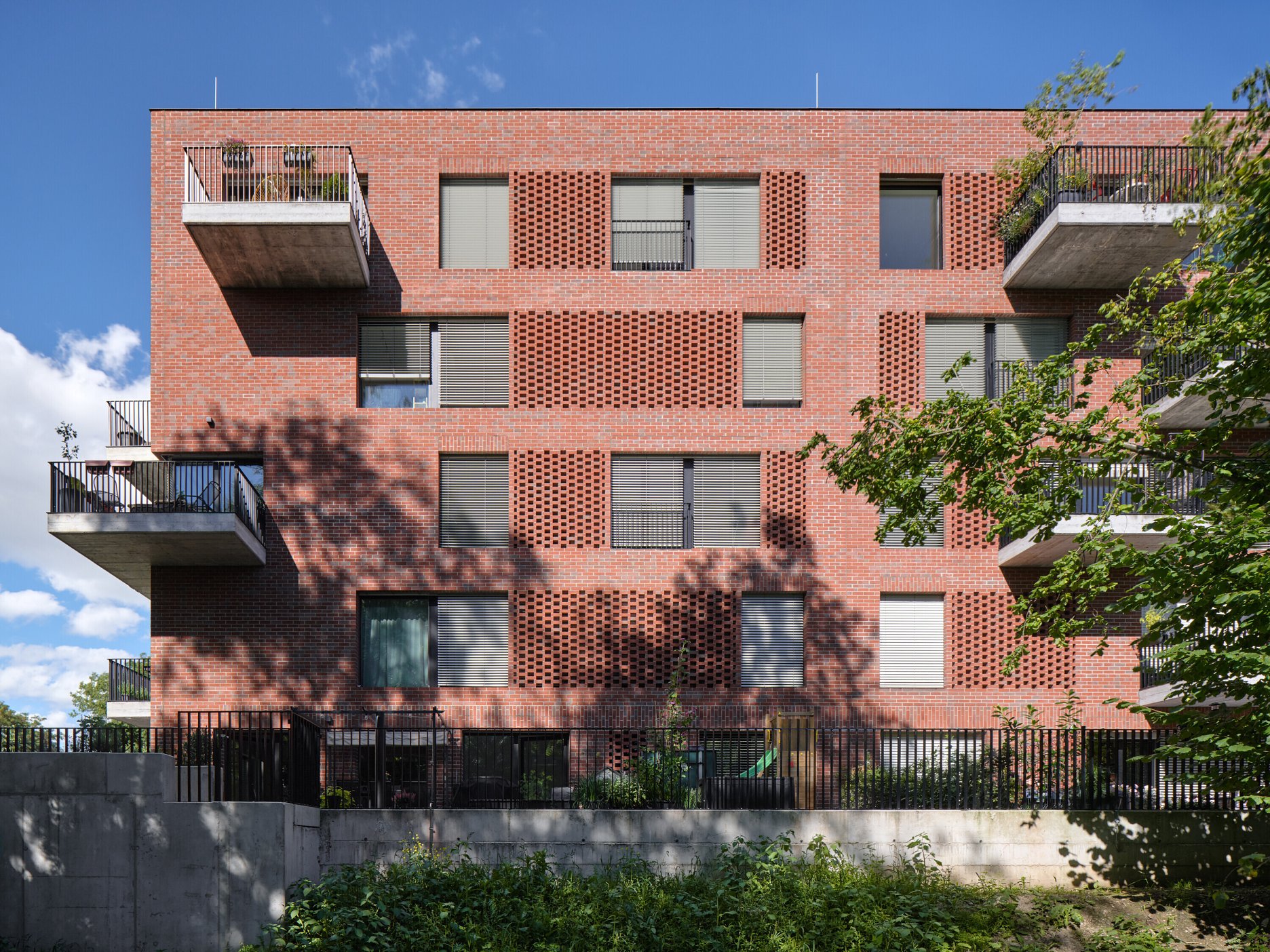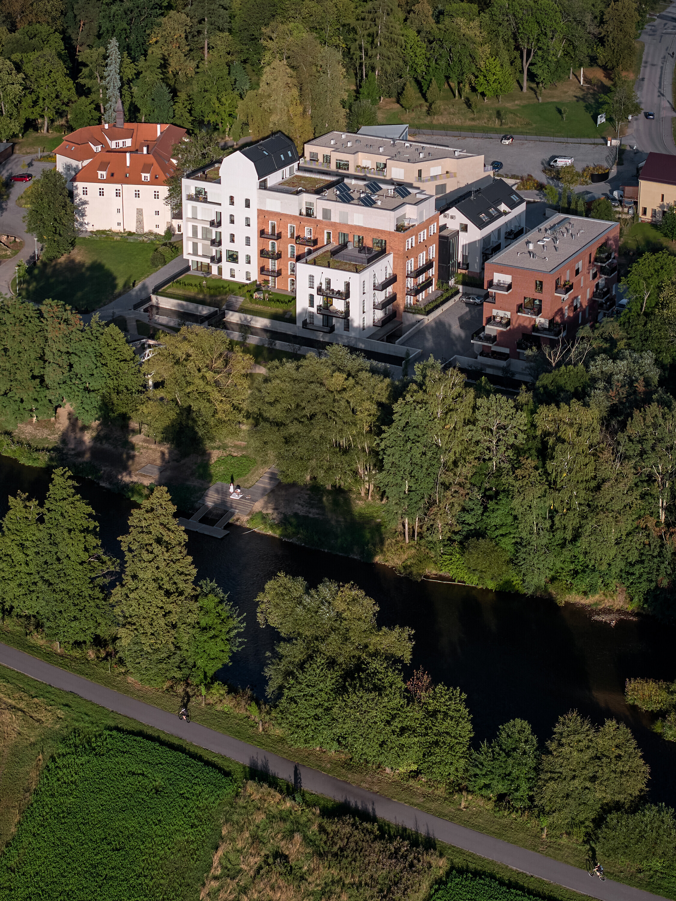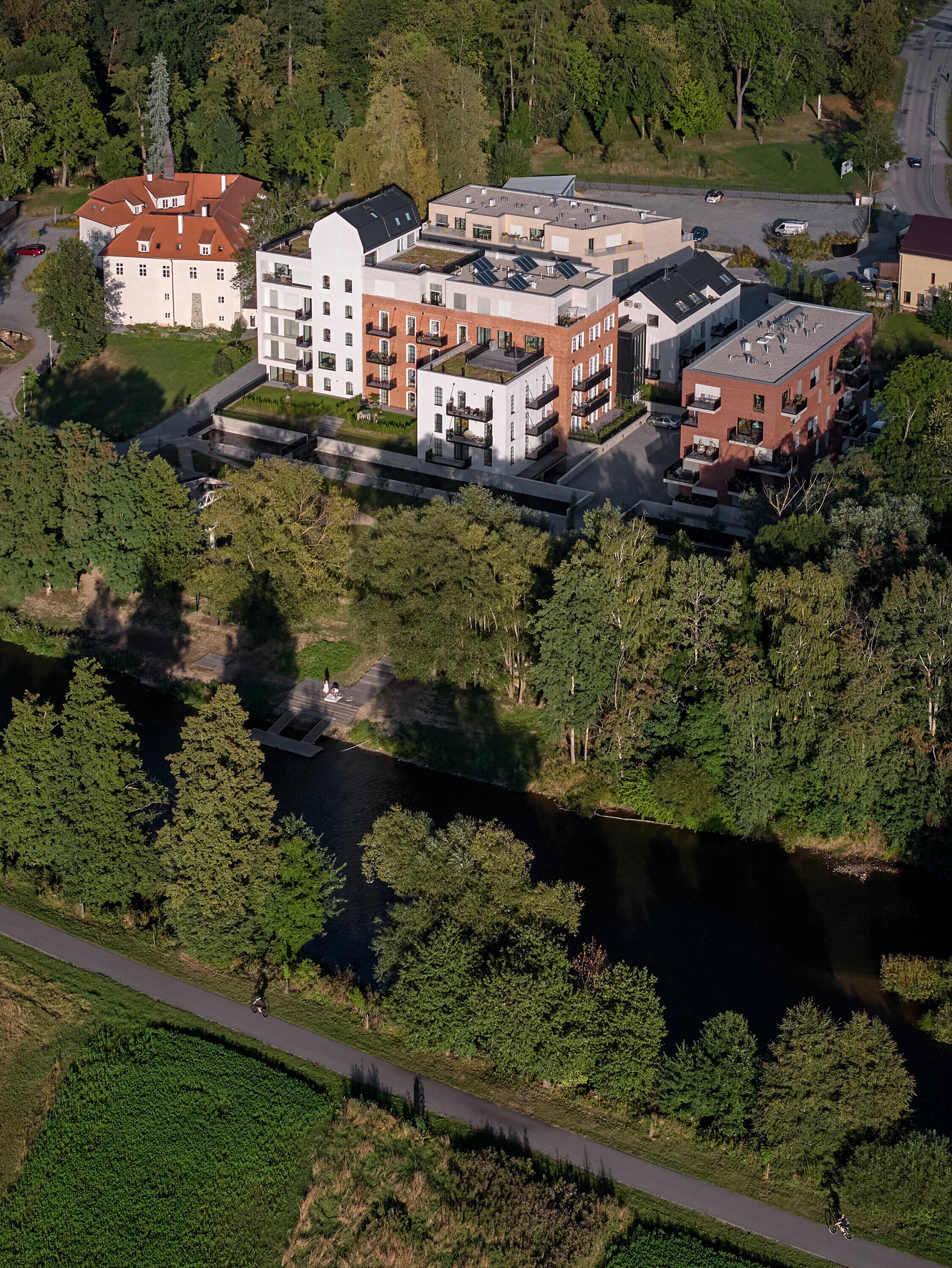 Druhá novostavba stojí pri náhone a rieke. Jednoduchý päťpodlažný kváder charakterizuje fasáda z červenej režnej tehly, rozmerné francúzske okná a kombinácia lodžií a balkónov. Svojím riešením nadväzuje na polohu pri rieke.