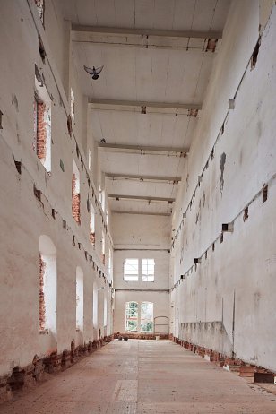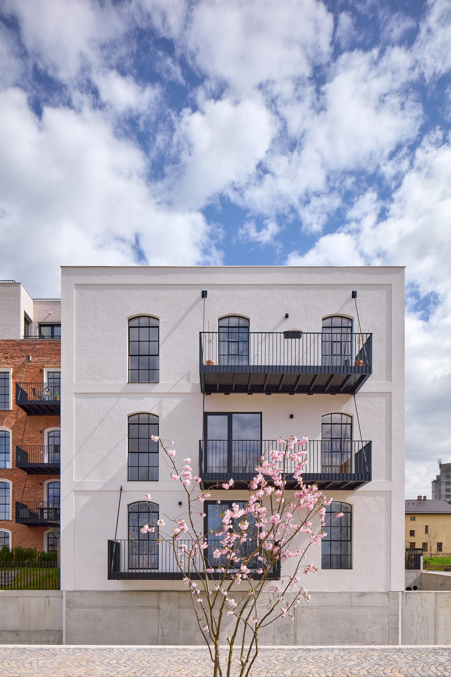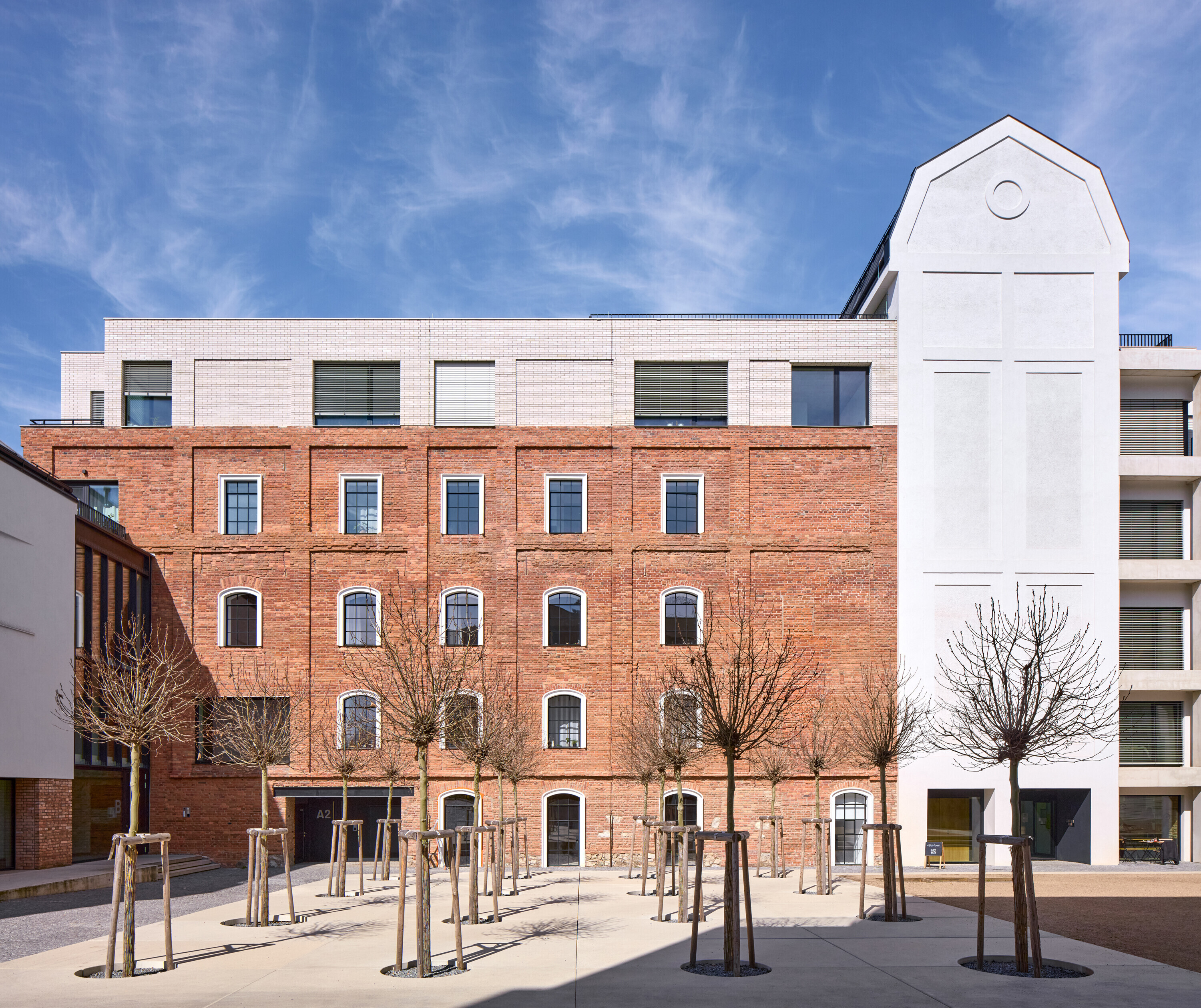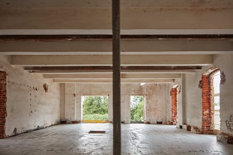 Kolmá dvojpodlažná stavba pôvodnej správnej budovy dostala nový tehlový sokel a svetlú omietku. Byty tu majú podobnú skladbu ako v sile a sú doplnené o balkóny. Obe historické budovy prepája nové vertikálne komunikačné jadro zo skla a čierneho plechu, ktoré je zreteľne čitateľným súčasným zásahom.