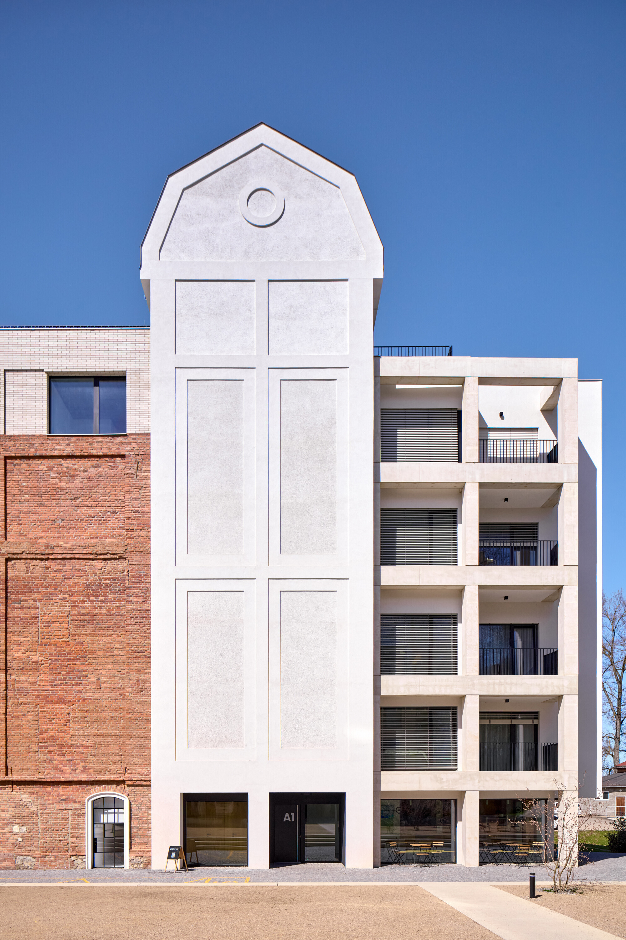 Päťpodlažné silo architekti očistili až na režné murivo a zbavili ho nepôvodných prístavieb aj pultovej strechy. Nové nadstavbové podlažie zo svetlej tehly je od pôvodného objemu ustúpené. Okná sú riešené ako repliky industriálnych oceľových výplní. Na fasáde orientovanej k rieke pribudli čierne oceľové balkóny. Výraznou zmenou prešla centrálna veža, v ktorej vznikol loftový byt. Železobetónová konštrukcia zastrešila vežu a vytvorila priestor s terasami. Strecha je riešená ako zelená a je súčasťou ekologického konceptu areálu.