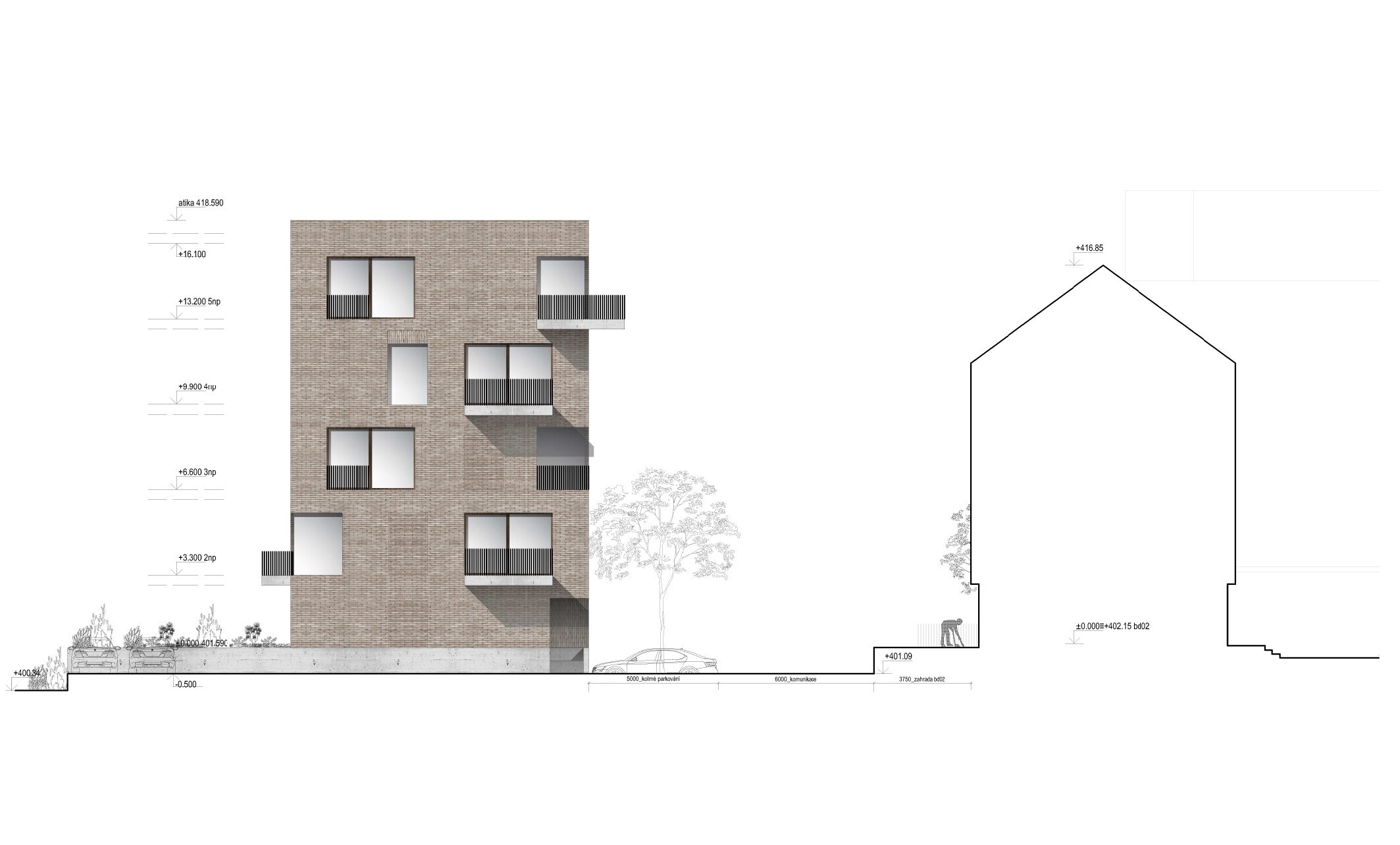 Dom uzatvárajúci námestie je navrhnutý ako trojpodlažná stavba so svetlou tehlovou fasádou, bielymi kovovými prvkami a plochou strechou. Od historických budov sa zámerne odlišuje. Namiesto balkónov ponúka lodžie a terasy.