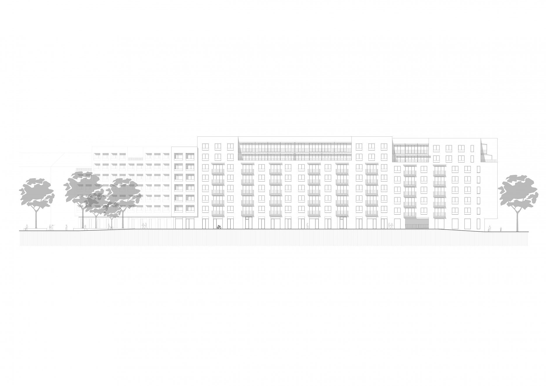 Základné hmotové riešenie bloku do veľkej miery definujú svetlotechnické limity v území. Architektonické stvárnenie kompaktného objemu charakterizuje artikulácia fasád prostredníctvom segmentov lodžií a balkónov, ktorých poloha a rozsah reflektuje charakter okolia. Smerom do námestia a rušnej ulice Košická je orientovaný lodžiový systém. Balkónový systém smeruje do kľudnejšieho vnútrobloku a bočnej slepej komunikácie. Na uličnej fasáde od Košickej zároveň kompozične dopĺňa rytmus lodžiového systému.
