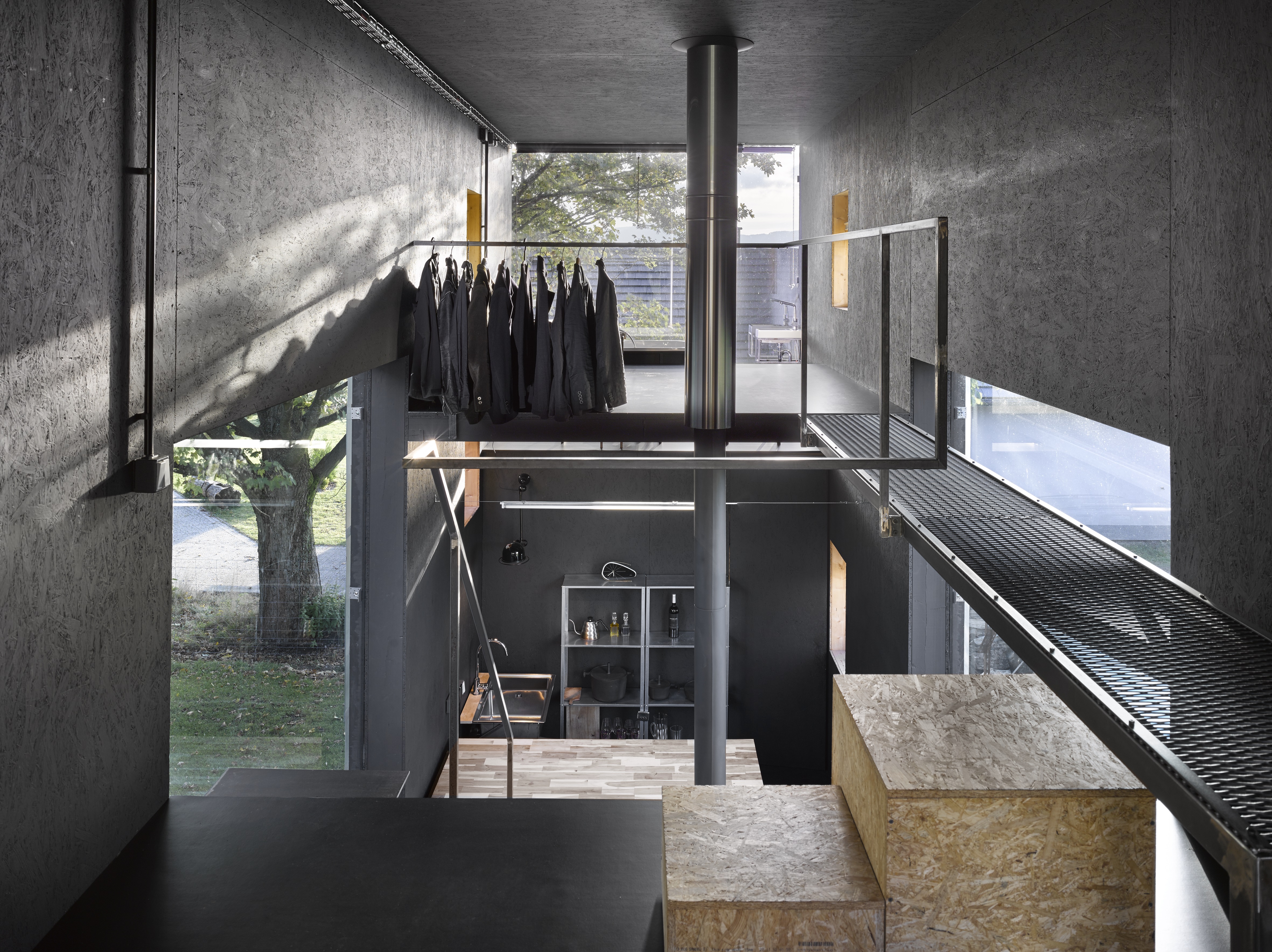 Rodinný dům v ostrém svahu a s panoramatickým výhledem a minimálním dopadem na zahradu. Dřevěné struktury, betonový základ a „jedna noha“. Dům zvenku izolovaný polyuretanem, uvnitř s přiznanou dřevěnou vrstvou. Poetický a organický, praktický a přírodní, ekonomický a vysoce obytný.