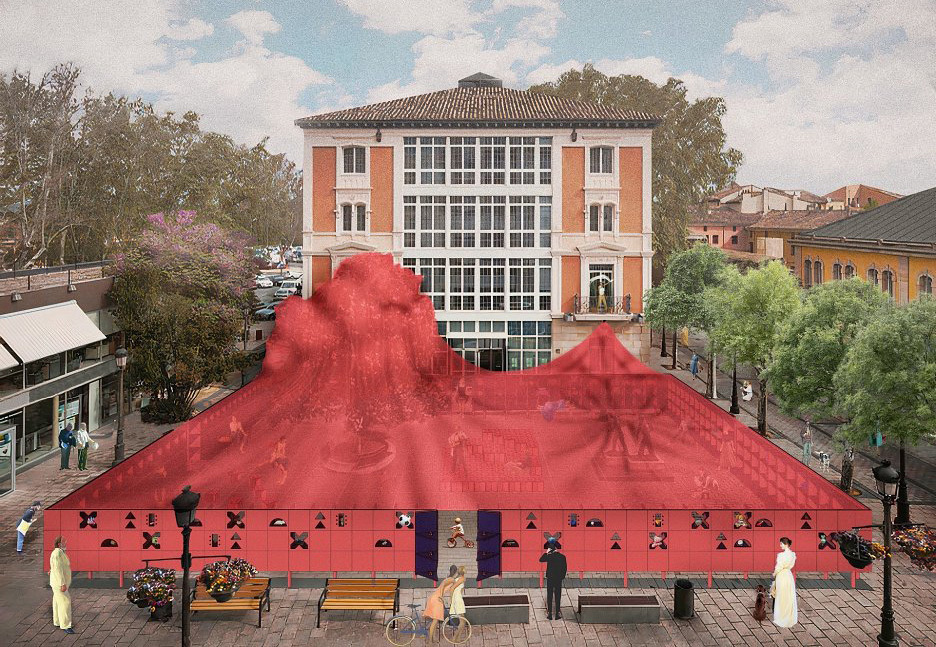 Fyzický priestor pavilónu vytvára útulnú a intímnu „mestskú obývačku“ pokrytú textilným baldachýnom, ideálnu na každodenné neformálne stretnutia, kultúrne vystúpenia a komunitné stretnutia. Geometria danej „urbánnej obývačky“ je vymedzená vzorom dlažby samotného námestia, ktorý vizuálne usmerňuje návštevníka.