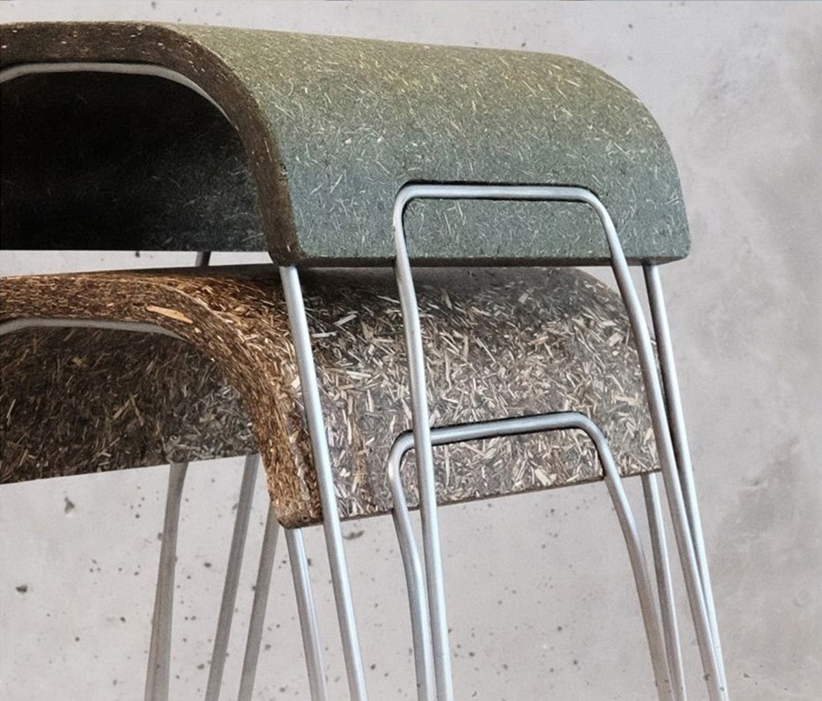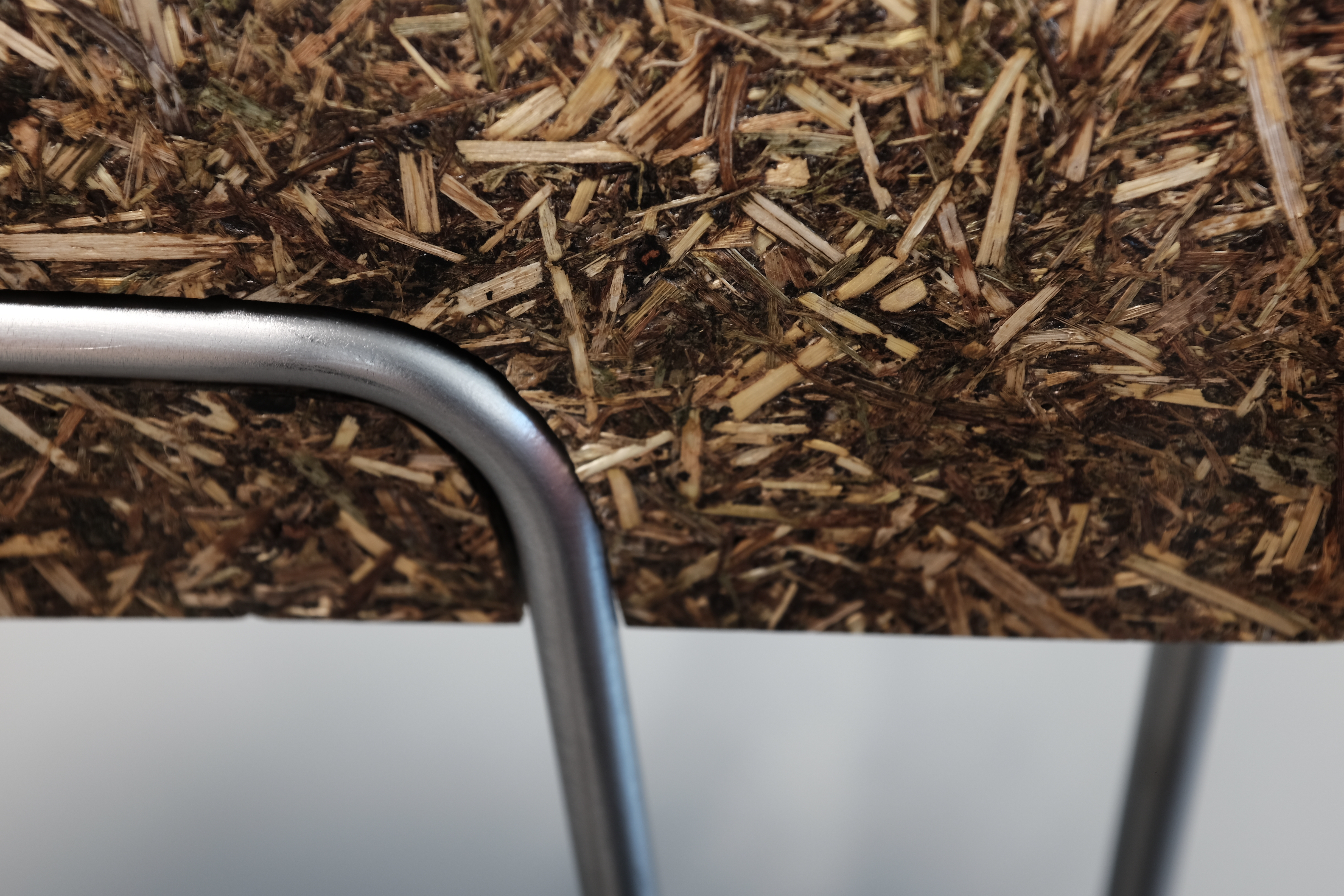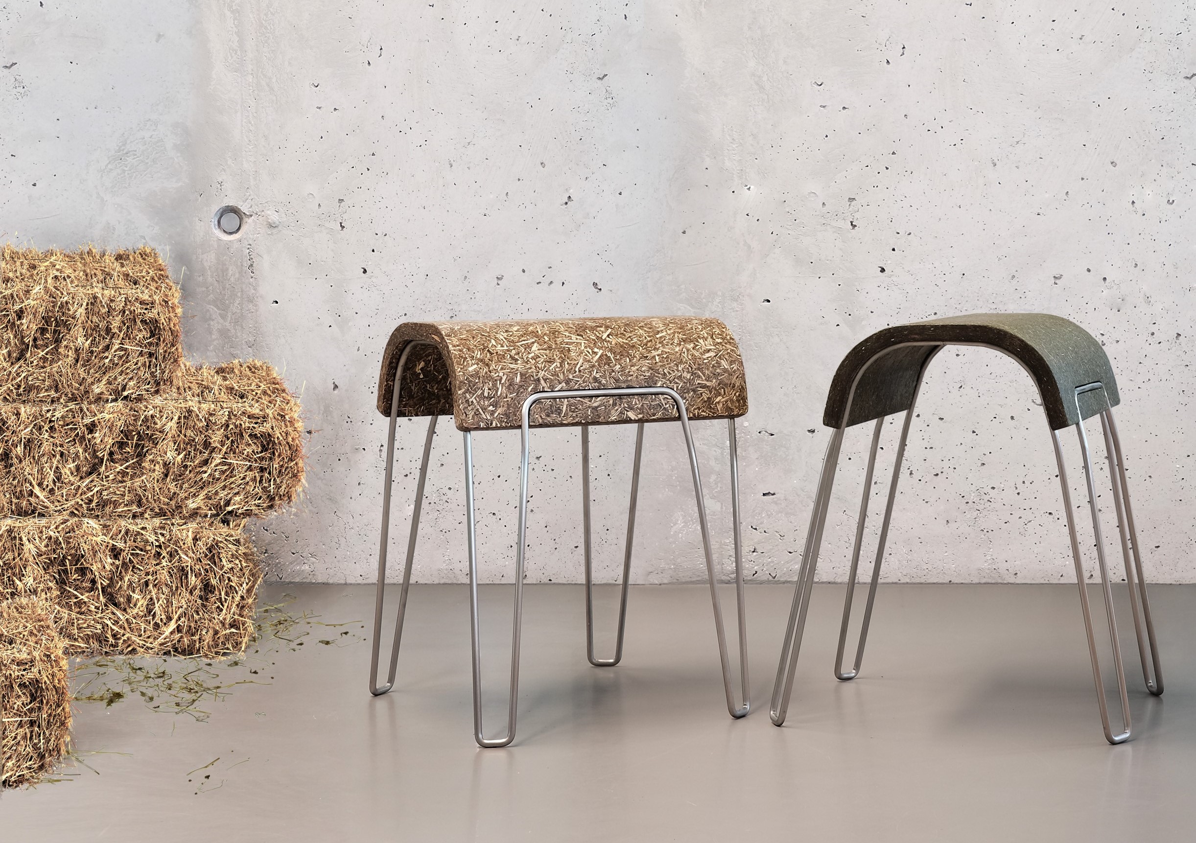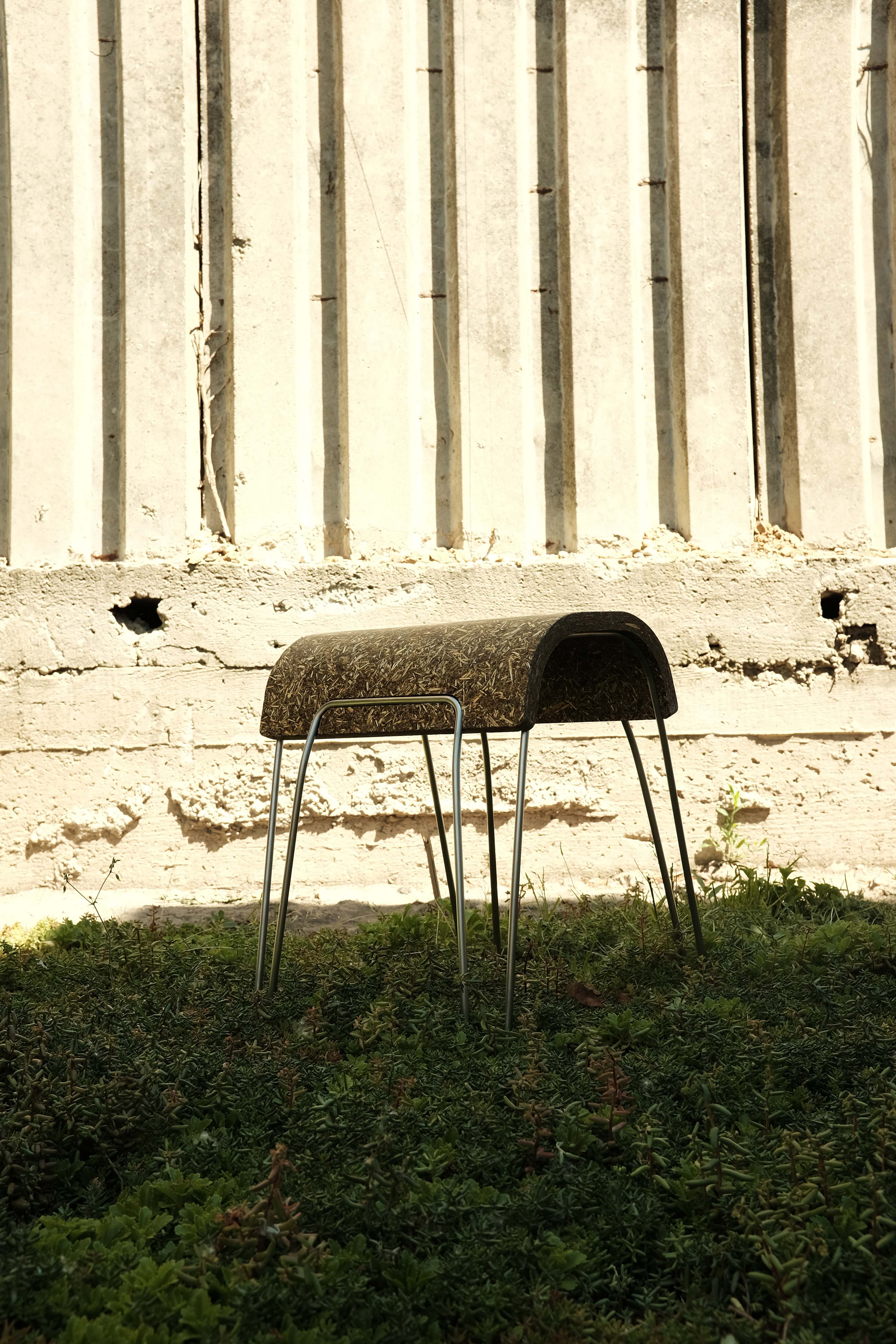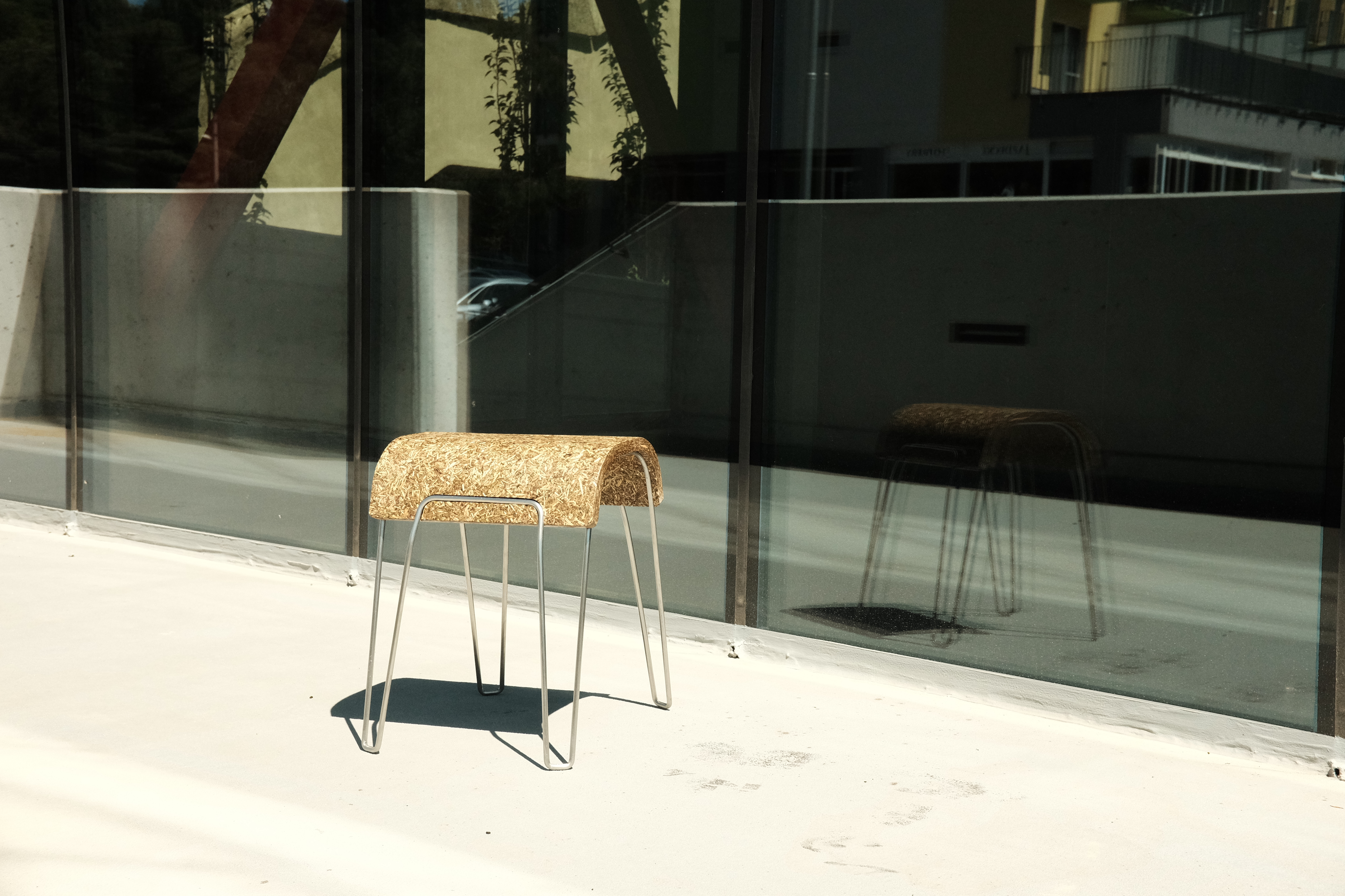 Stolička, ktorá je určená na krátkodobé sedenie do verejných priestorov nás zaujala vzhľadom, estetikou prírodného kompozitného materiálu a ergonómiou. Stolička sa skladá z dvoch častí - sedáku z lisovaného sena zmiešaného s eko pojivom a z podnože z tvarovaného nerezového drôtu. Jednoduchosť riešenia podporuje predpäté tvarové ("suché") spojenie oboch prvkov s možnosťou využitia stohovania.