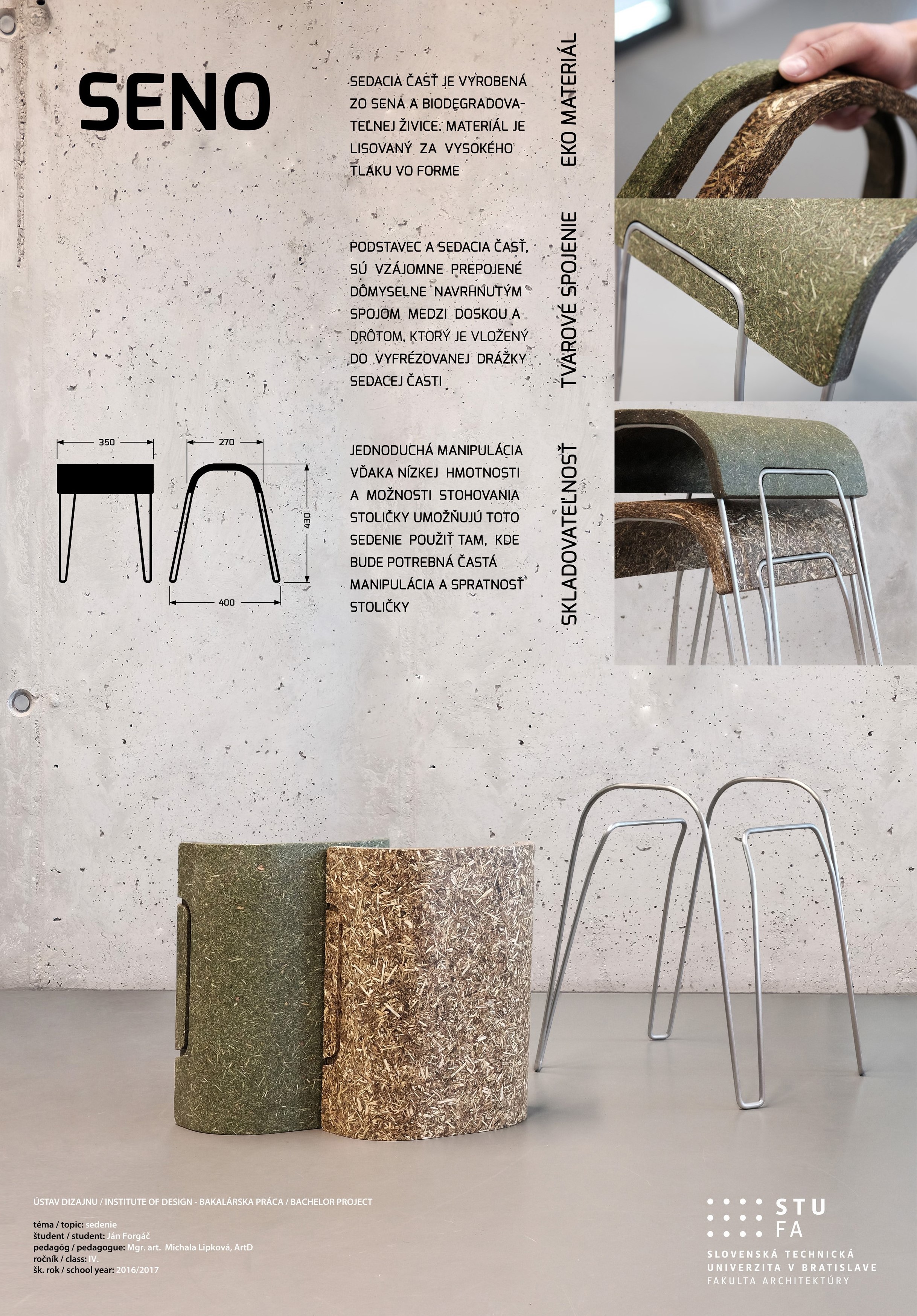 Existuje veľa dôvodov, prečo by bolo viac než prospešné nájsť pre tento materiál nové využitie. Spracovaním sena technologickým procesom, ktorý spočíva v lisovaní sena zmiešaného s ekologickým pojivom, vzniká biomasa, ktorú je možné tvarovať do najrozličnejších foriem. V tejto práci je použitá na sedaciu časť minimalistickej taburetky. Jej tvar bol inšpirovaný lúkou, presnejšie kopcom alebo terénom krajiny. Tvar je jednoduchý, zachováva v sebe čistotu prírody samotnej. Slamená sedacia časť je tvarovo spojená s oceľovými drôtmi, ktoré vytvárajú nohy stoličky. Už v minulosti boli tieto dva materiály prepojené. Všetky pracovné činnosti na lúkach boli vykonávané pomocou nástrojov ako sú kosy, vidly a hrable. Okrem drevených nástrojov sa neskôr používali práve tie kovové. Boli pevnejšie a odolnejšie. Z určitého pohľadu by kombinácia týchto dvoch materiálov mohlo pripomínať aj toto spojenie lúky s ľudovými nástrojmi.