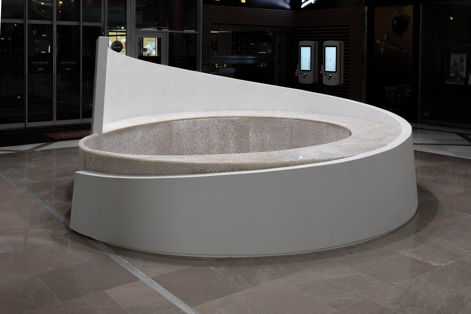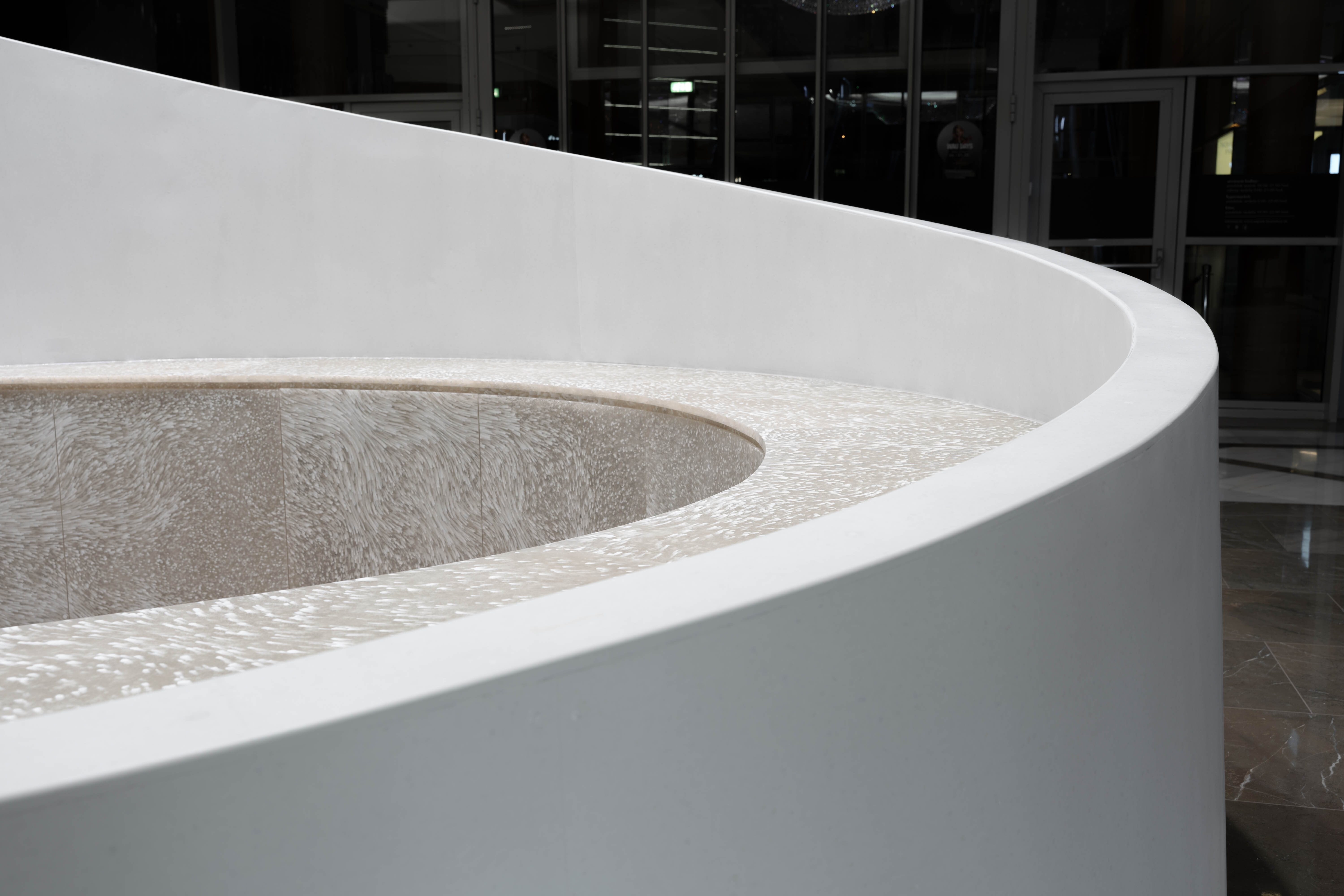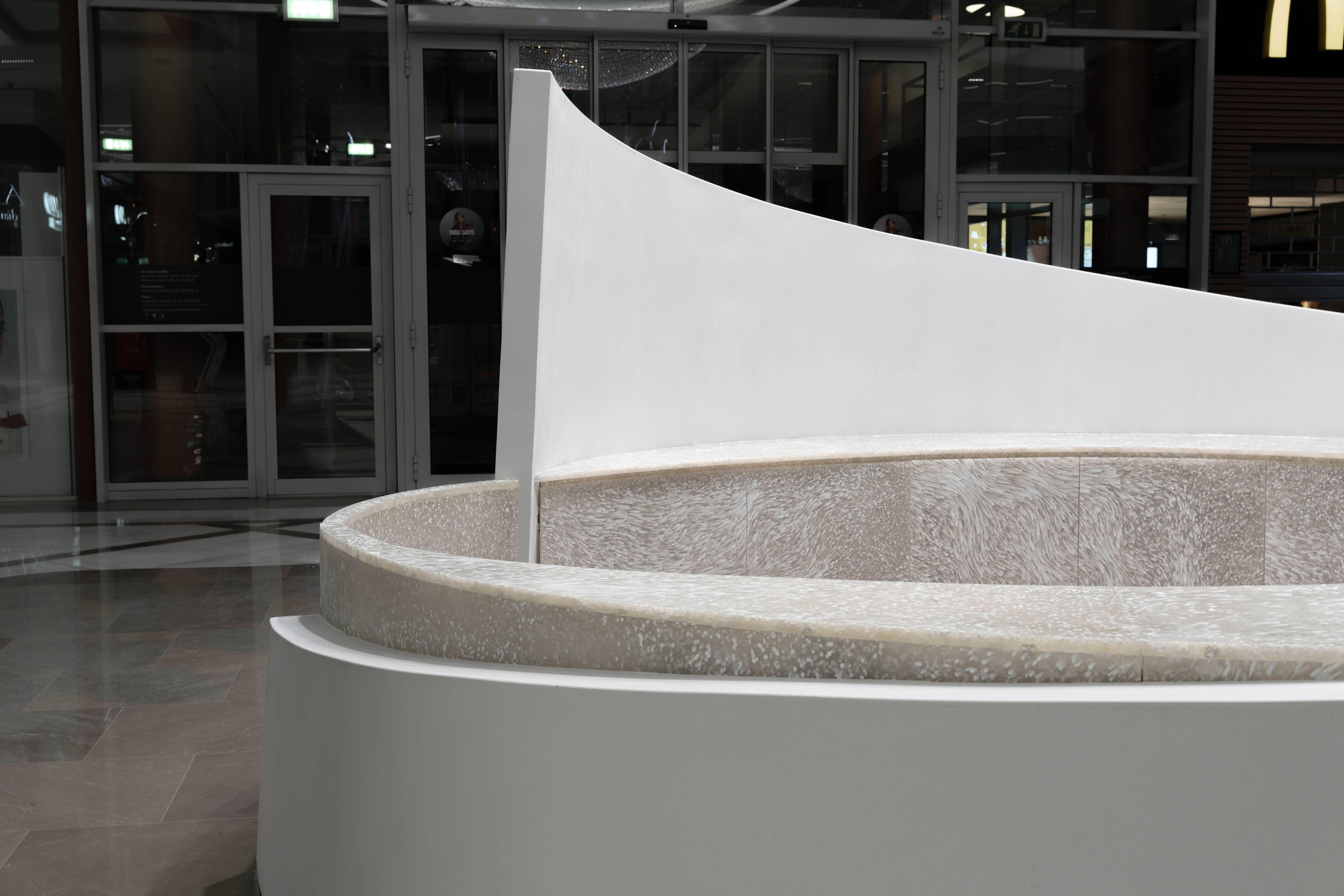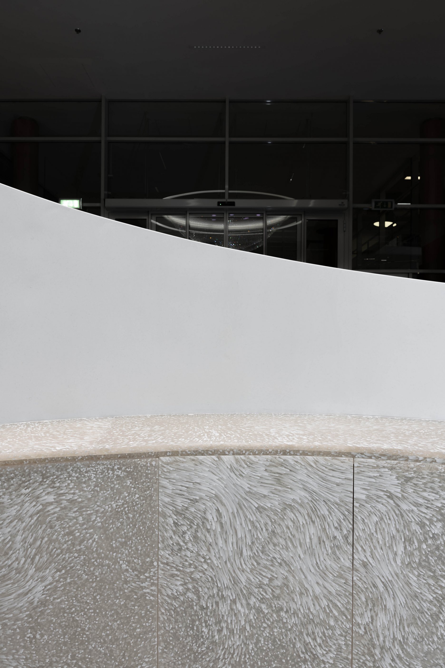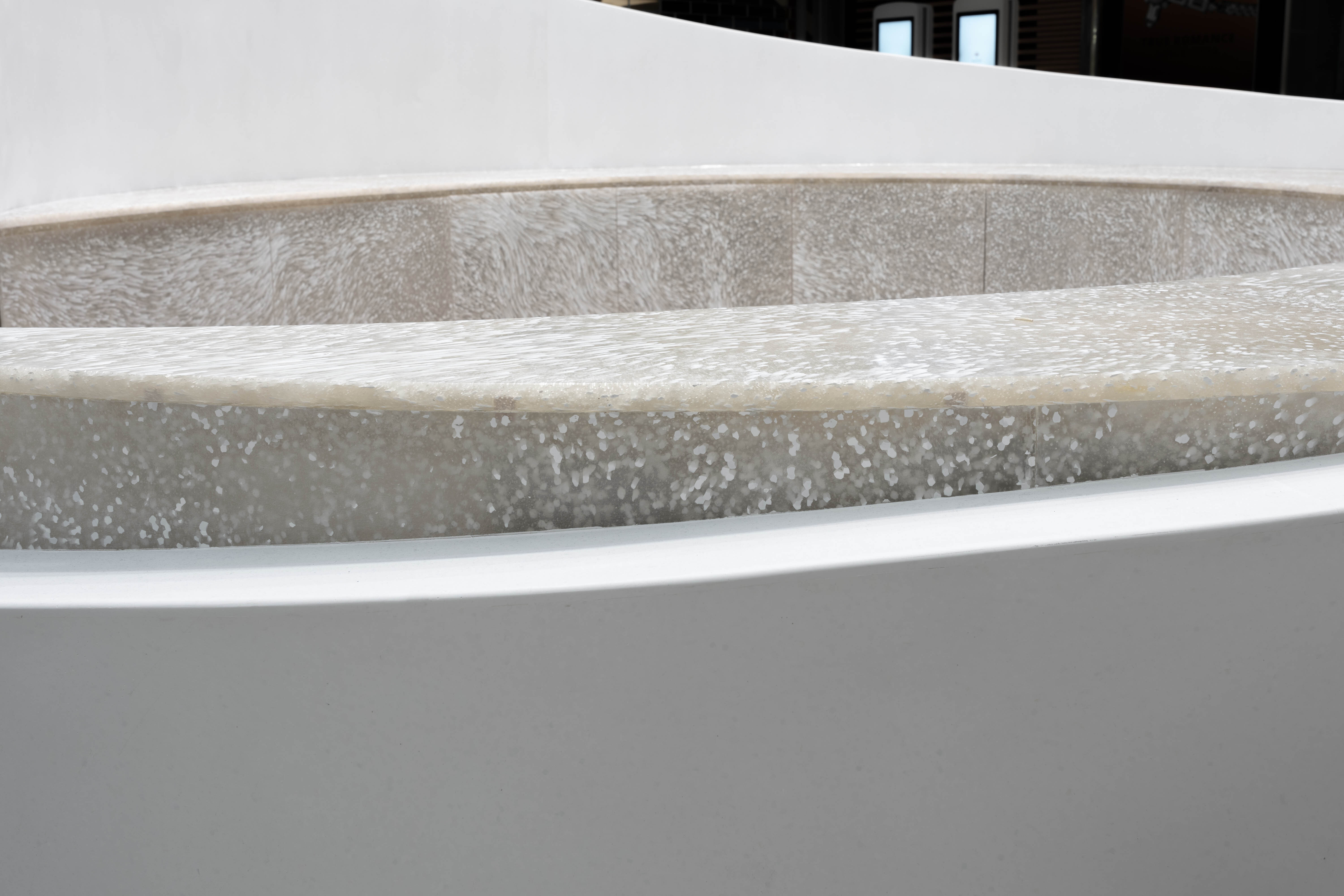 Realizácia využíva vlastnosti a estetiku materiálu so zapracovanými recyklovanými granulátmi.