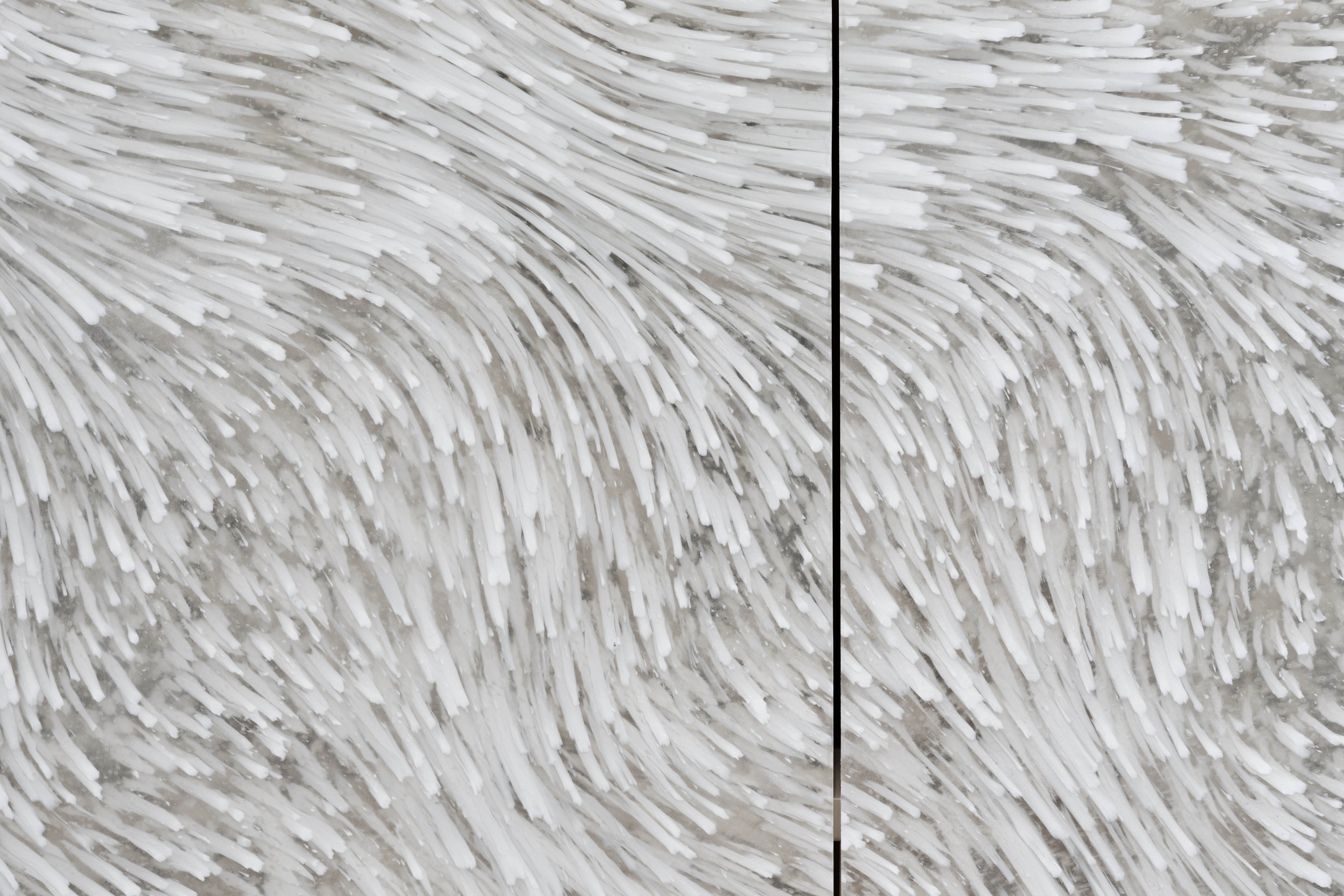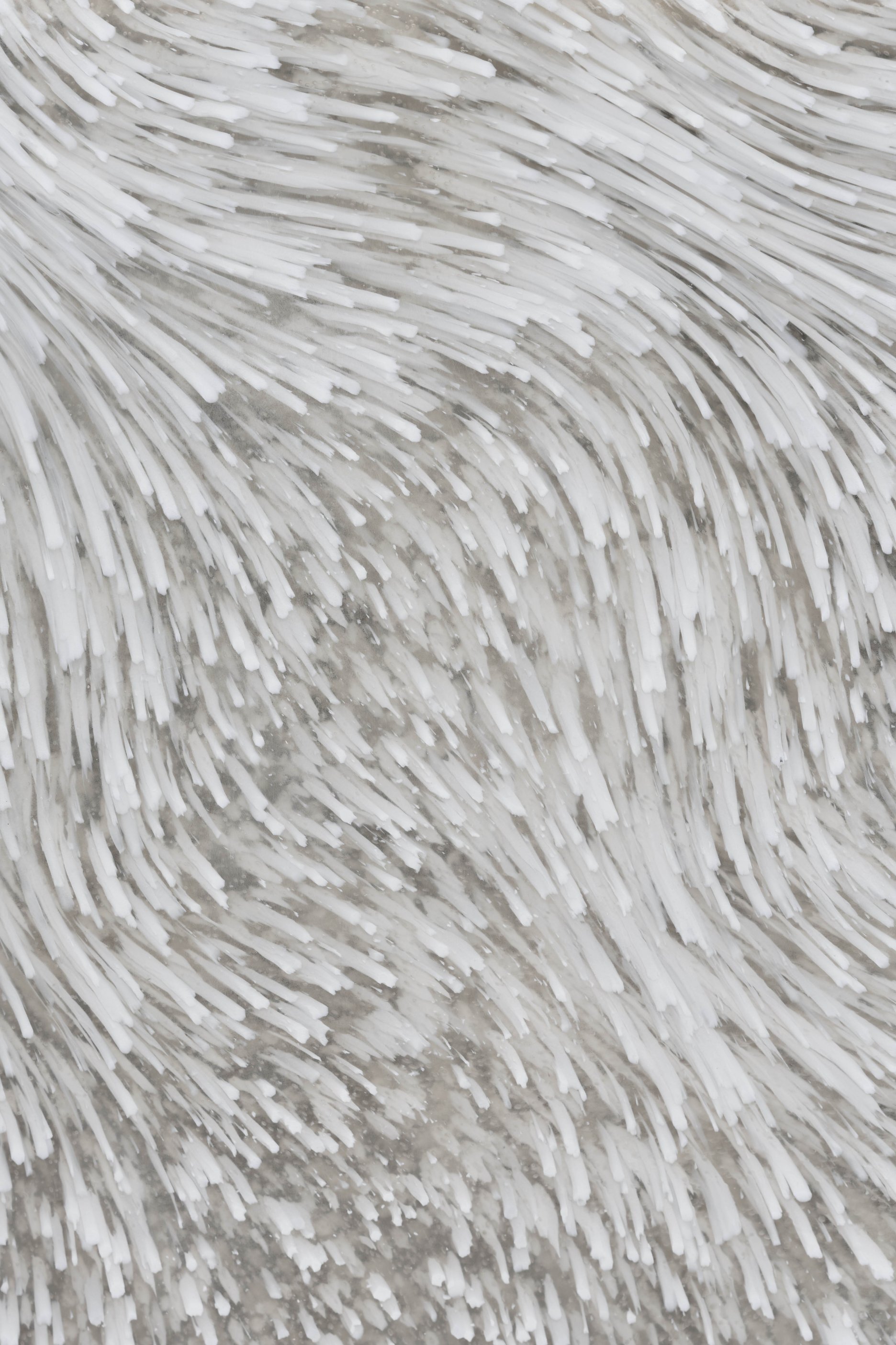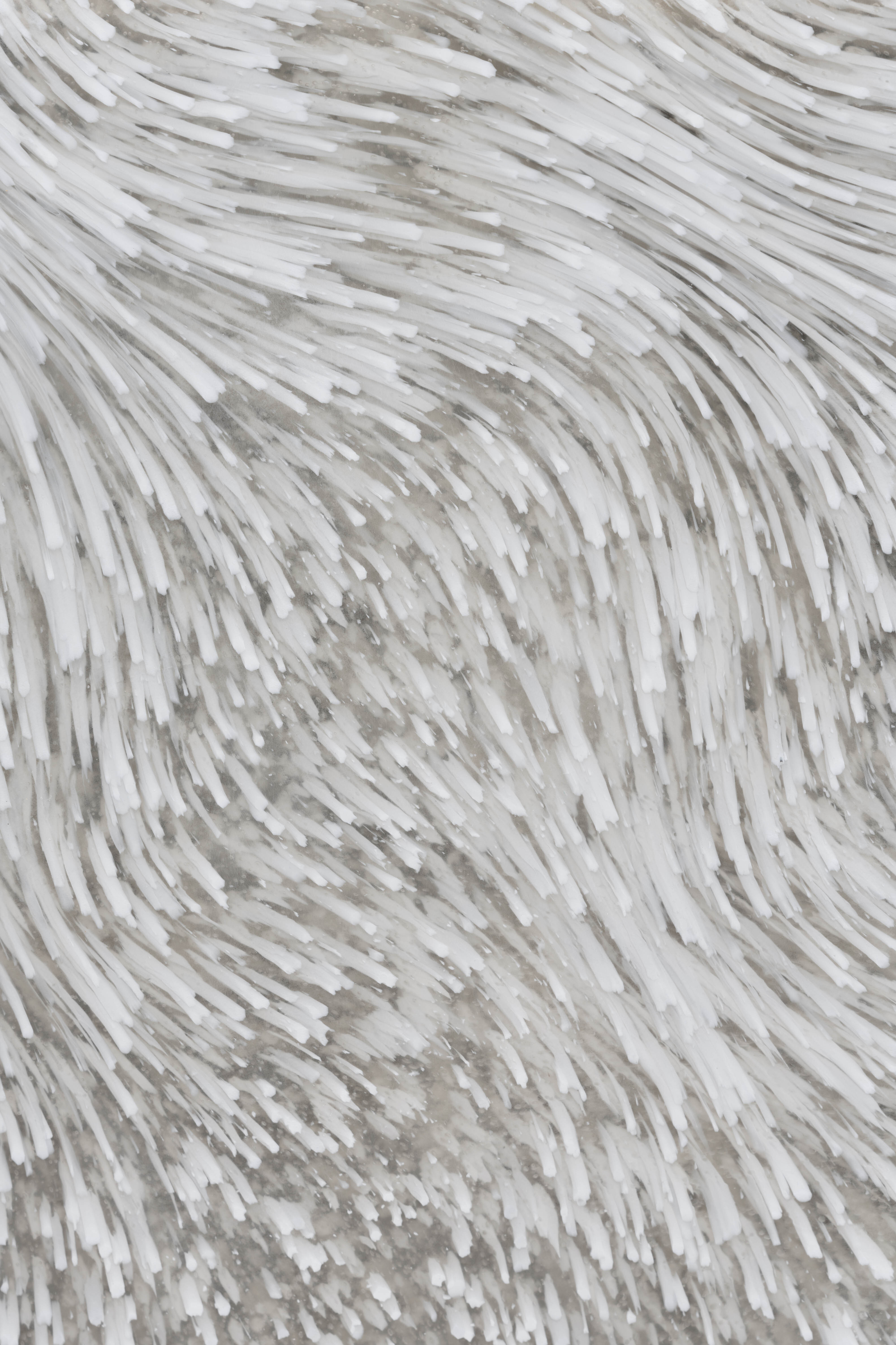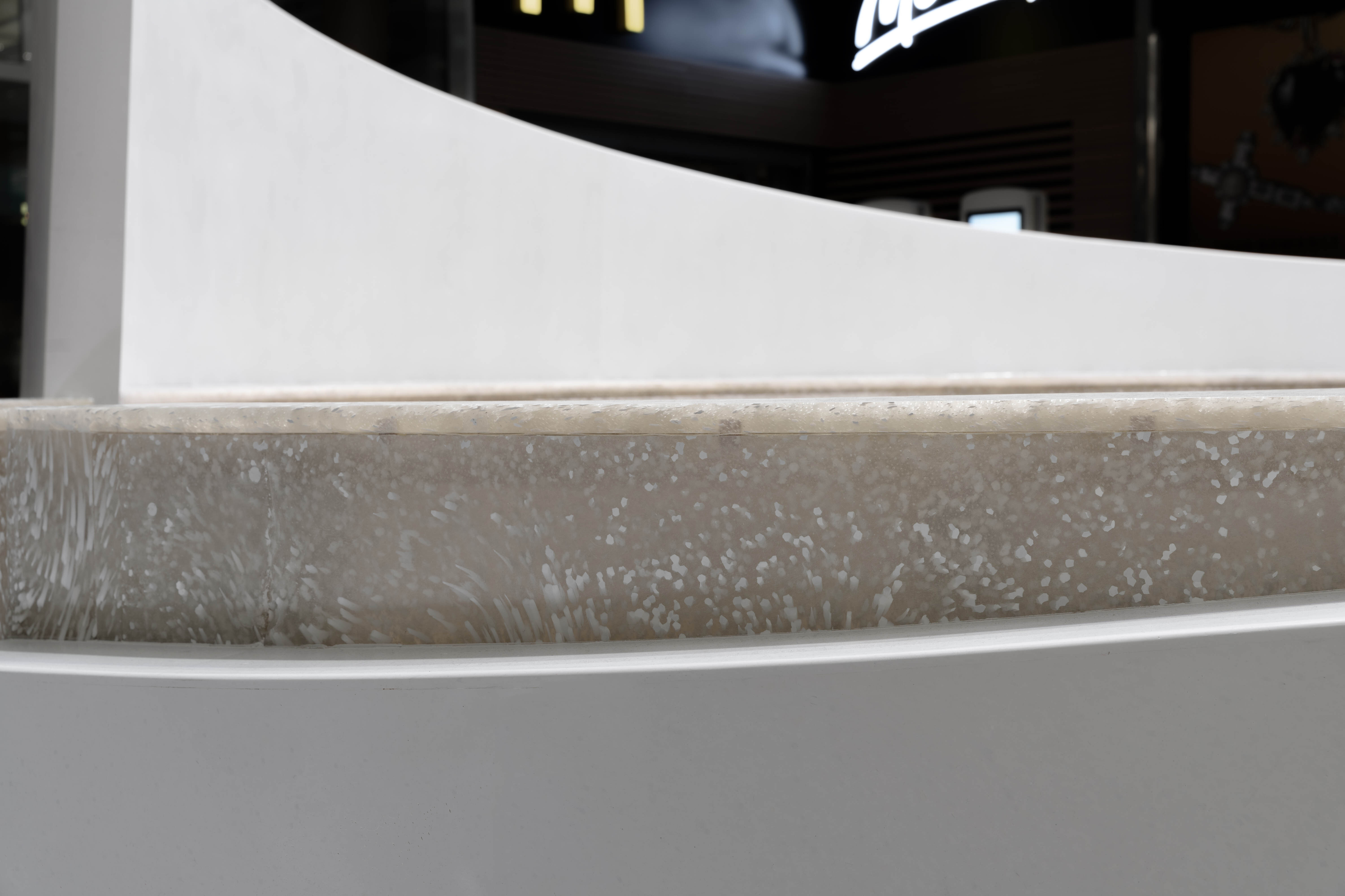 Charakter materiálu prezentuje čiastočne transparentná, plne translucentná tvrdá hmota s efektne zapracovanými recyklovanými granulátmi – v tomto prípade čisto bielymi. Štruktúrou je materiál podobný živicovému „terazzu“, avšak s prvkami tiahlych farebných žíl pripomínajúcich mramorové, alebo ónyxové dekorovanie.