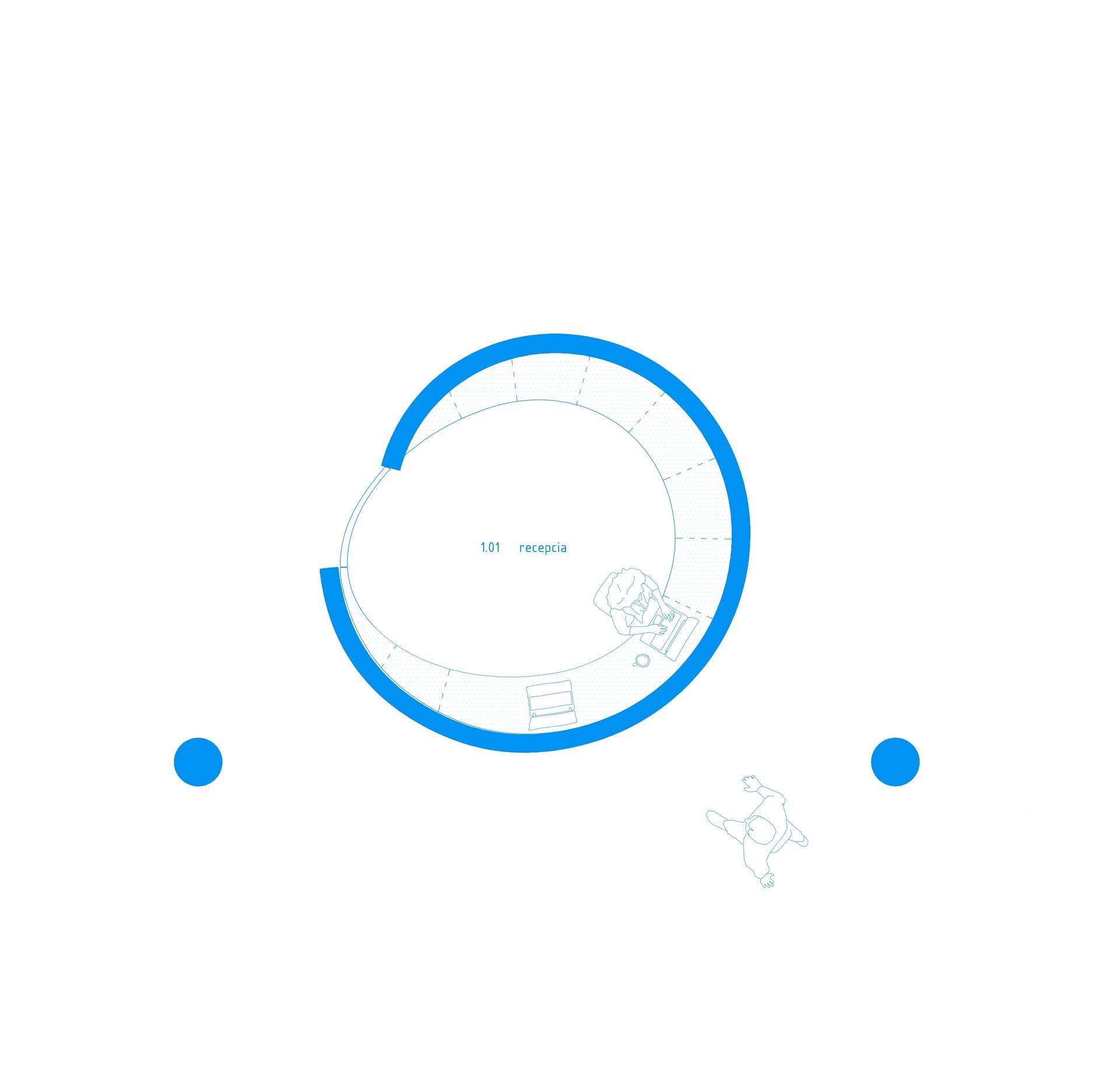 Autori sa pri návrhu rozhodli pre organický tvar s kruhovitým pôdorysom. Infostánok sa skladá z dvoch hmôt – plášťa (krytu) a pracovného pultu. Plášť je stvárnený ako postupne klesajúca stena, kónicky naklonená a jemne sa stáčajúca do špirály. Má nepriehľadnú bielu farbu. Obopína pracovný pult prvého kontaktu, ktorý je nositeľom funkcie a je spracovaný zo zaujímavého translucentného recyklovaného materiálu. Obidve hmoty sú materiálovo odlíšené, no tvoria jednotný celok.