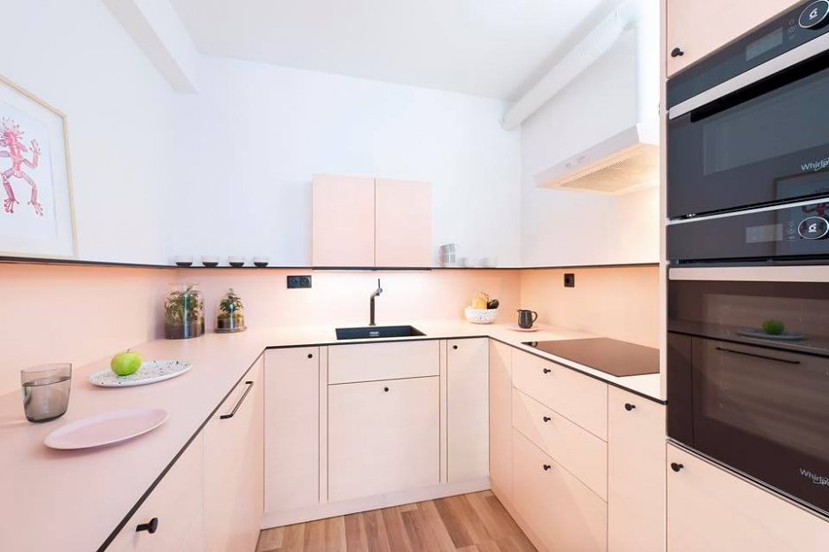Kuchyňa sa v rámci dispozície nachádza v malom výklenku v obývačke. Výklenok je najvzdialenejším miestom od okna a preto je pomerne tmavý. Priestor je limitovaný svojou veľkosťou a tvarom.