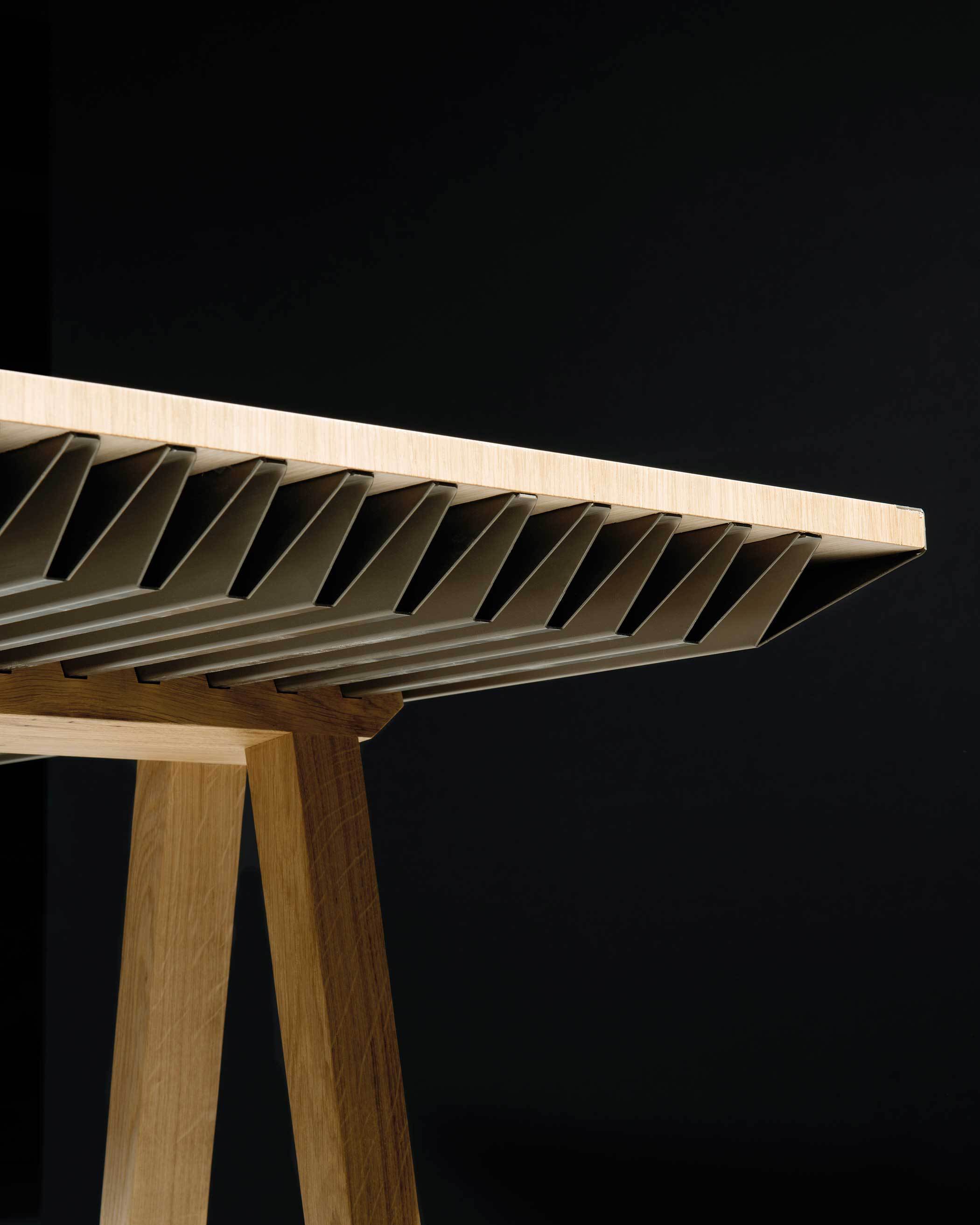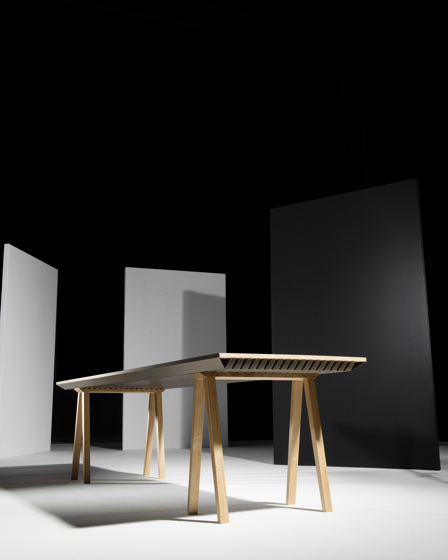 Prvým kusom z ich produkcie je dubový masívny stôl s integrovaným tepelným výmenníkom z anodizovaného hliníka na jeho spodnej strane.