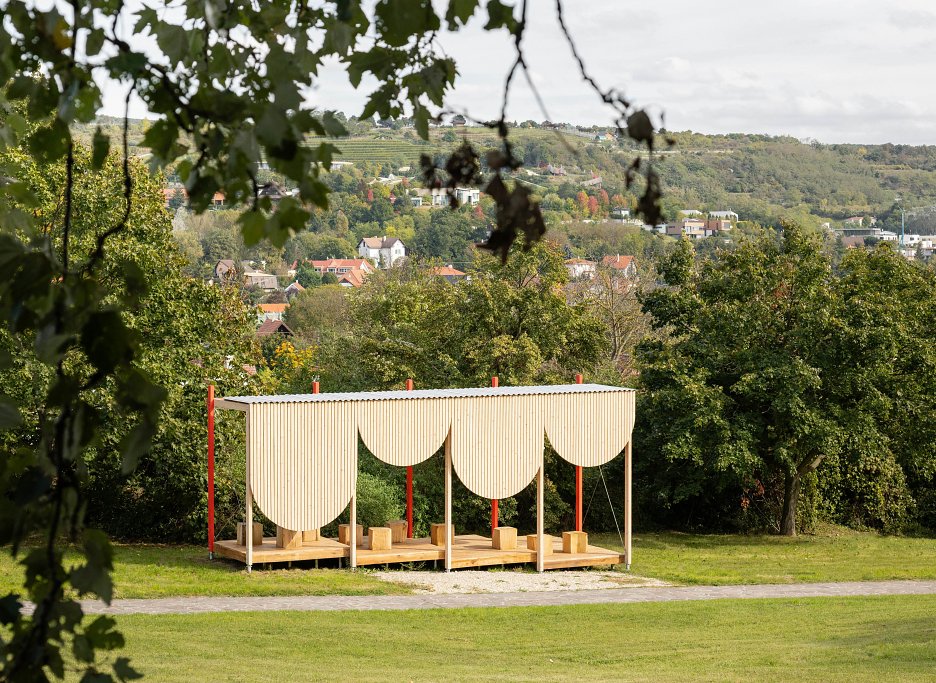 Forma pavilónov výrazne odráža ich funkciu. Väčší z pavilónov reaguje na svahovitosť terénu stupňovitým sedením. Zaužívaná forma stupňovitého sedenia odráža primárnu funkciu pavilónu ako malého divadielka, priestoru pre koncert, čítanie...Vytvára javisko / hľadisko. “Oponu” tvoria vertikálne lamely z južnej strany, ktoré zabezpečujú tieň v letných mesiacoch.