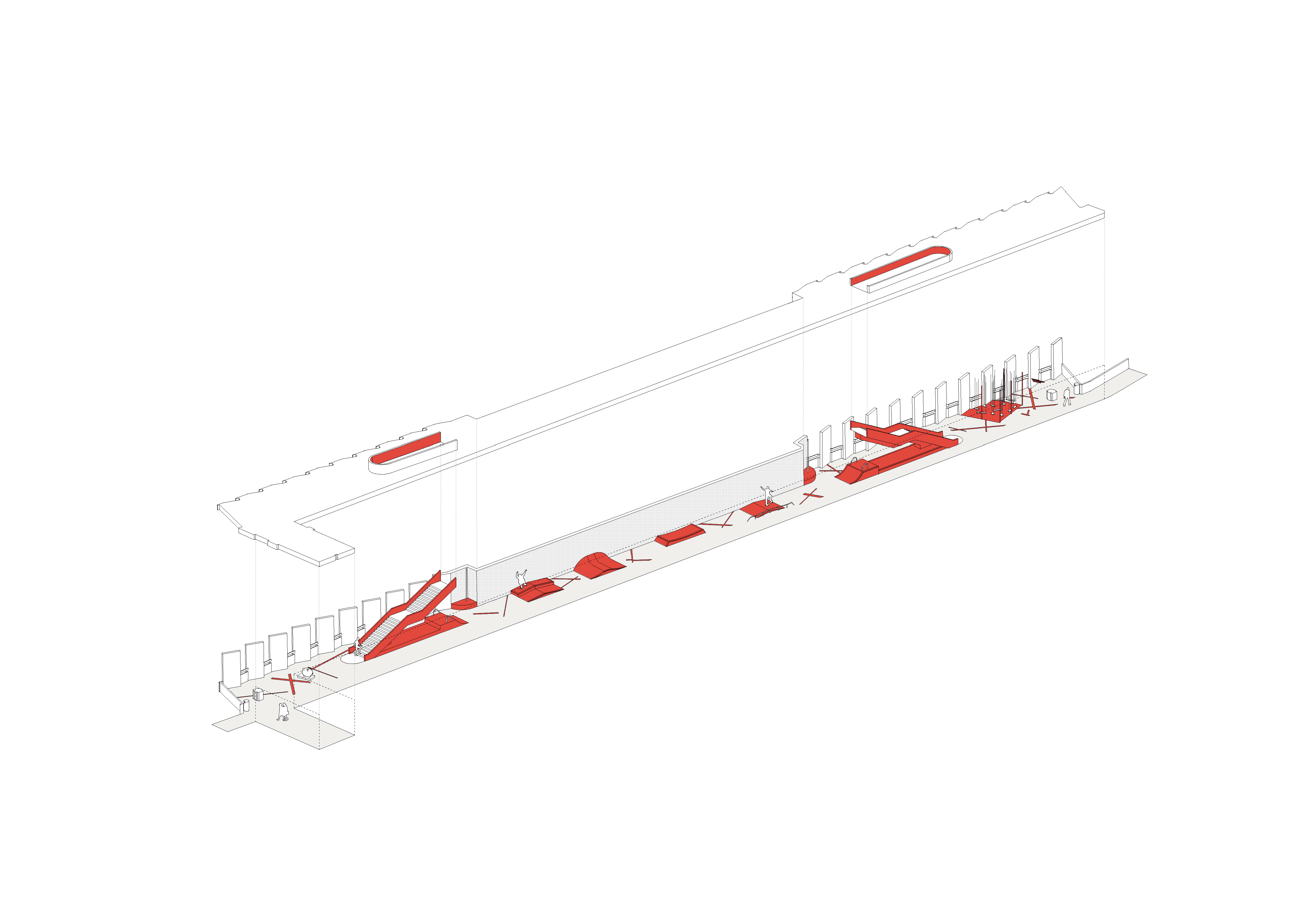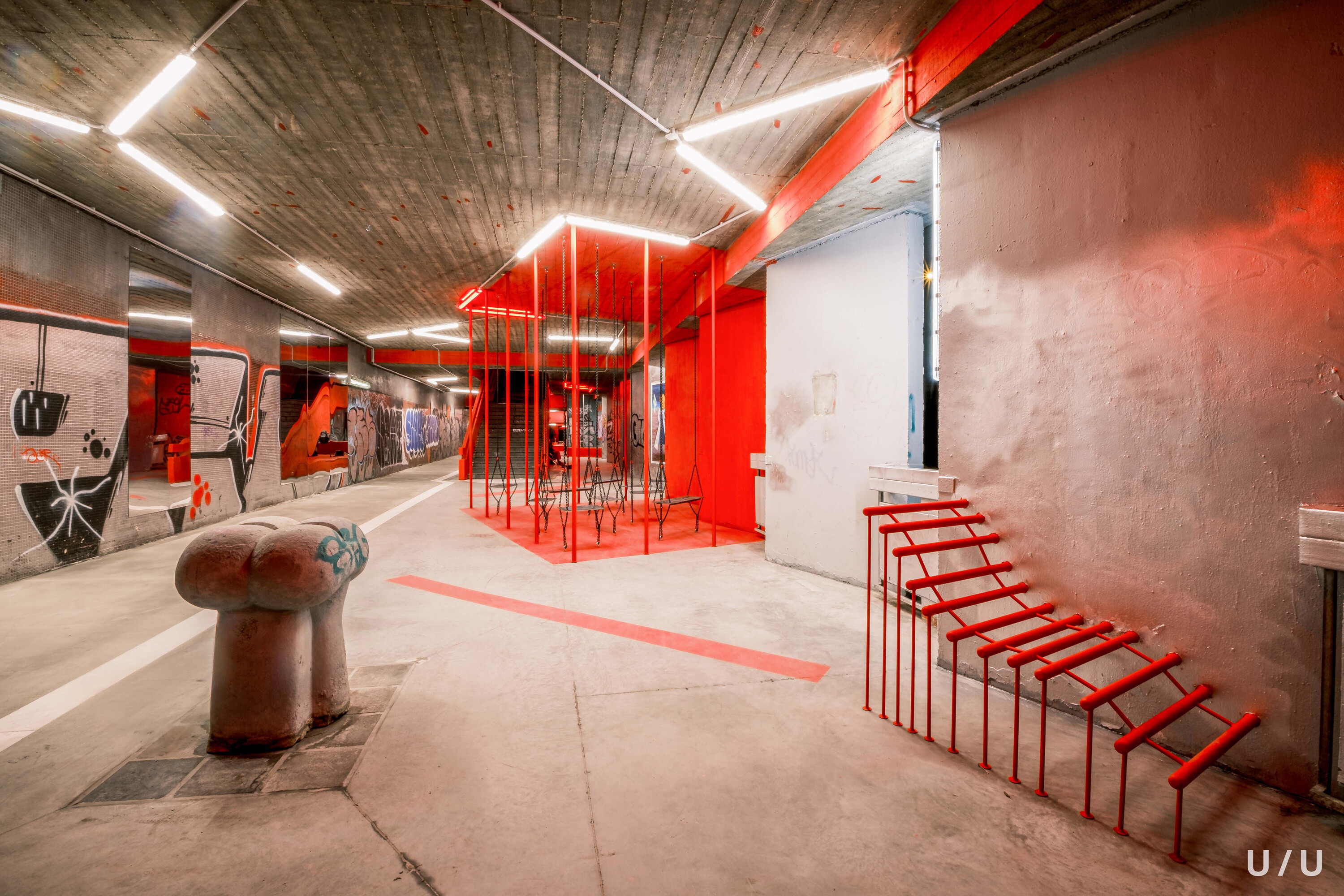 V podchodech můžete najít streetbalový koš s tribunou, taneční prostor se zrcadlem, pole dance tyče, překážky pro freestyle sporty, boulder, workout a pouliční galerii. Důraz je tentokrát kladen na skate, bmx a koloběžkáře, který na krytých a osvětlených místech často vhodné prvky pro freestyle jízdu nemají. Element vody - Vltavy a její lineární tok se stal inspirací našeho návrhu. Noční lázně nezávislé na ročním období, počasí a denní době. Prostor je navržen tak, že i za plného provozu umožňuje zachovat transportní funkci podchodu pro chodce a cyklisty.