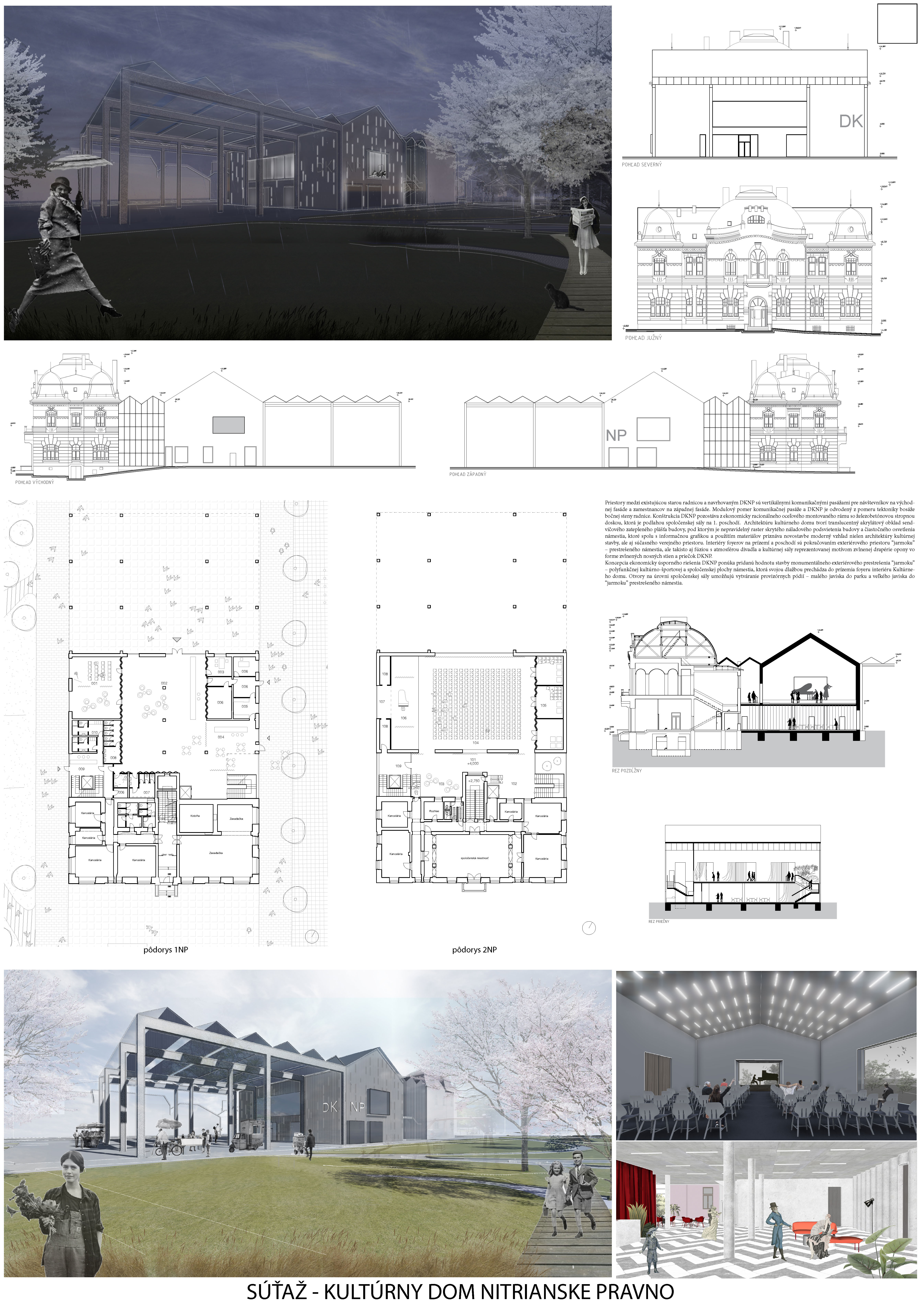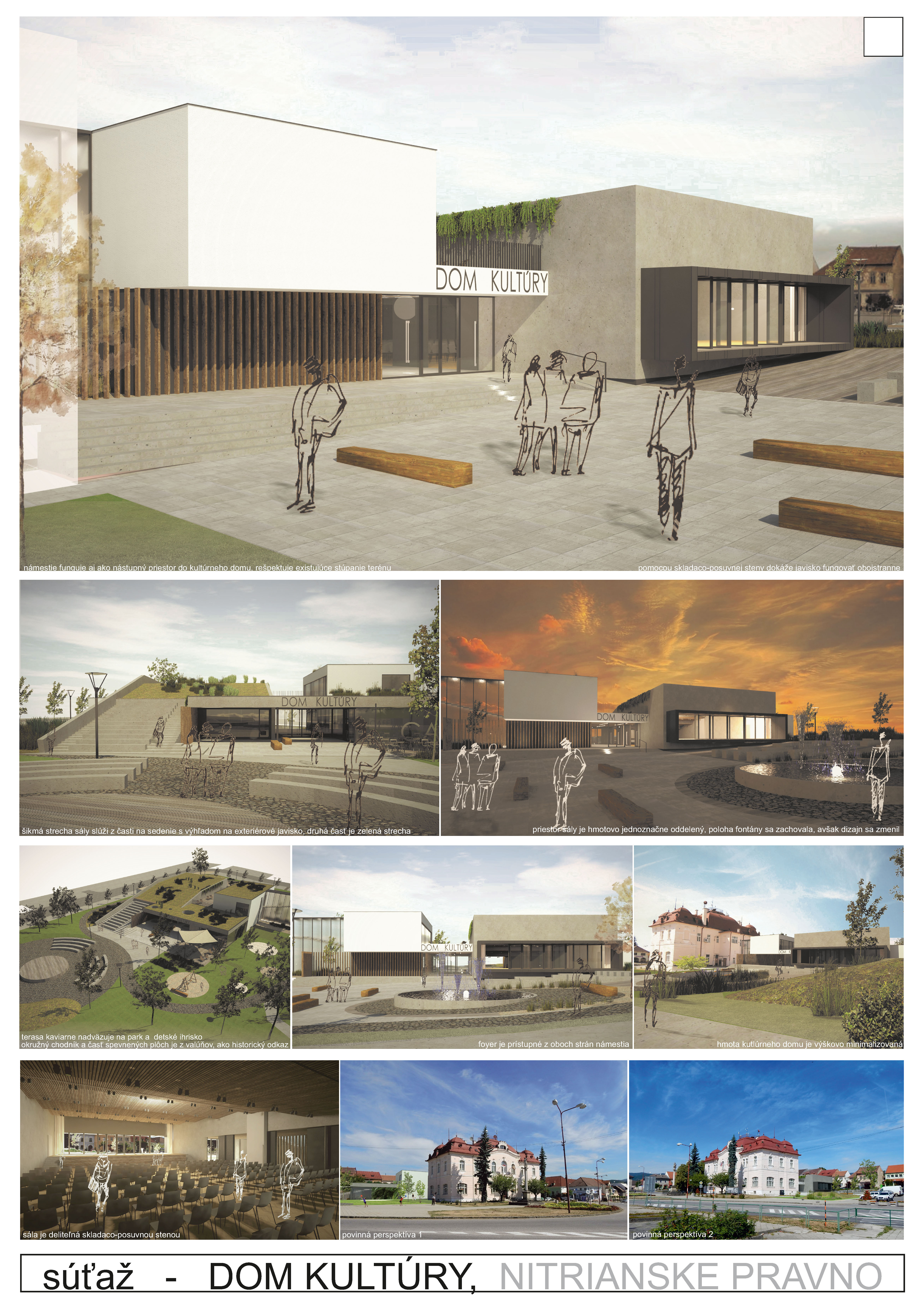 Koncepcia návrhu jednopodlažnej budovy vyžaduje veľkú zastavanú plochu, niektoré funkcie môžu byť aj v suteréne. Vhodne orientovaný rozptylový priestor s odsadením od budovy obecného úradu vytvára predpoklad na veľkorysý nástup do KD. Vyosenie hlavného vstupu cez nárožie škodí hlavnej orientácii nástupu. Komunikačné prepojenie s budovou obecného úradu je nejednoznačné pre spojenie funkcií na slávnostné udalosti v obidvoch budovách. Hlavná sála s valbovou strechou aj z interiéru vytvára jedinečný pocit priestoru, zároveň otvorená sála do exteriéru môže narúšať svetelnosť a intimitu sály z úrovne pešiaka. Dynamické línie presklených diagonálnych otvorov v stenách narúšajú vizuálny pocit pri pohľade na fasády.