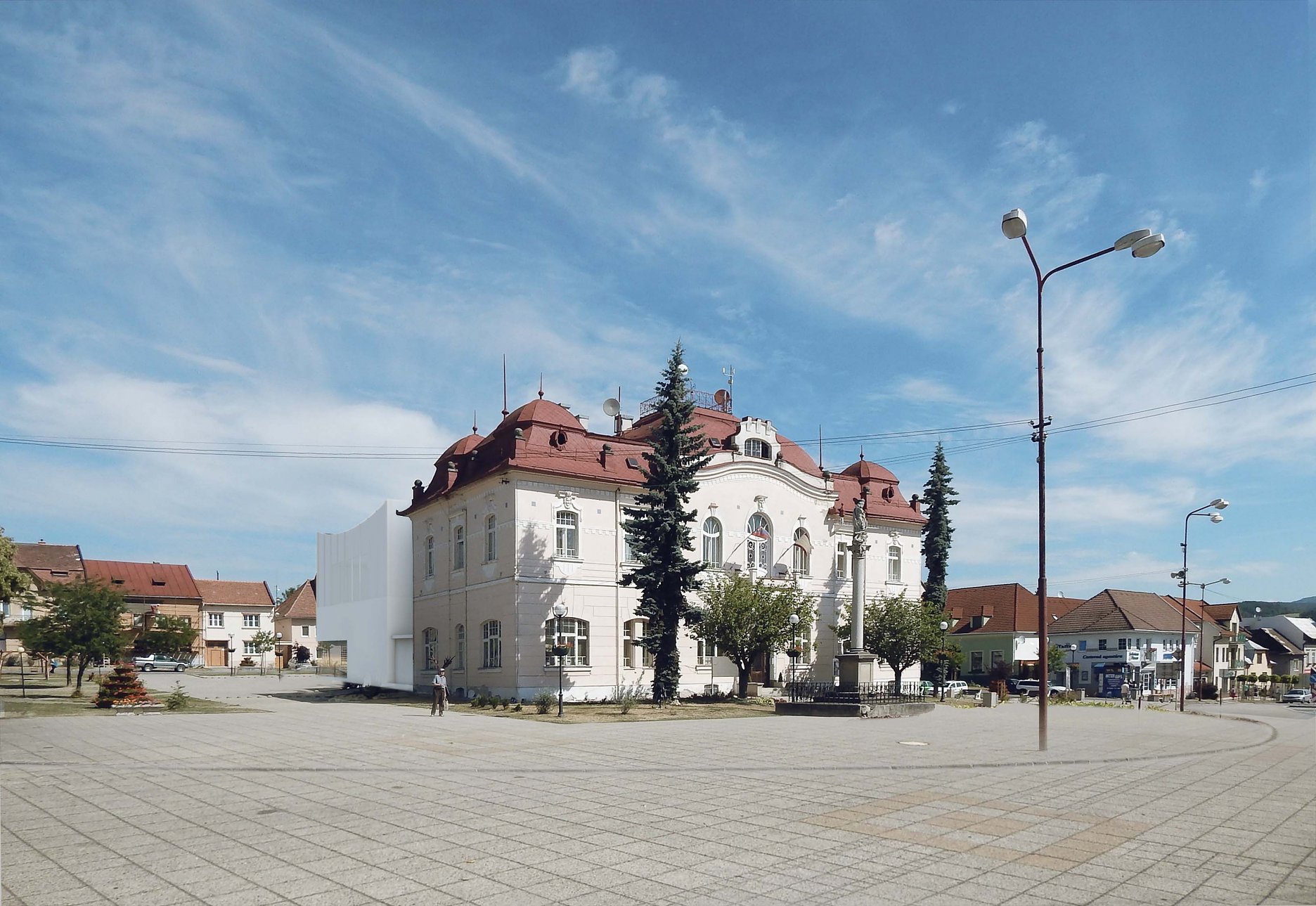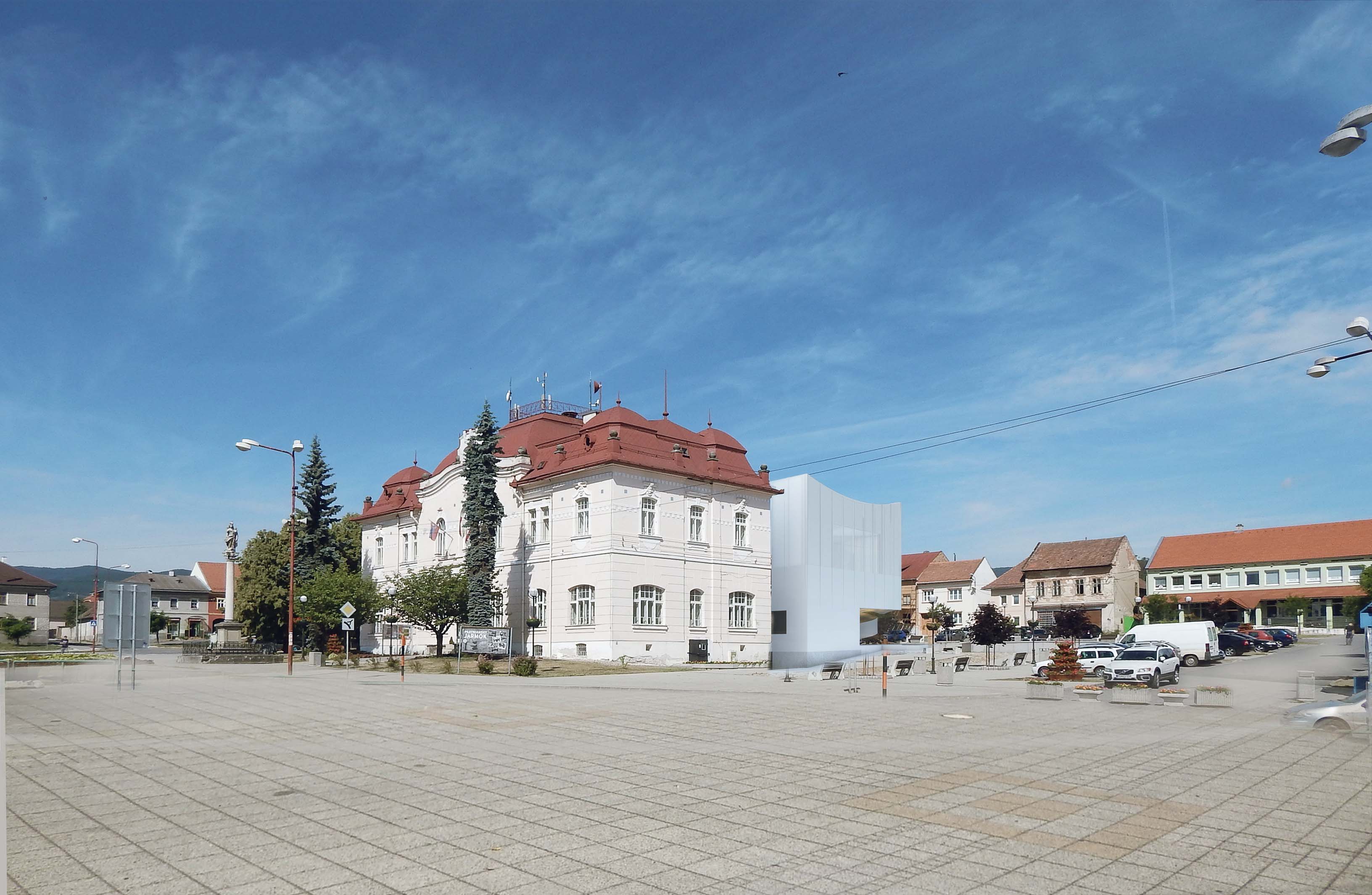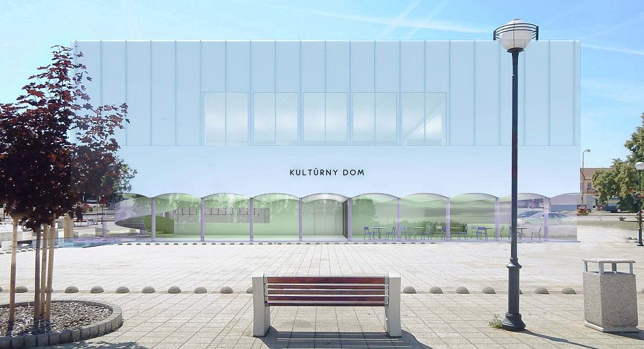 Novostavba kultúrneho domu je prepojená s existujúcou budovou obecného úradu zo severozápadnej strany. Navrhovaný prízemný objekt s prevýšeným priestorom hlavnej sály historickej architektúre nekonkuruje, ale svojím objemom ju vhodne dopĺňa. Navrhovaná kolonáda a nádvorie , do ktorého sú orientované vstupné priestory kultúrneho domu, vytvárajú samostatné „námestie v námestí„, ktoré pôsobí vo vzťahu k pôvodnému historickému námestiu pomerne uzavreto. Z hľadiska urbanistického riešenia absentuje otvorenejšie komunikačné prepojenie medzi severovýchodnou a juhozápadnou časťou námestia