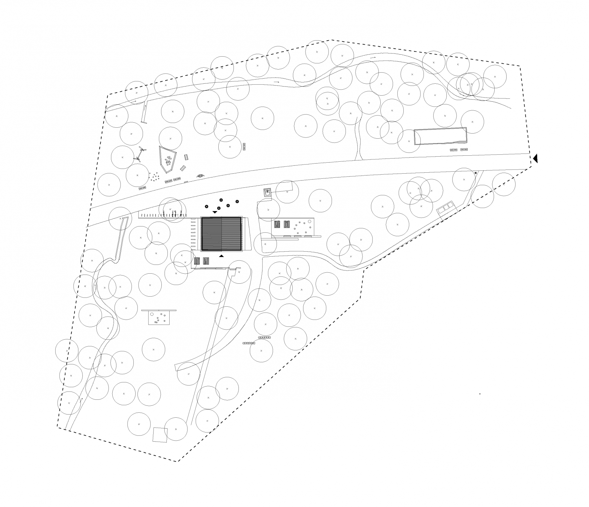 Pohyb v areáli je organizovaný logicky usporiadanými cestami s ohľadom na prekonávanie výškových rozdielov terénu, pobytové plochy sú umiestnené pri centrálnej budove. Areál dopĺňajú ohniská, drevený mobiliár a interaktívne prvky pre možnosť odpočinku a trávenia voľného času. V prípade všetkých prvkov kladieme dôraz na využitie prírodných materiálov.